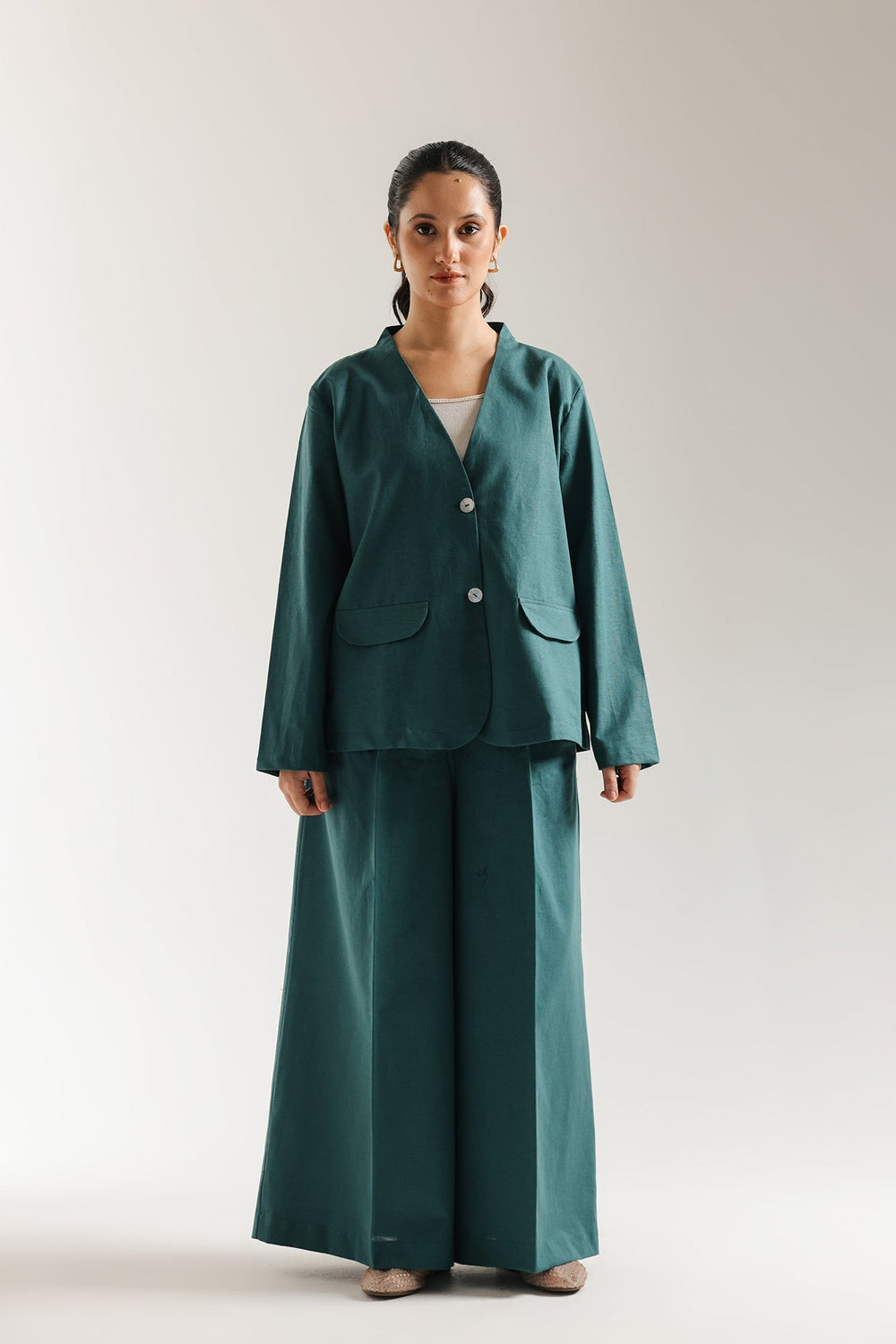 Elevate your wardrobe with this sophisticated co-ord set, expertly designed for modern elegance. The V-neck shirt features refined tailoring with two functional front pockets and a two-button closure, offering both style and practicality. Paired with wide-leg trousers that provide a flattering silhouette and comfortable fit, this ensemble delivers versatile sophistication suitable for professional sittings or elevated casual occasions.