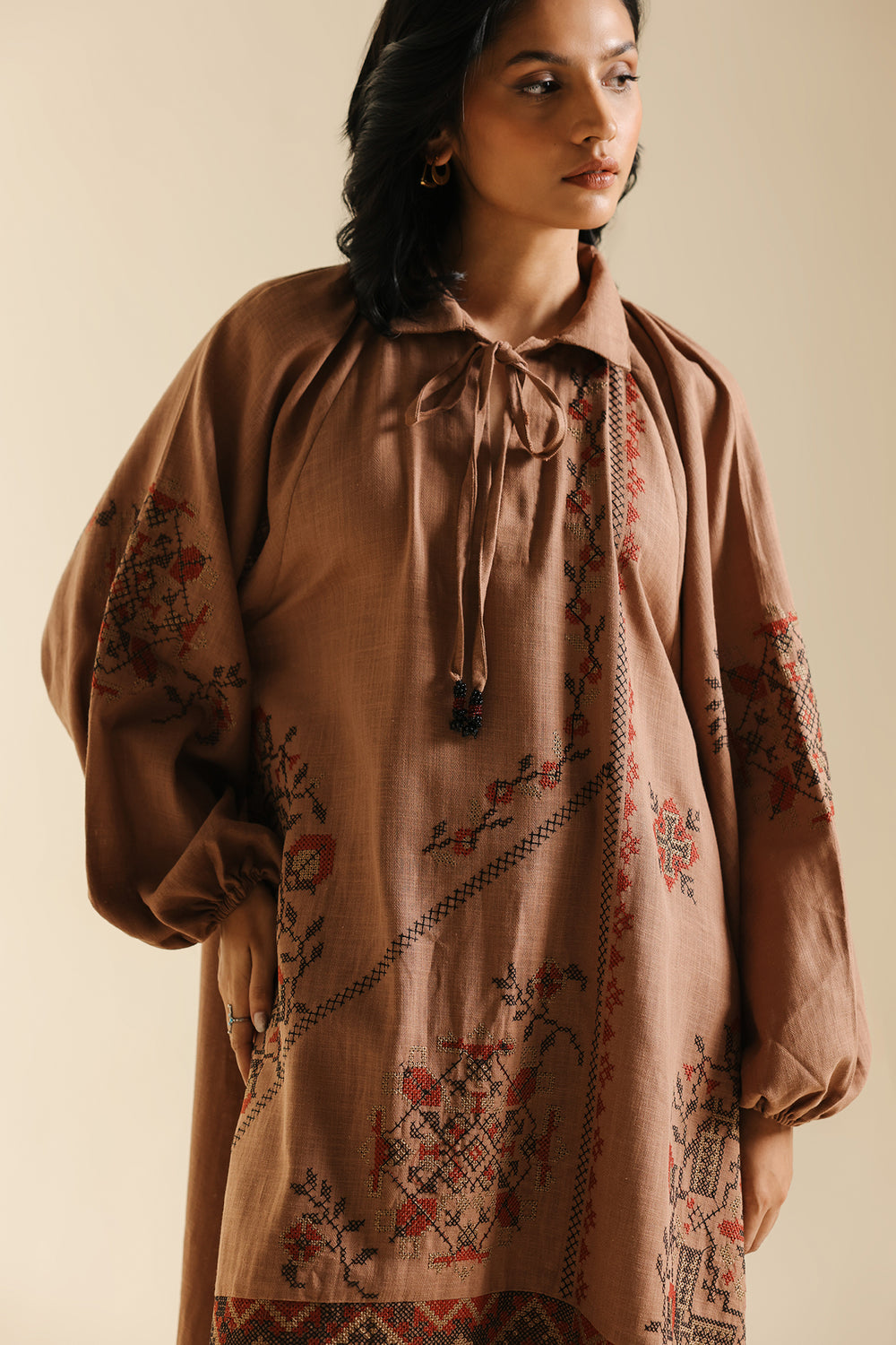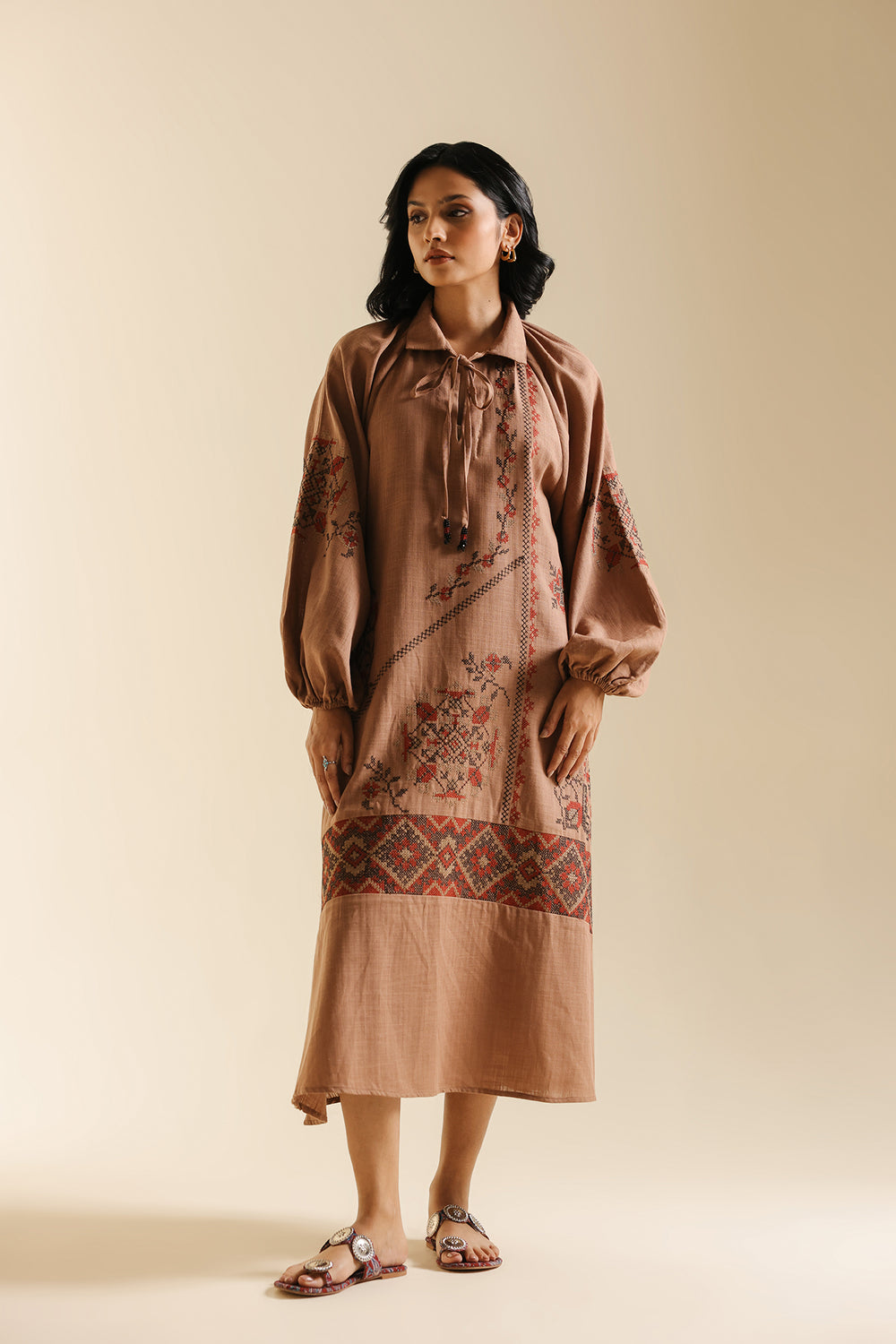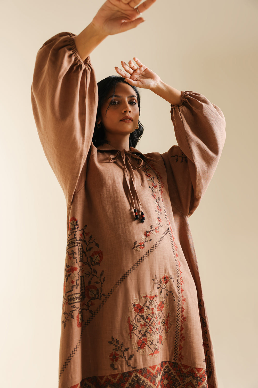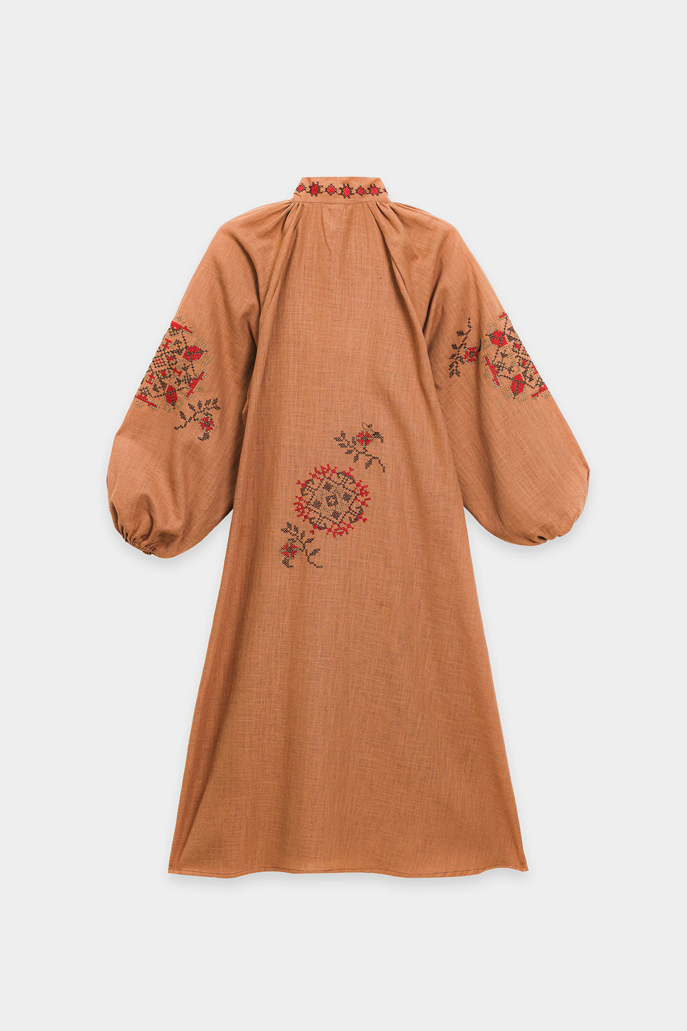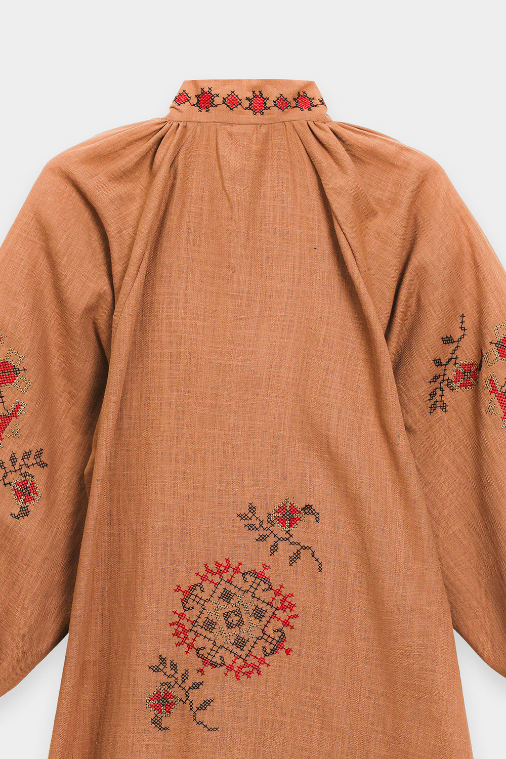 This exquisite dress captures the essence of Eastern European heritage with its refined aesthetic and meticulous artisanal detailing featuring a distinctive tie-closure V-neckline reminiscent of traditional peasant wear. Voluminous balloon sleeves with gathered cuffs provide elegant movement and silhouette. The piece is distinguished by elaborate hand-embroidered embellishments in rich reds, blacks, and earth tones—flowing floral and vine motifs grace the front and upper sleeves, while a striking geometric patterned panel adorns the hemline.