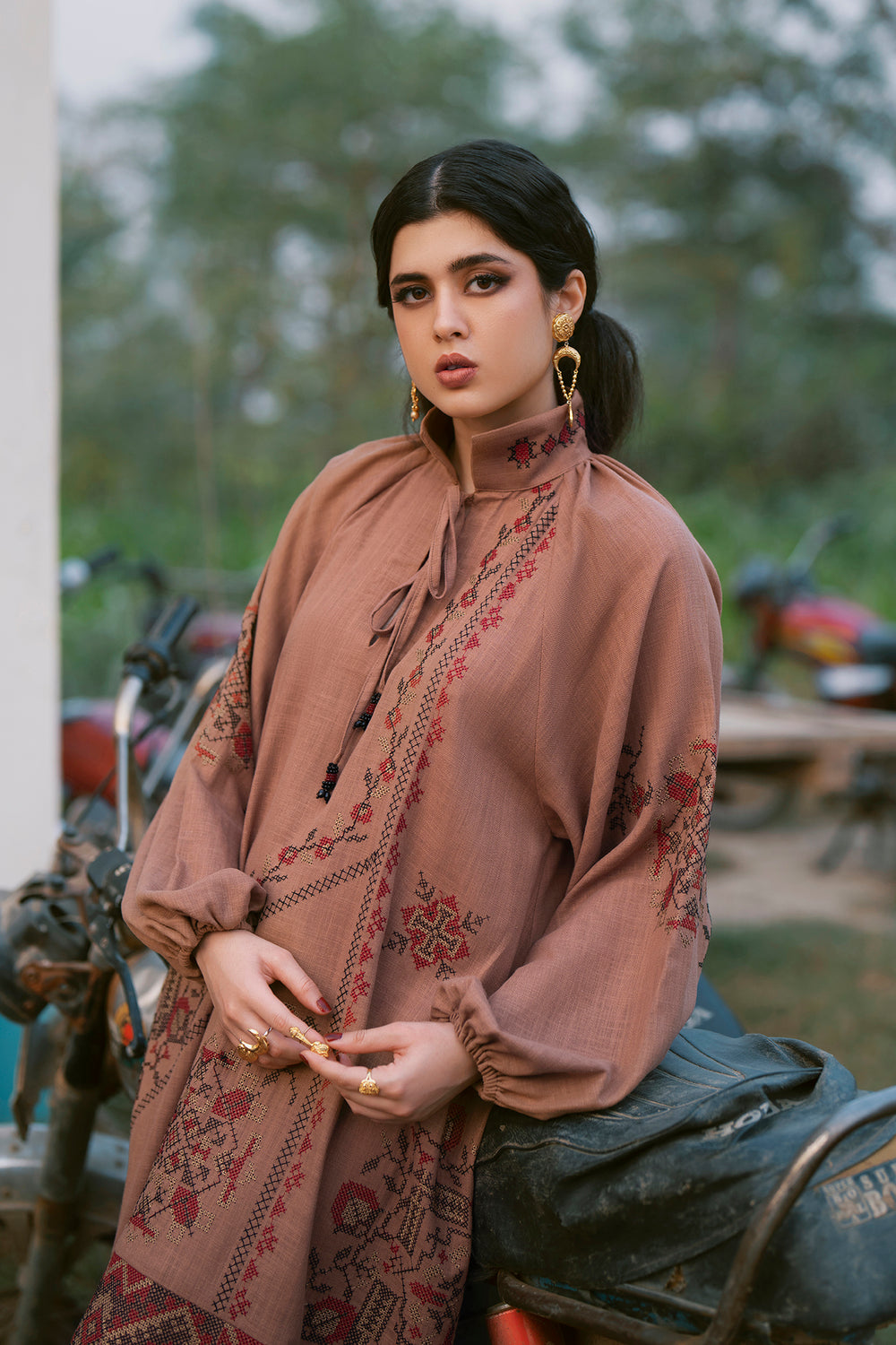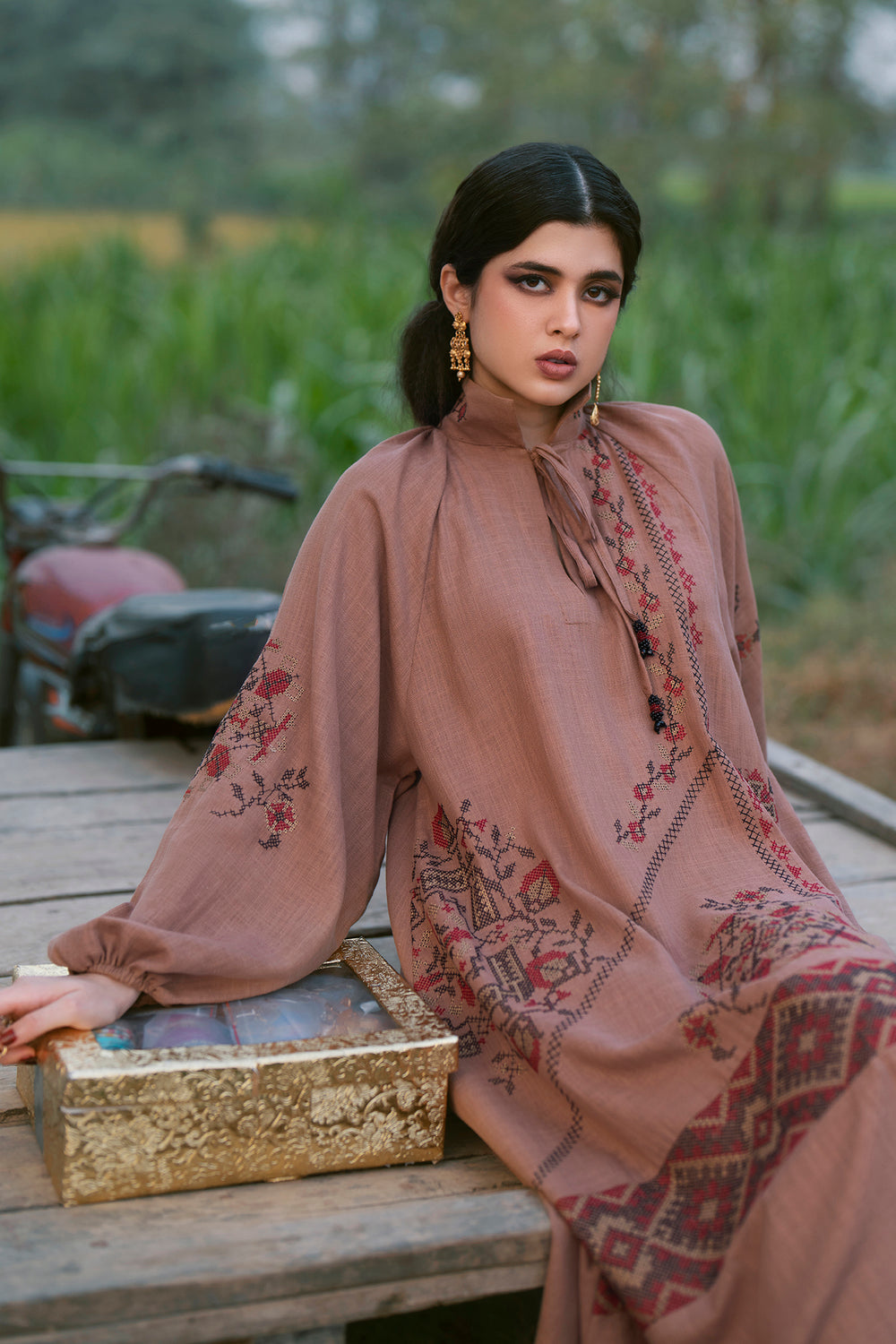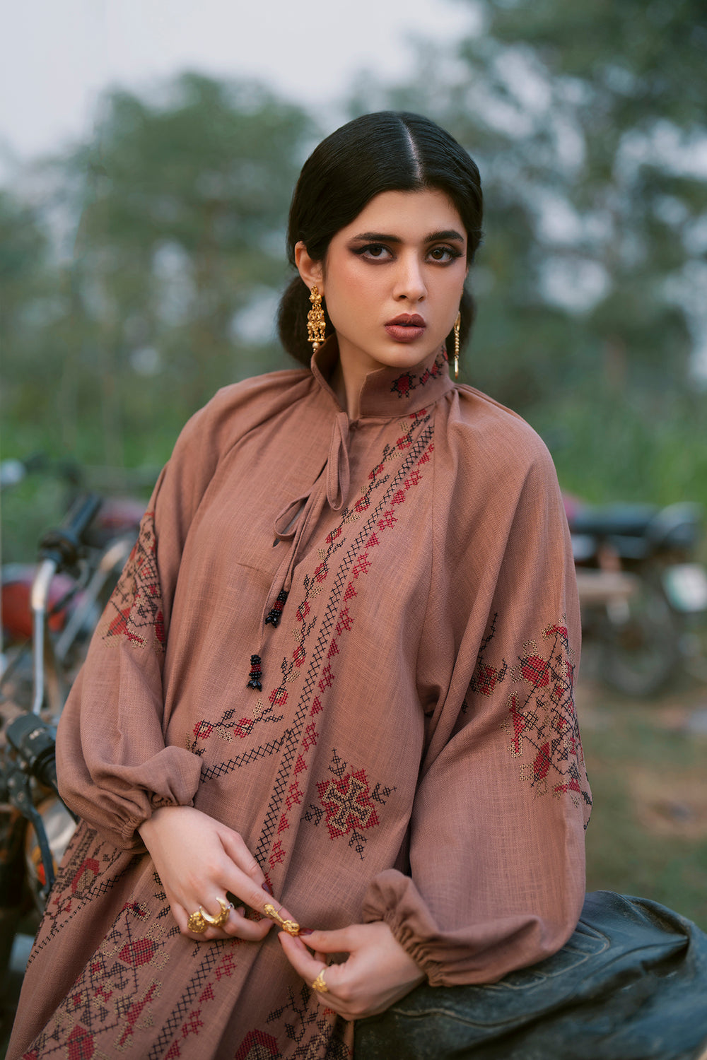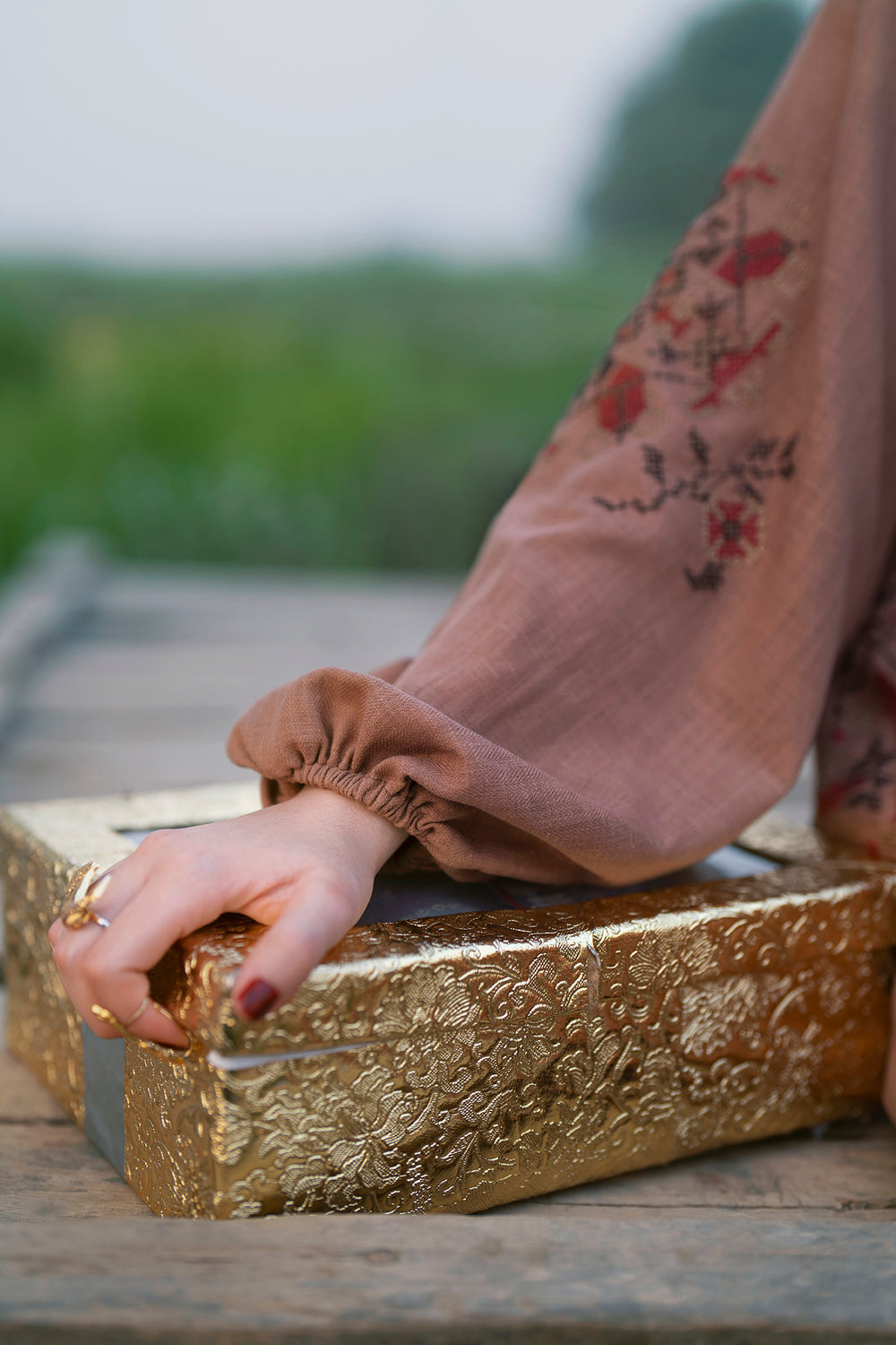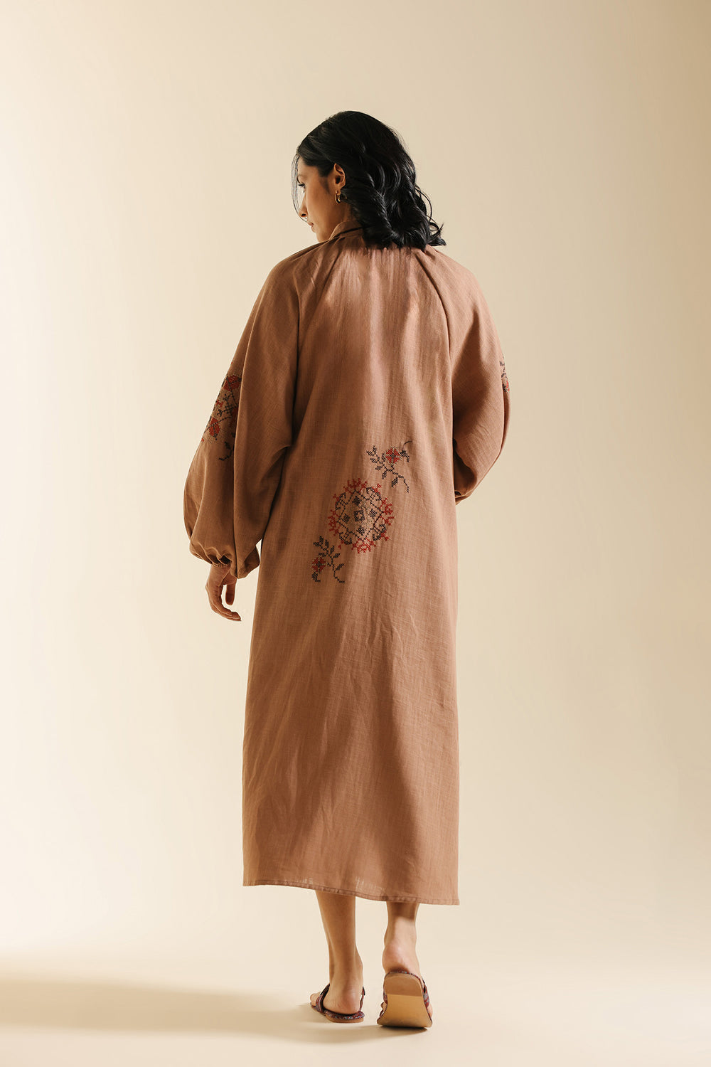 This exquisite dress captures the essence of Eastern European heritage with its refined aesthetic and meticulous artisanal detailing featuring a distinctive tie-closure V-neckline reminiscent of traditional peasant wear. Voluminous balloon sleeves with gathered cuffs provide elegant movement and silhouette. The piece is distinguished by elaborate hand-embroidered embellishments in rich reds, blacks, and earth tones—flowing floral and vine motifs grace the front and upper sleeves, while a striking geometric patterned panel adorns the hemline.