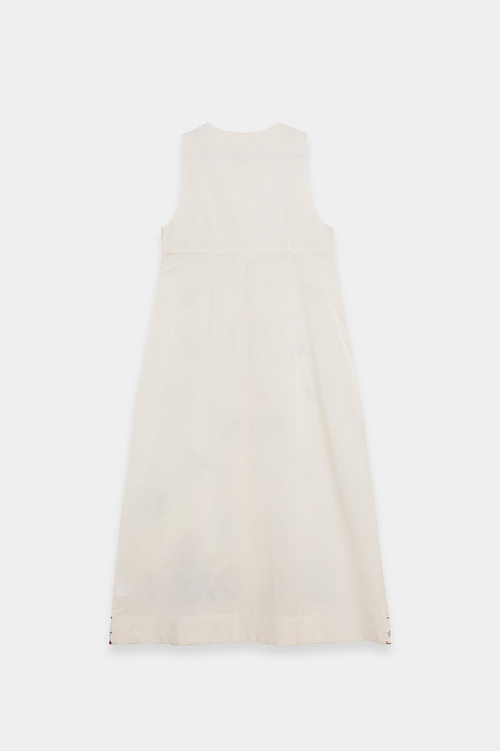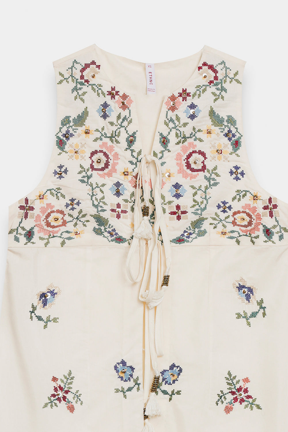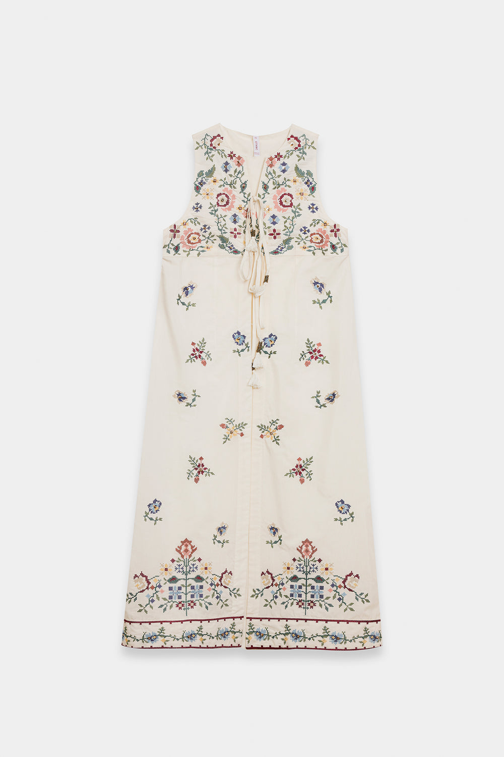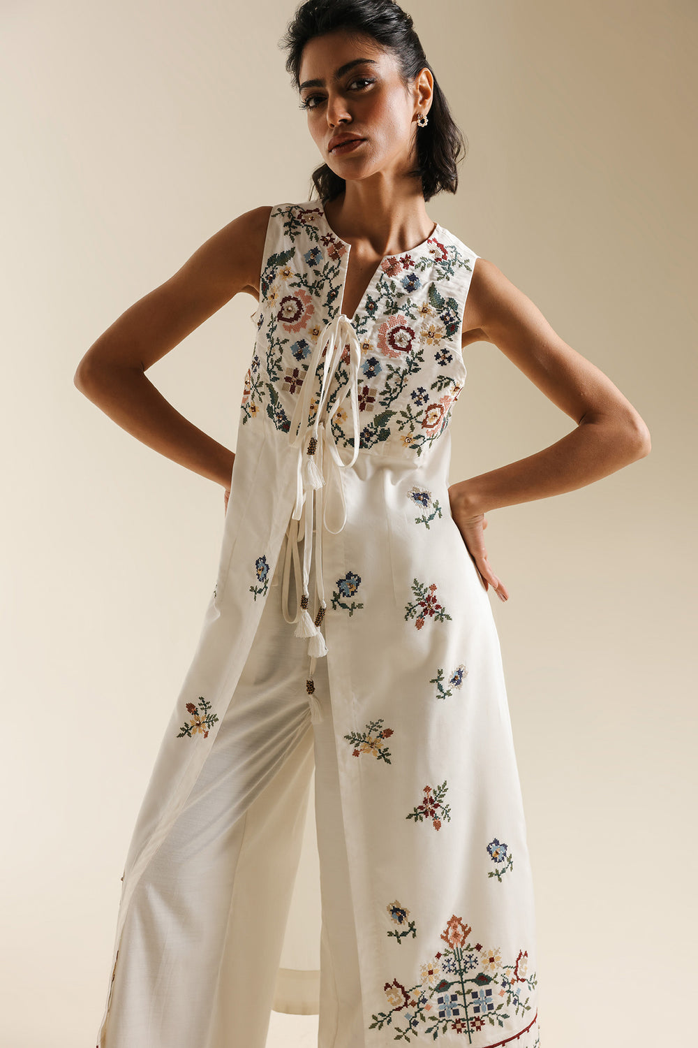 Exude an air of ethereal grace in this sleeveless, floor-length white dress, designed with a flattering long-line silhouette. The piece features a delicate V-neckline with a dainty tie-front detail, leading into a bodice adorned with a rich tapestry of colorful floral embroidery in shades of rose, teal, and gold. Small, intricate floral sprays are artfully scattered across the length of the dress, culminating in a bold, multi-colored embroidered garden at the hemline. This ensemble offers a perfect blend of summery freshness and artisanal sophistication.