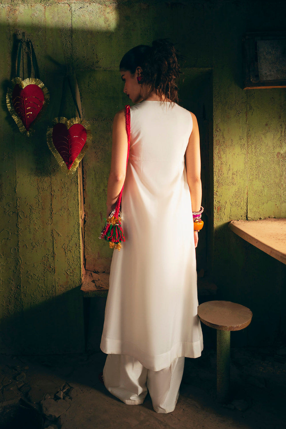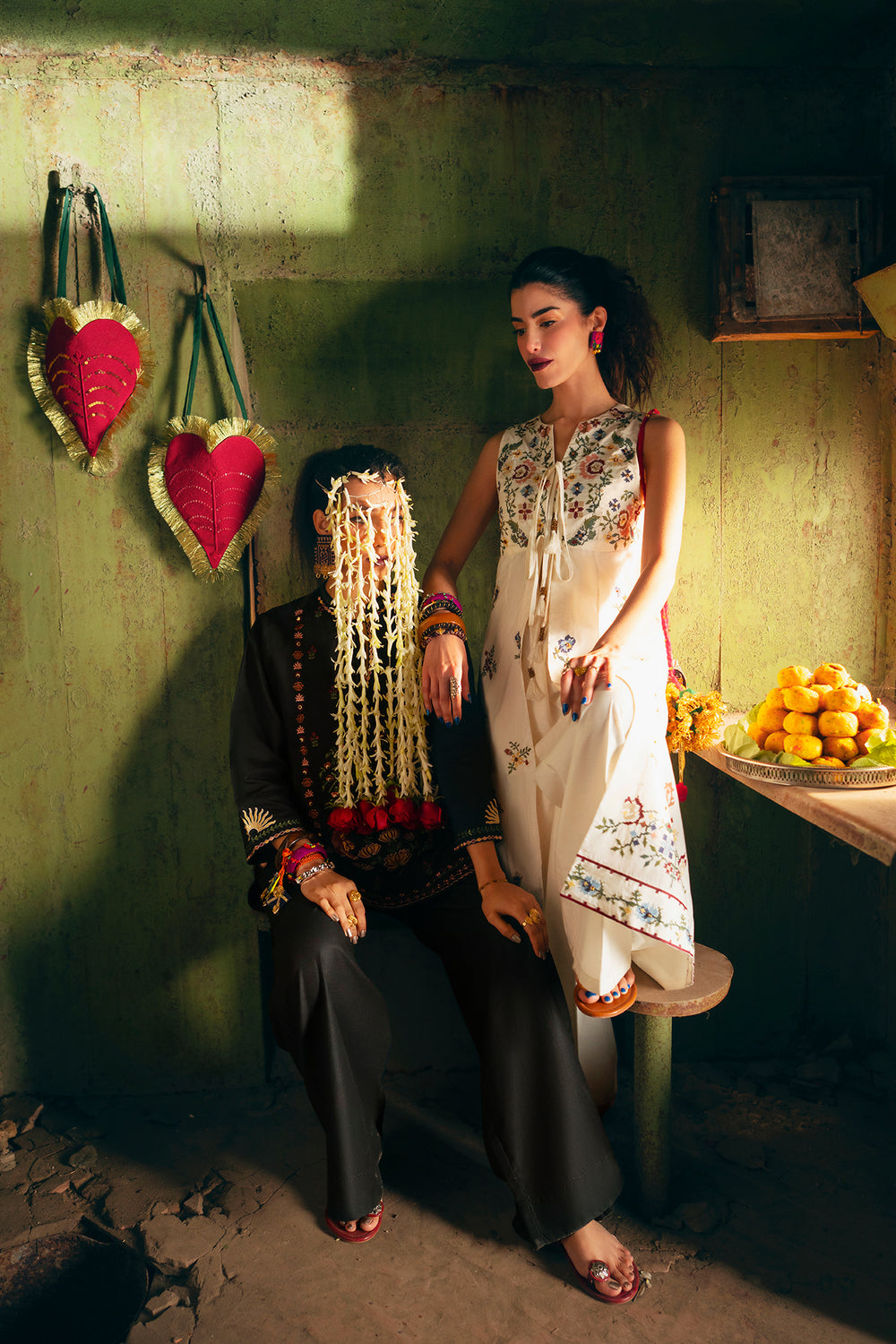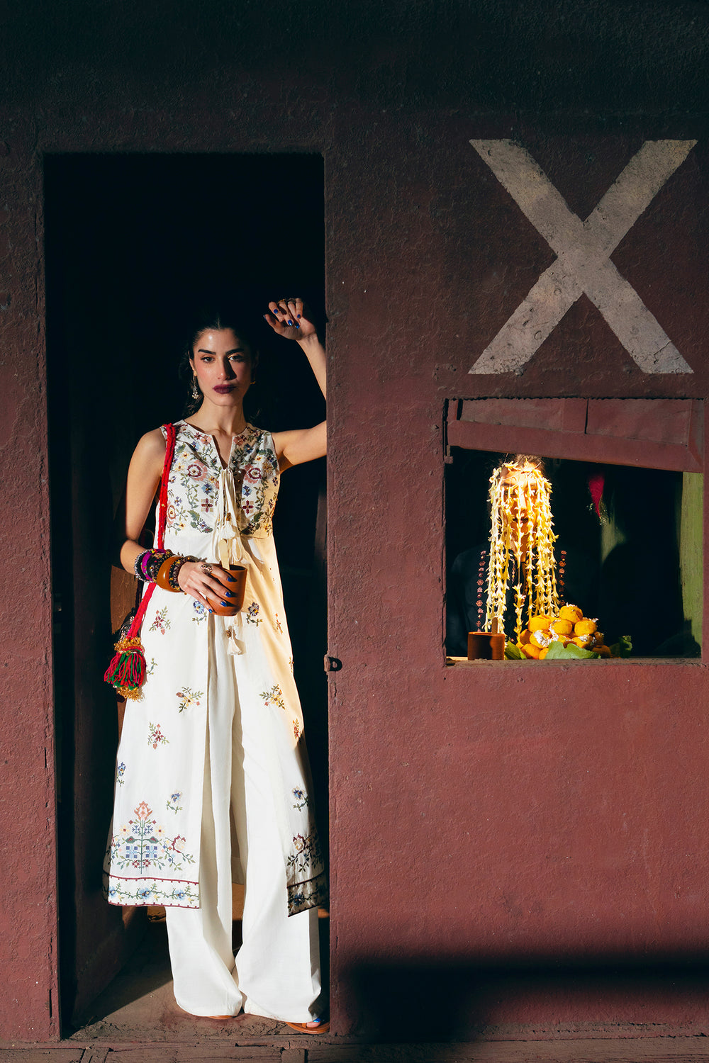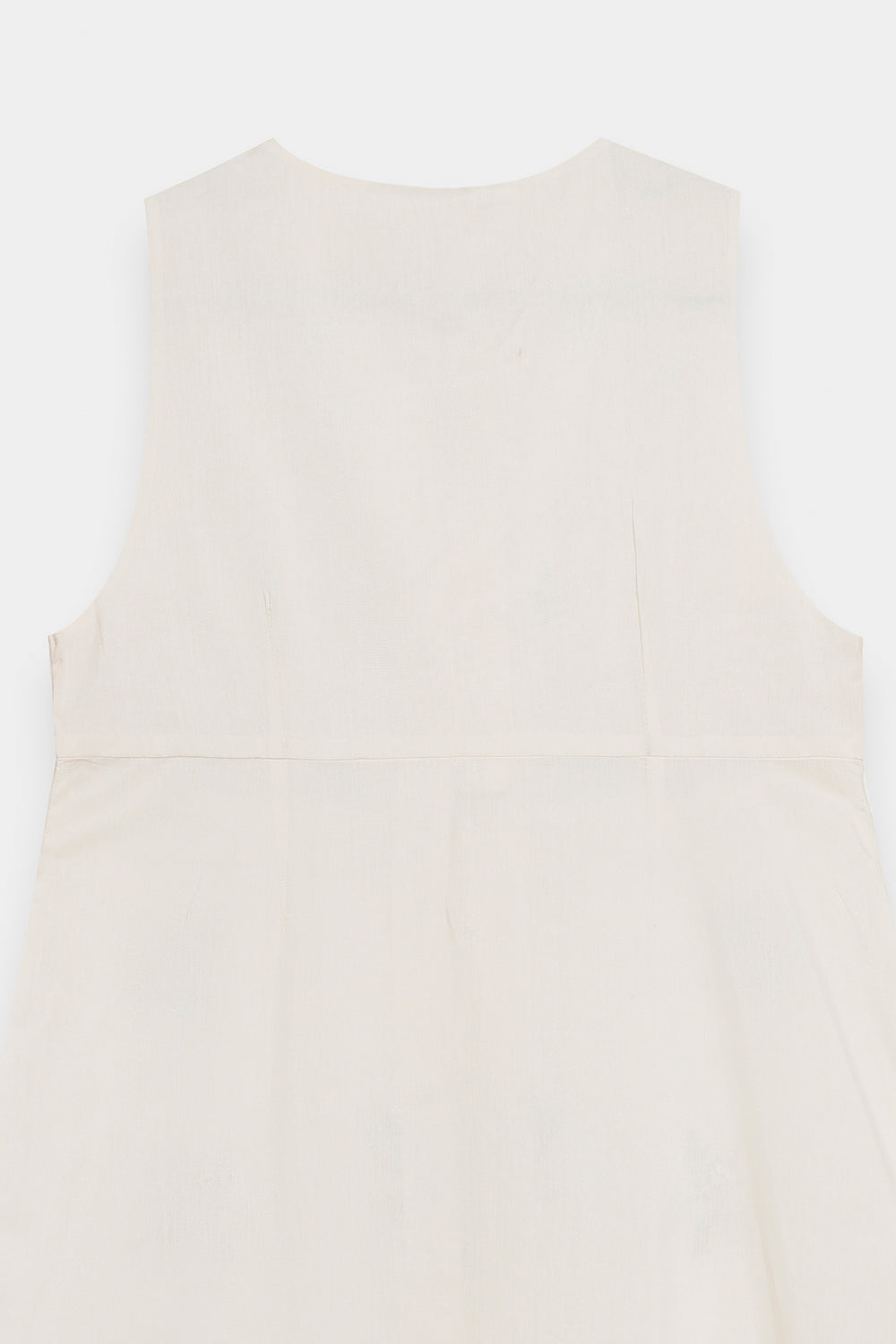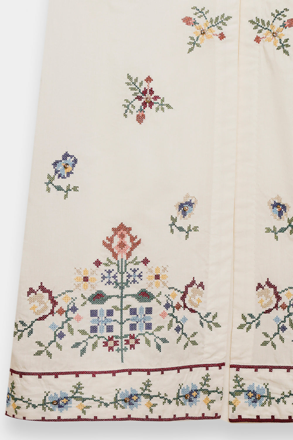 Exude an air of ethereal grace in this sleeveless, floor-length white dress, designed with a flattering long-line silhouette. The piece features a delicate V-neckline with a dainty tie-front detail, leading into a bodice adorned with a rich tapestry of colorful floral embroidery in shades of rose, teal, and gold. Small, intricate floral sprays are artfully scattered across the length of the dress, culminating in a bold, multi-colored embroidered garden at the hemline. This ensemble offers a perfect blend of summery freshness and artisanal sophistication.