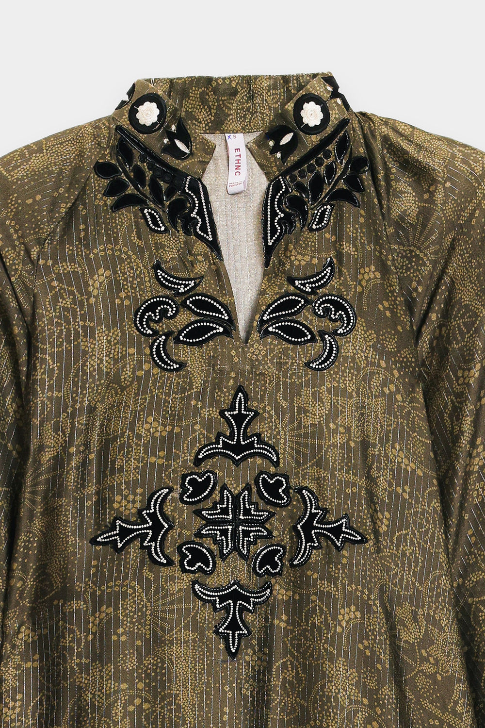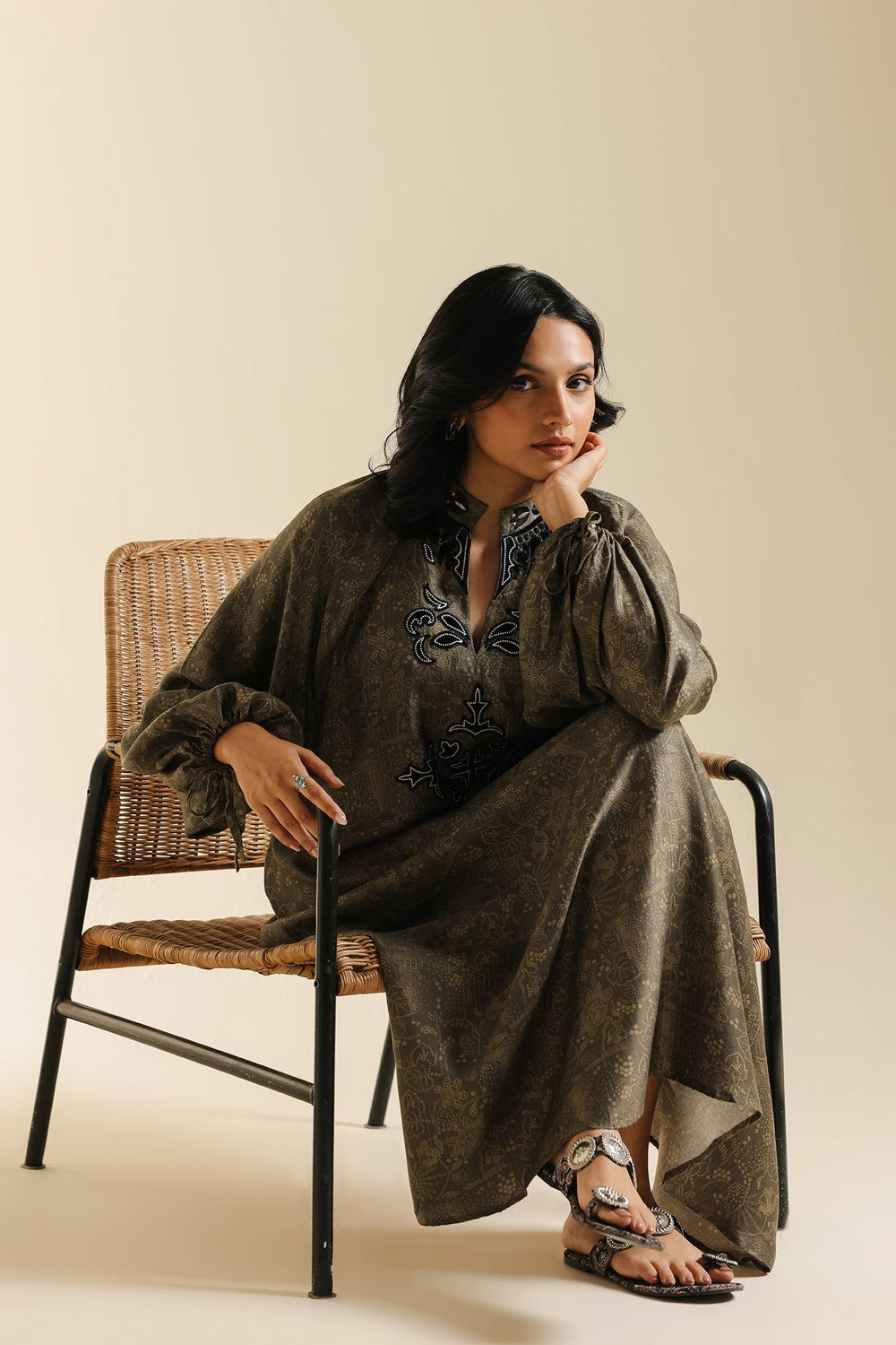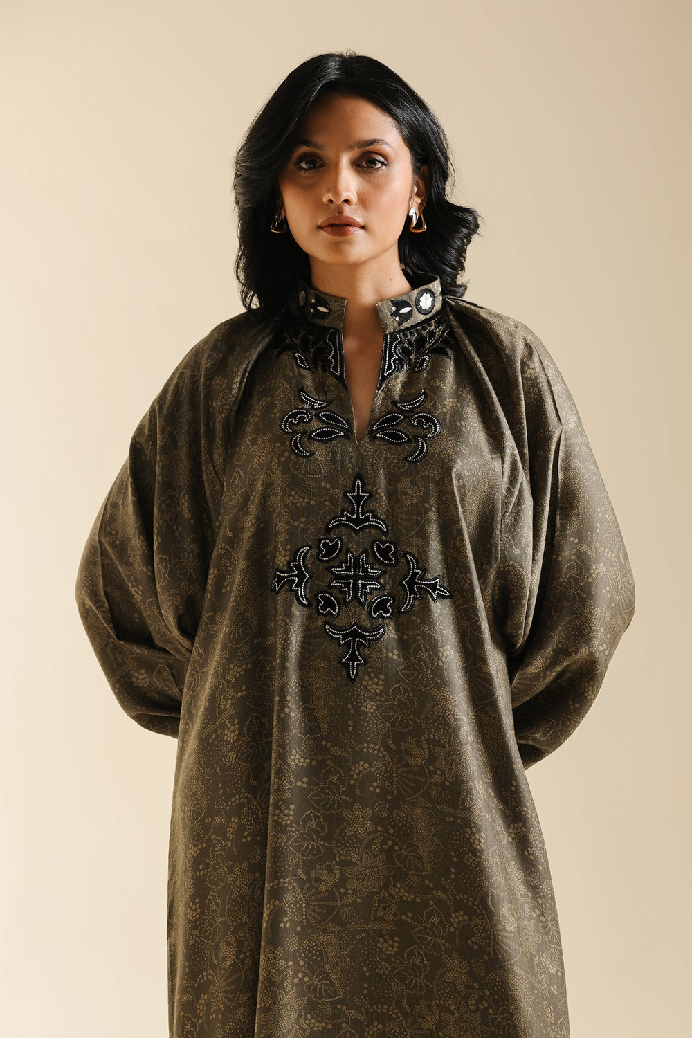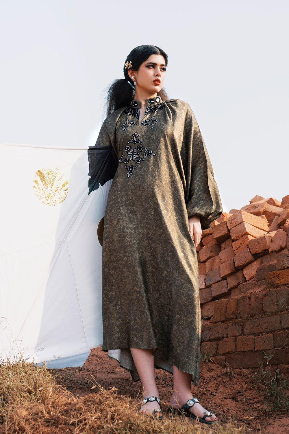 Exude dramatic sophistication in this striking printed shirt with embroidered yoke. This luxurious long-line shirt is crafted from a rich fabric featuring a subtle, dark brown earthy print, with a paisley damask design, that lends it depth and elegance. The commanding silhouette features a relaxed, ankle-length drape, a collar neck with slit, and distinct voluminous puff sleeves that cinch dramatically at the wrist. The entire look is crowned by an exquisite, embroidered black and gray yoke at the neckline, making this an unforgettable piece for any special occasion.
