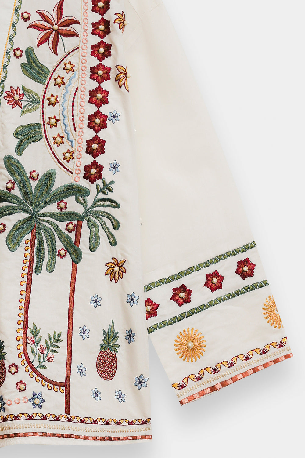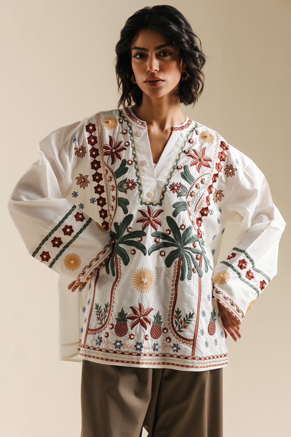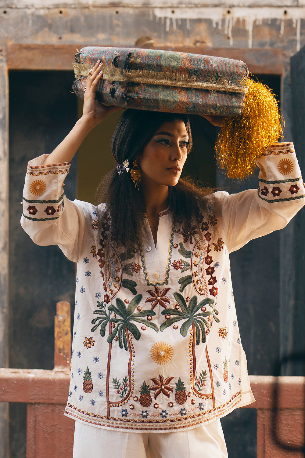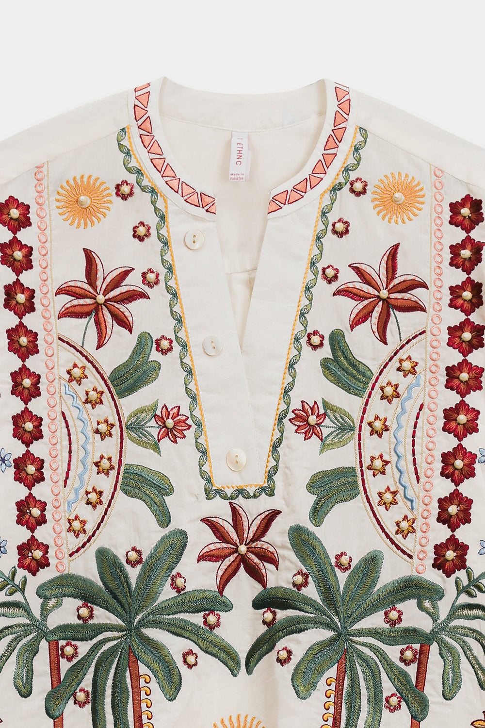 Exude tropical charm in this crisp white embroidered shirt, designed with a relaxed, oversized silhouette. The piece features a sophisticated split neckline with button detailing and is lavishly adorned with vibrant embroidery showcasing palm trees, pineapples, and sun motifs. Rich tones of terracotta, forest green, and mustard create a playful yet refined aesthetic, further elevated by delicate pearl-like embellishments scattered throughout the design. With its intricate borders on the cuffs and hem, this shirt is a perfect blend of artisanal craftsmanship and contemporary summer style.