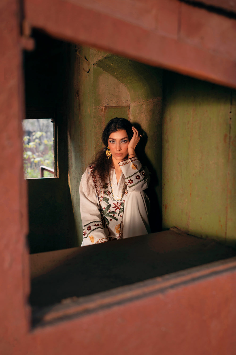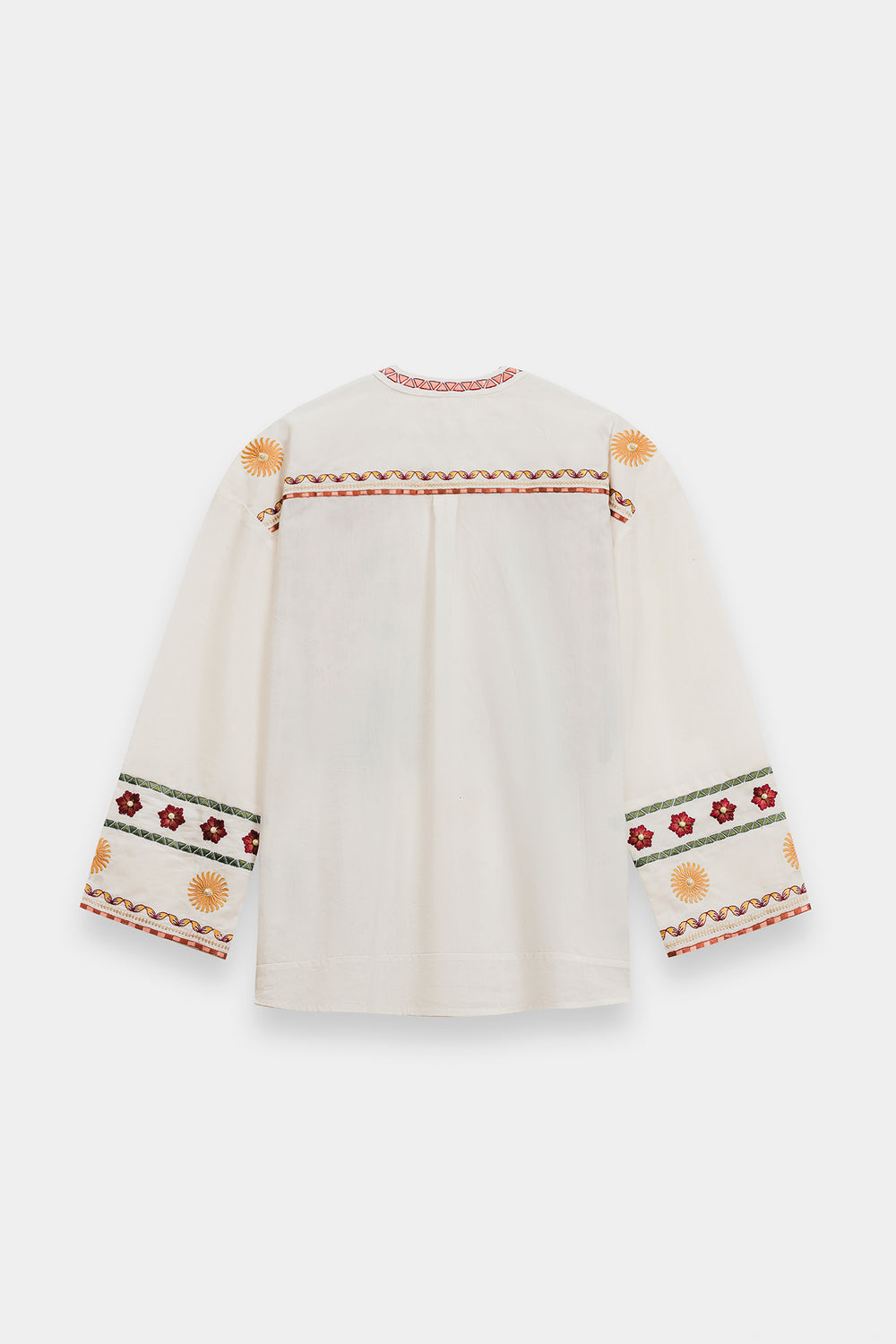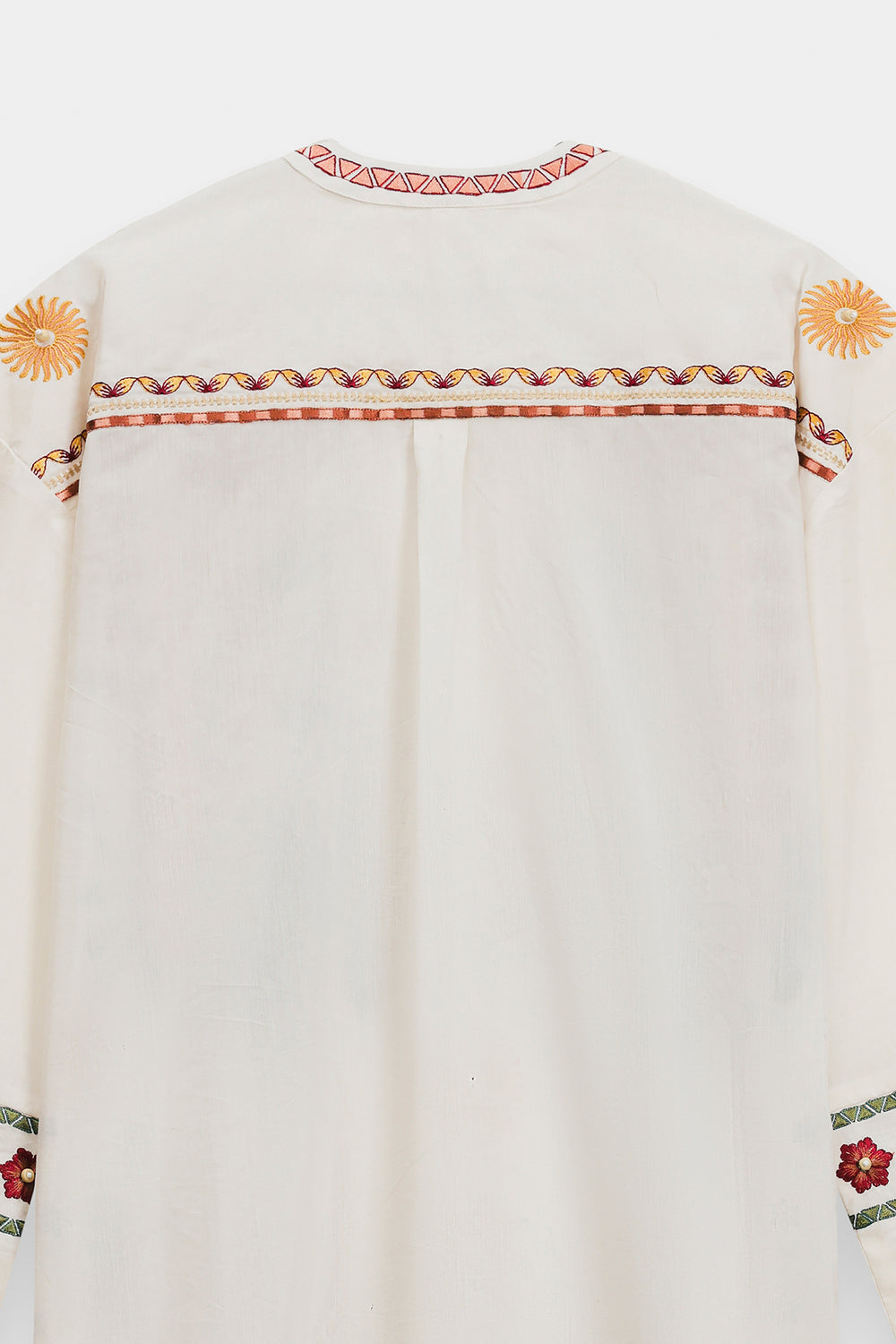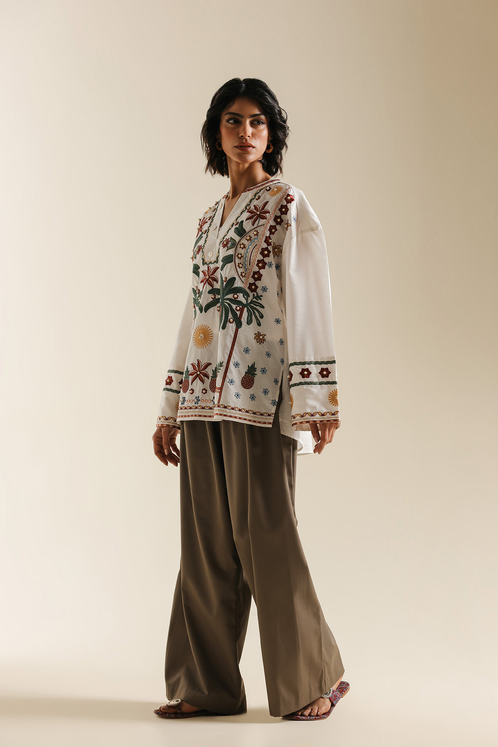 Exude tropical charm in this crisp white embroidered shirt, designed with a relaxed, oversized silhouette. The piece features a sophisticated split neckline with button detailing and is lavishly adorned with vibrant embroidery showcasing palm trees, pineapples, and sun motifs. Rich tones of terracotta, forest green, and mustard create a playful yet refined aesthetic, further elevated by delicate pearl-like embellishments scattered throughout the design. With its intricate borders on the cuffs and hem, this shirt is a perfect blend of artisanal craftsmanship and contemporary summer style.