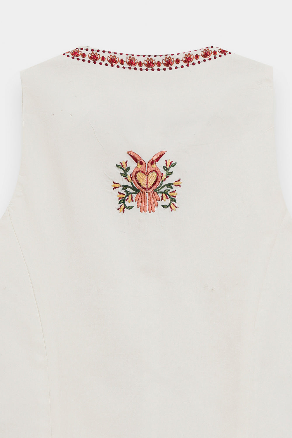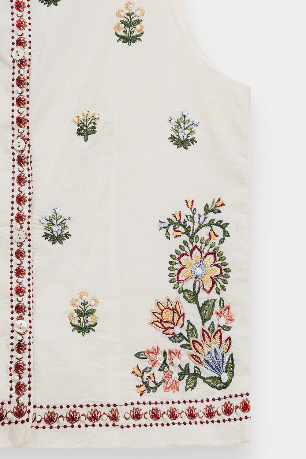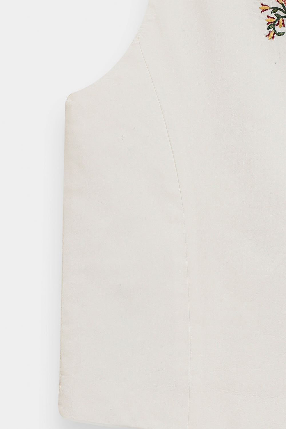 Add a layer of artisanal charm to your ensemble with this off-white waistcoat, a versatile piece that blends traditional craftsmanship with contemporary tailoring. Crafted from premium, textured fabric, this sleeveless top features a flattering V-neckline and a functional button-down front. The garment is intricately adorned with delicate floral and geometric embroidery in shades of rust, sage, and deep red, creating a balanced and refined aesthetic. The embroidery spans the bodice and culminates in a beautiful decorative border along the hem. Designed for a structured yet comfortable fit, this waistcoat can be worn as a standalone top or layered over tunics for a sophisticated, multifaceted look.
