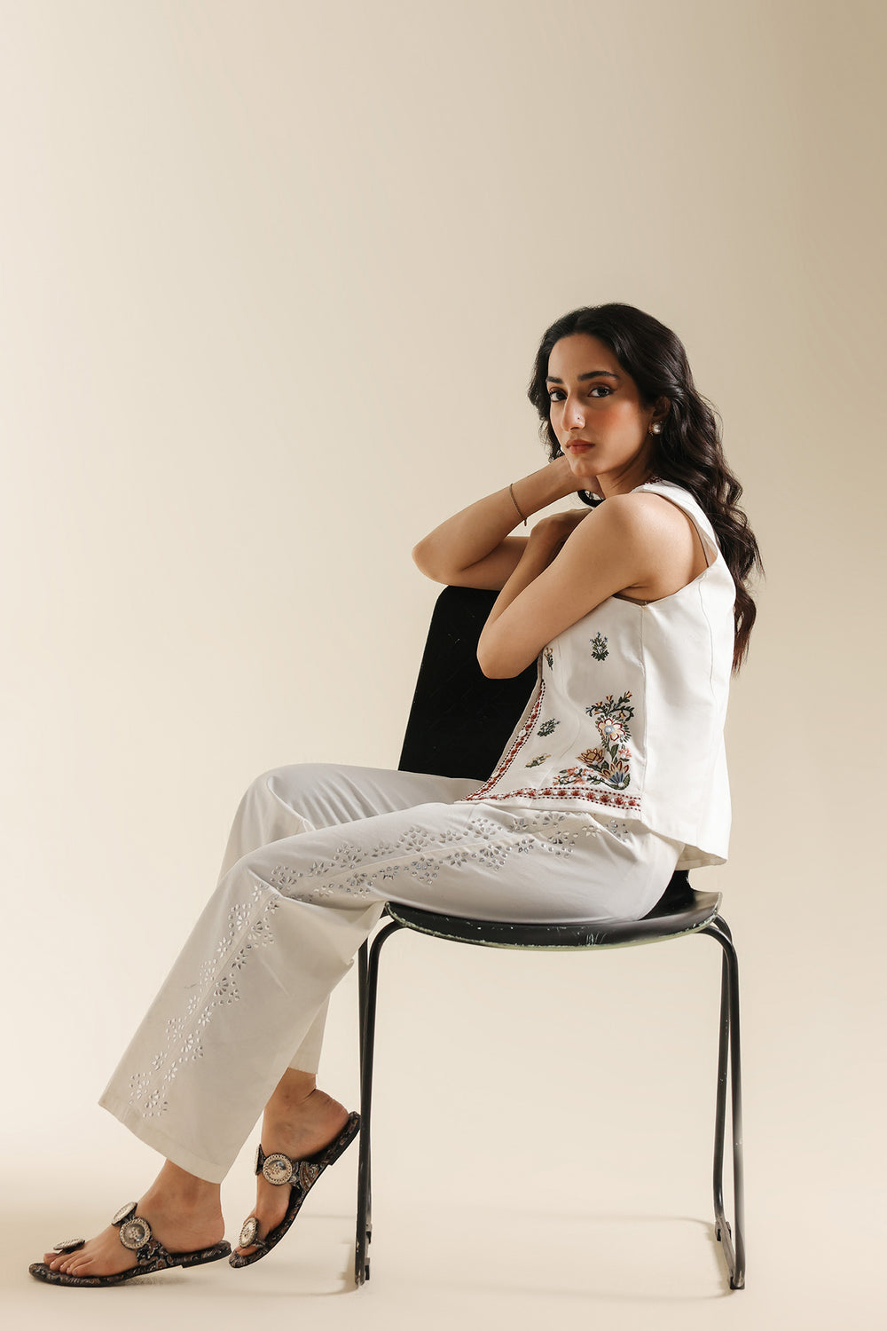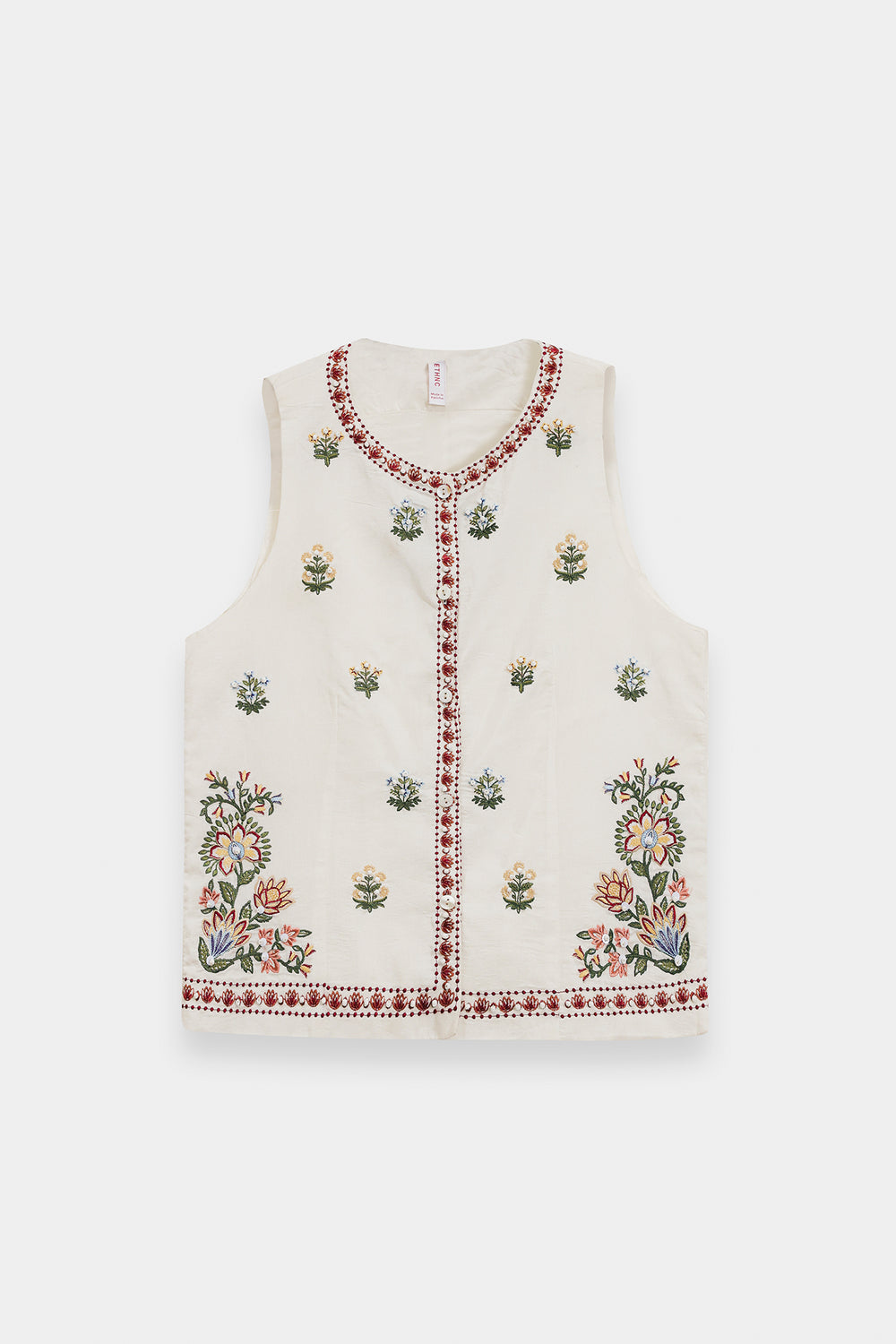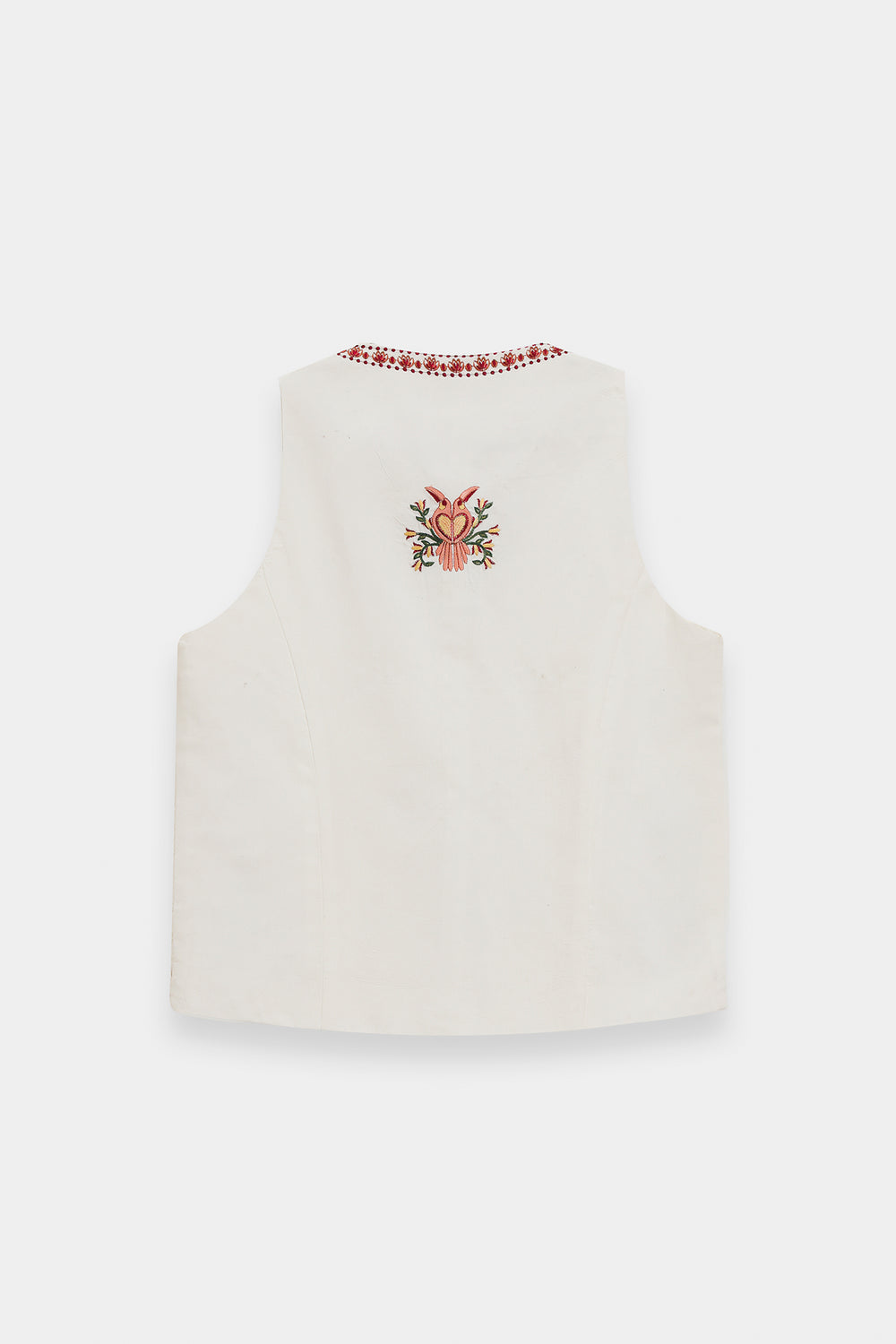 Add a layer of artisanal charm to your ensemble with this off-white waistcoat, a versatile piece that blends traditional craftsmanship with contemporary tailoring. Crafted from premium, textured fabric, this sleeveless top features a flattering V-neckline and a functional button-down front. The garment is intricately adorned with delicate floral and geometric embroidery in shades of rust, sage, and deep red, creating a balanced and refined aesthetic. The embroidery spans the bodice and culminates in a beautiful decorative border along the hem. Designed for a structured yet comfortable fit, this waistcoat can be worn as a standalone top or layered over tunics for a sophisticated, multifaceted look.