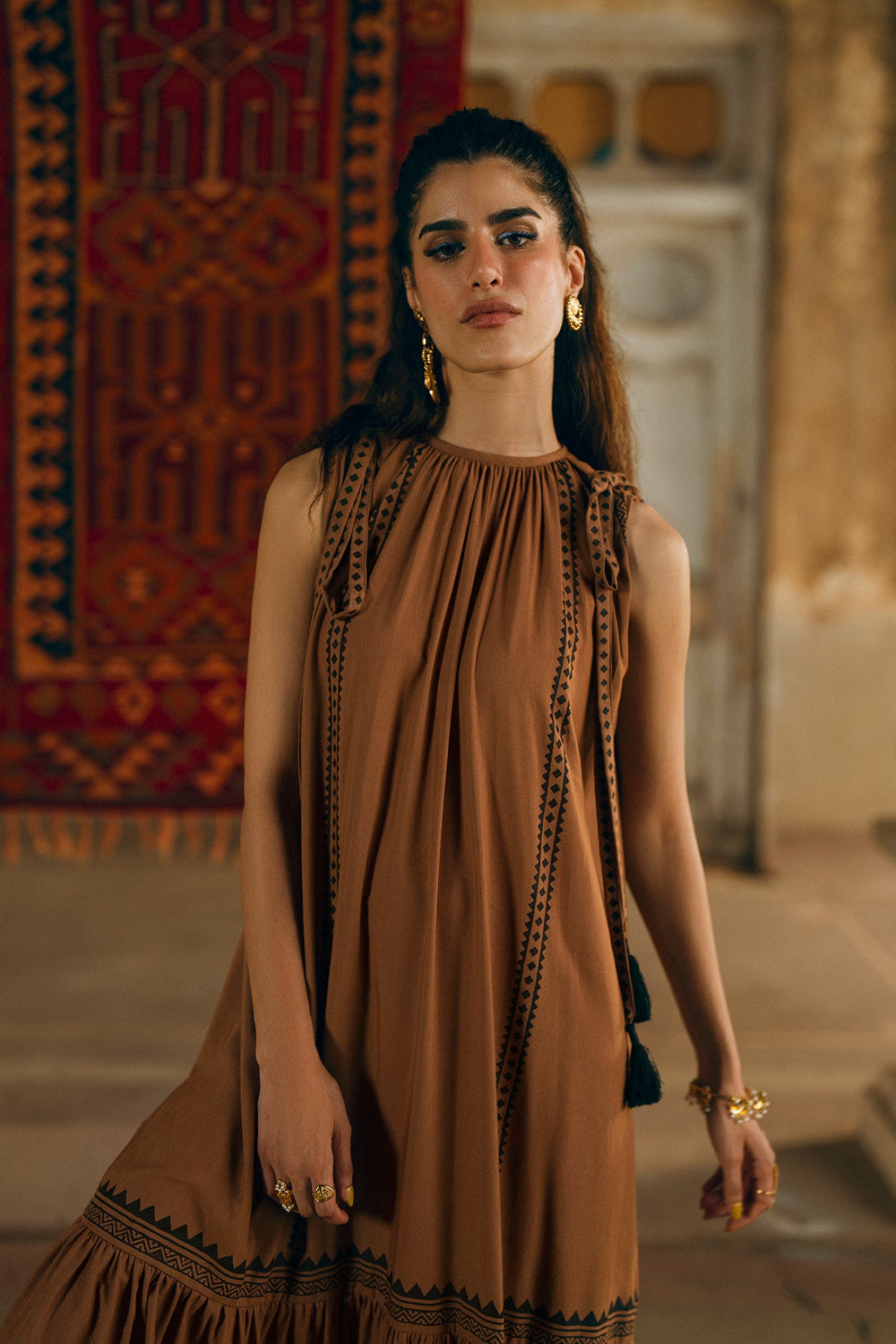 Grace any occasion with this beautiful brown dress. The sleeveless dress features a flattering silhouette with intricate black print on the bodice and a tiered skirt. The tassels at the neckline add a touch of bohemian charm, making it perfect for a stylish day out or a special event.