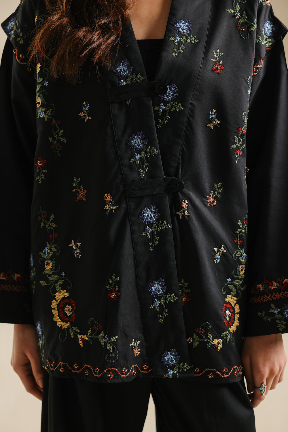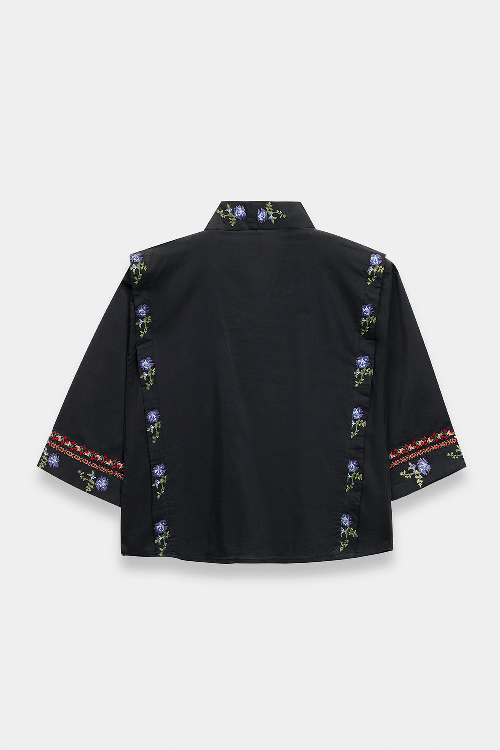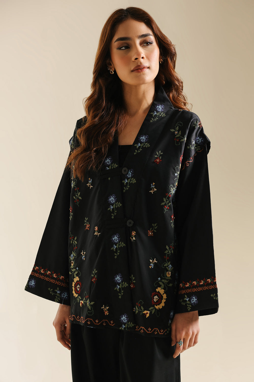 Make a sophisticated and modern statement in this jet-black wrap-style kurti, featuring a structured, slightly oversized silhouette with wide full sleeves. The piece is designed with an elegant overlapping V-neckline and a button closure, creating a contemporary architectural feel. It is beautifully adorned with delicate floral embroidery scattered across the front and sleeves in vibrant shades of coral, deep red, forest green, and cornflower blue. Finished with an intricate geometric embroidered border along the cuffs and hemline. To complete the look pair it with fluid black wide-leg trouser.