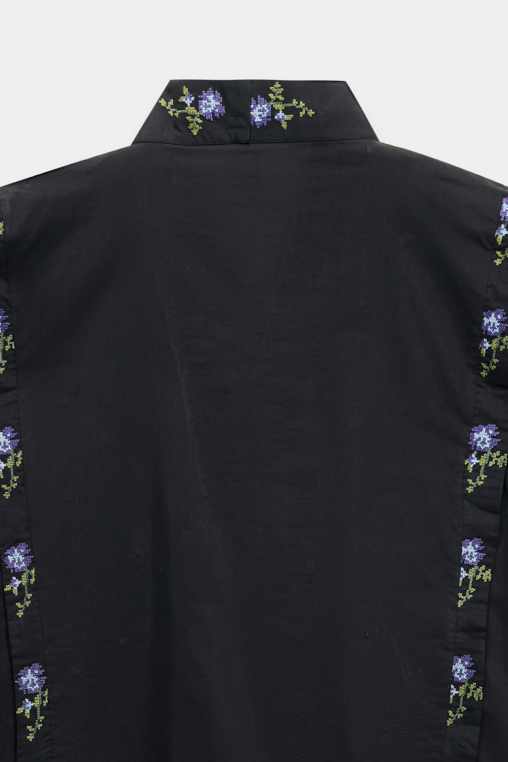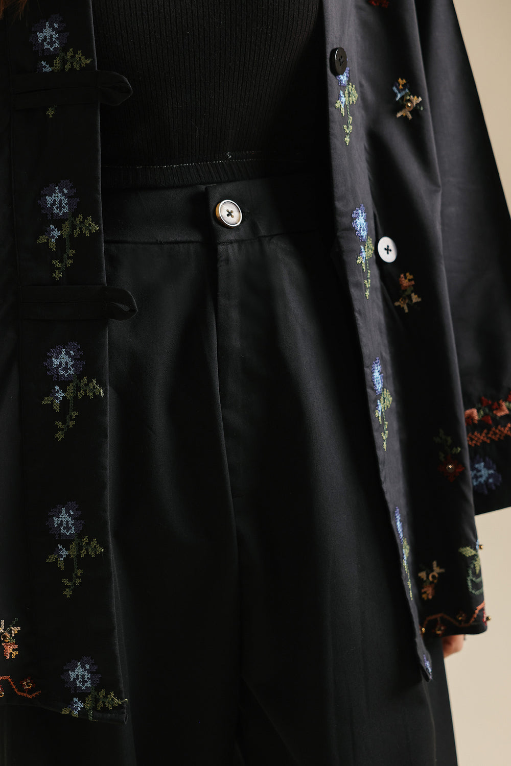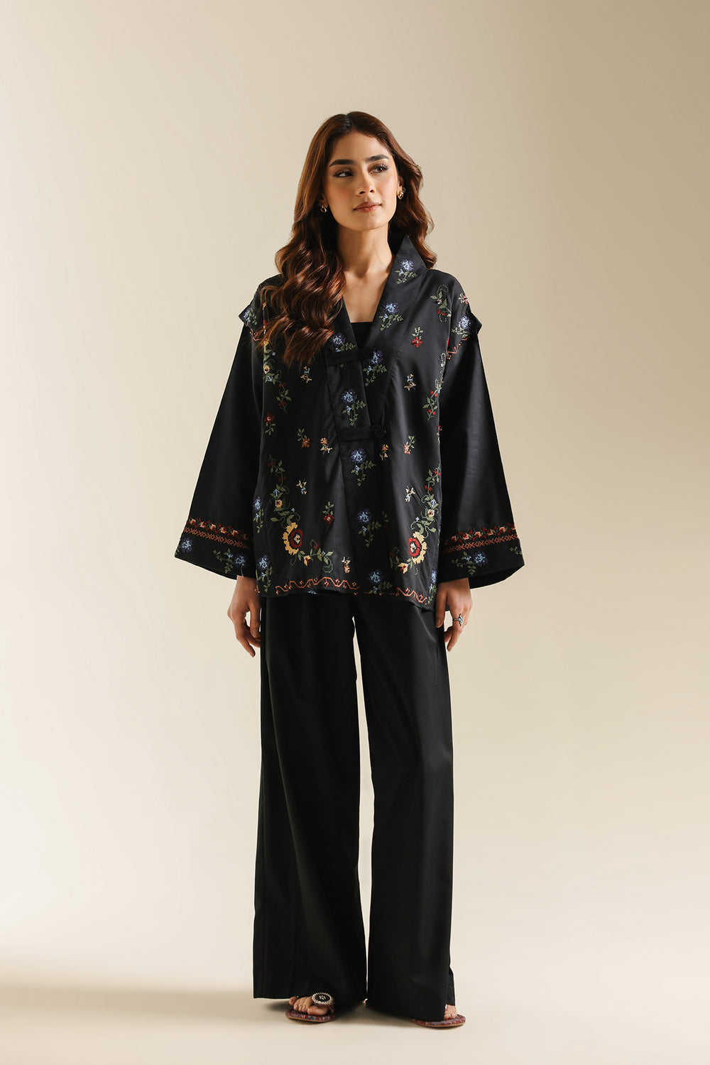 Make a sophisticated and modern statement in this jet-black wrap-style kurti, featuring a structured, slightly oversized silhouette with wide full sleeves. The piece is designed with an elegant overlapping V-neckline and a button closure, creating a contemporary architectural feel. It is beautifully adorned with delicate floral embroidery scattered across the front and sleeves in vibrant shades of coral, deep red, forest green, and cornflower blue. Finished with an intricate geometric embroidered border along the cuffs and hemline. To complete the look pair it with fluid black wide-leg trouser.