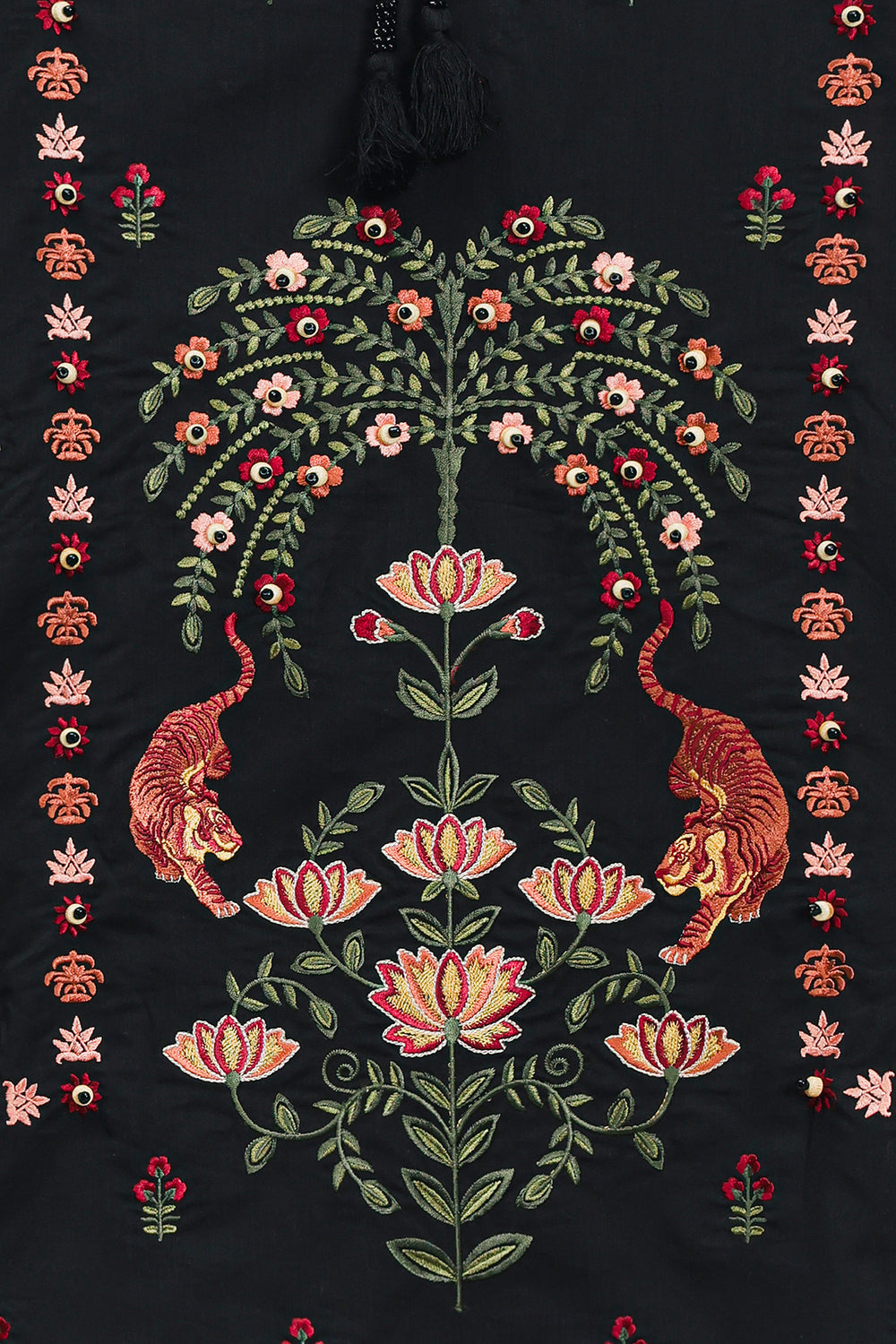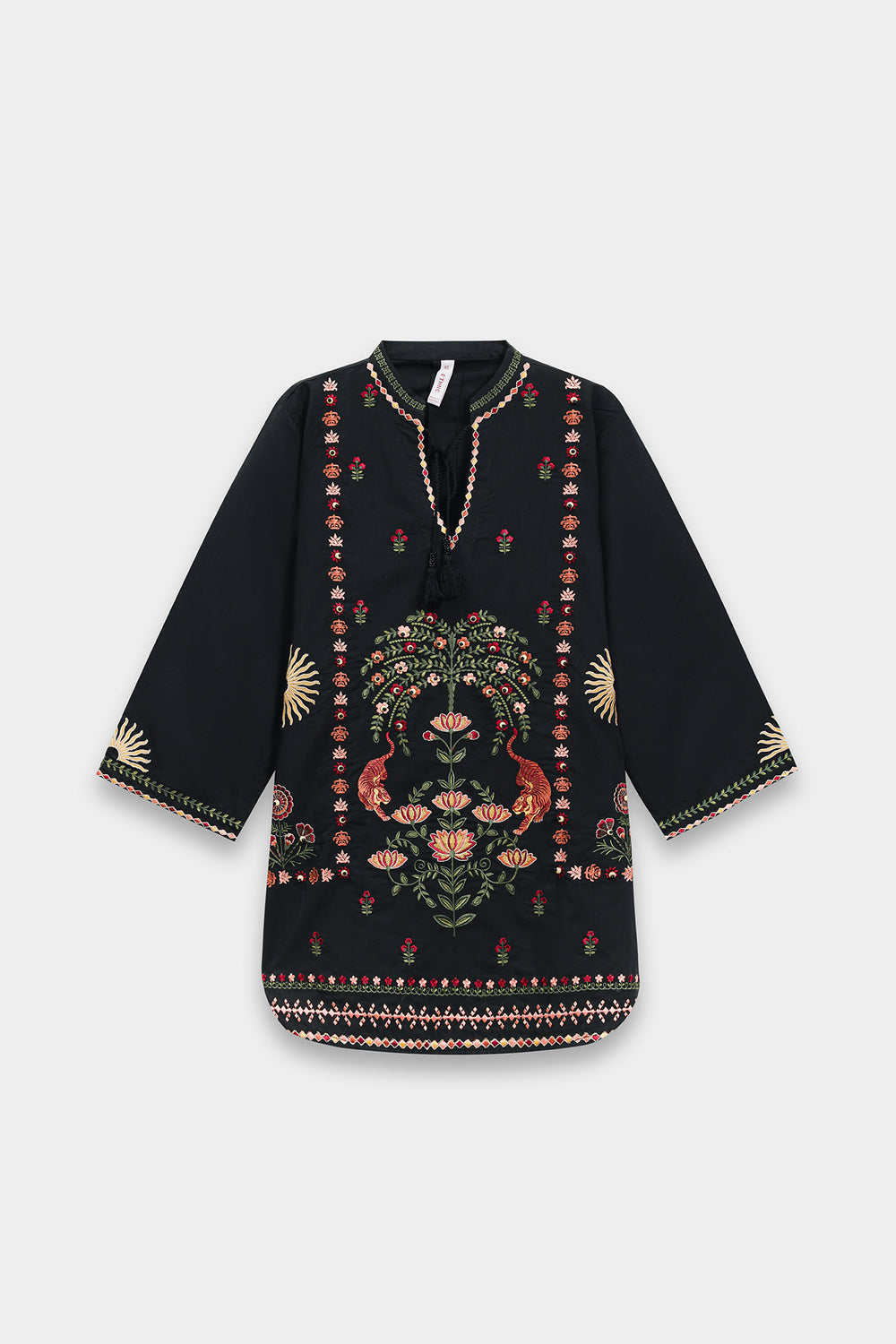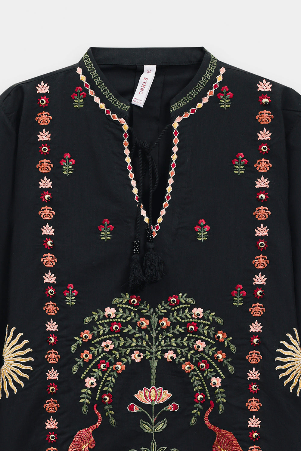 Make a bold and artistic statement in this jet-black kurti, featuring a rich tapestry of nature-inspired embroidery. The piece is designed with a sophisticated split neckline and delicate tie-front tassels, leading into a central motif of blooming flowers and a majestic tiger. Radiant sunbursts and intricate floral vines in shades of terracotta and forest green adorn the front and wide, flowing sleeves. This Kurti offers a perfect blend of modern comfort and striking traditional craftsmanship.