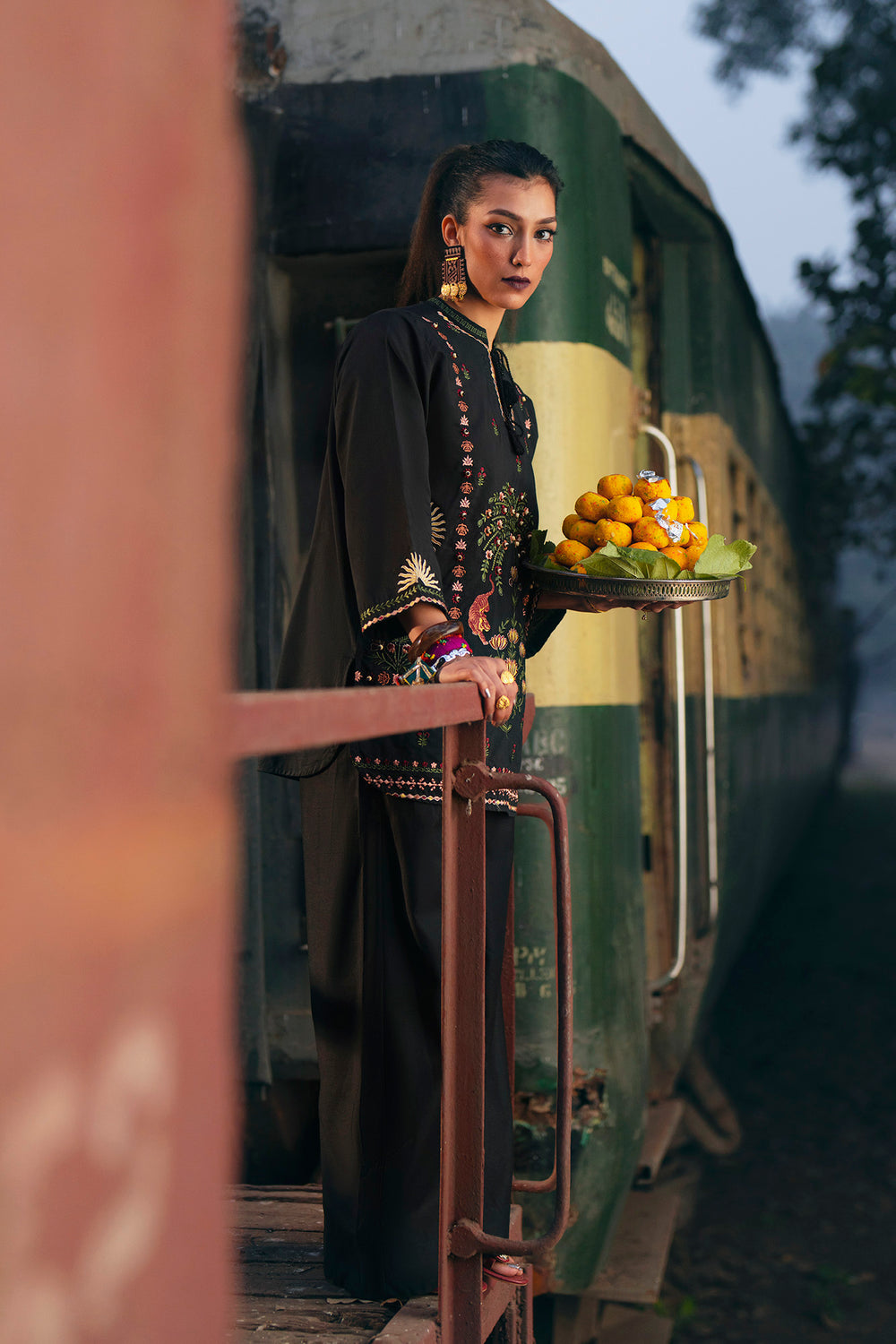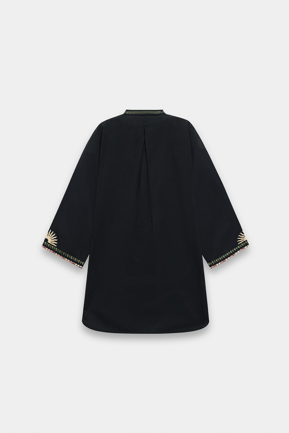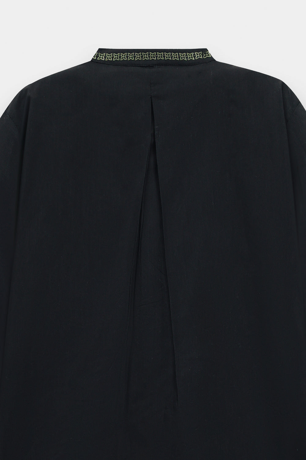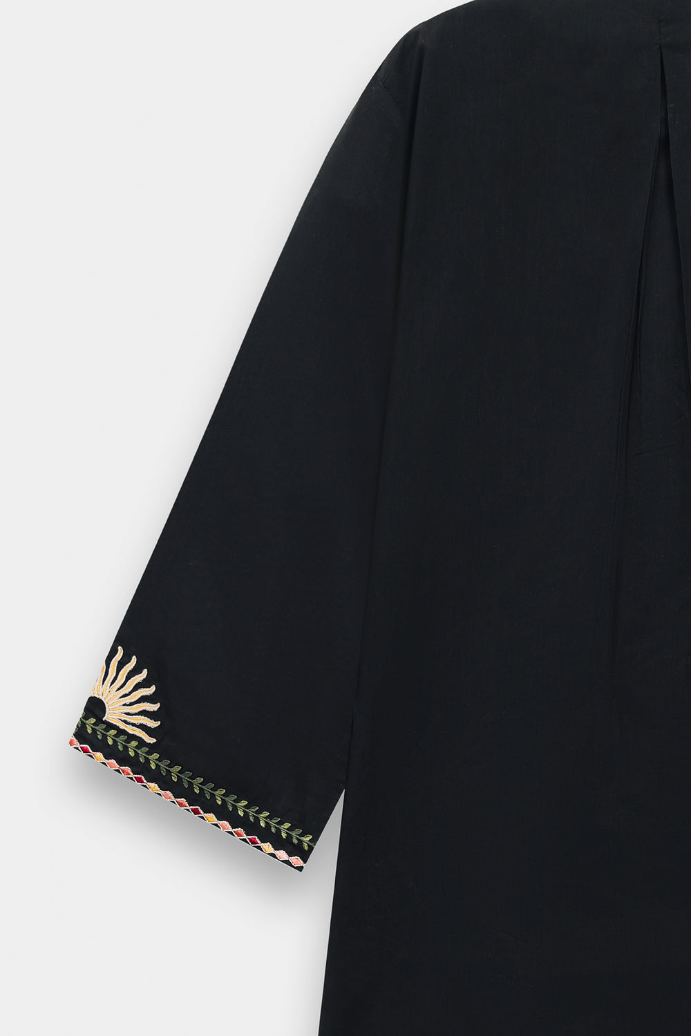 Make a bold and artistic statement in this jet-black kurti, featuring a rich tapestry of nature-inspired embroidery. The piece is designed with a sophisticated split neckline and delicate tie-front tassels, leading into a central motif of blooming flowers and a majestic tiger. Radiant sunbursts and intricate floral vines in shades of terracotta and forest green adorn the front and wide, flowing sleeves. This Kurti offers a perfect blend of modern comfort and striking traditional craftsmanship.