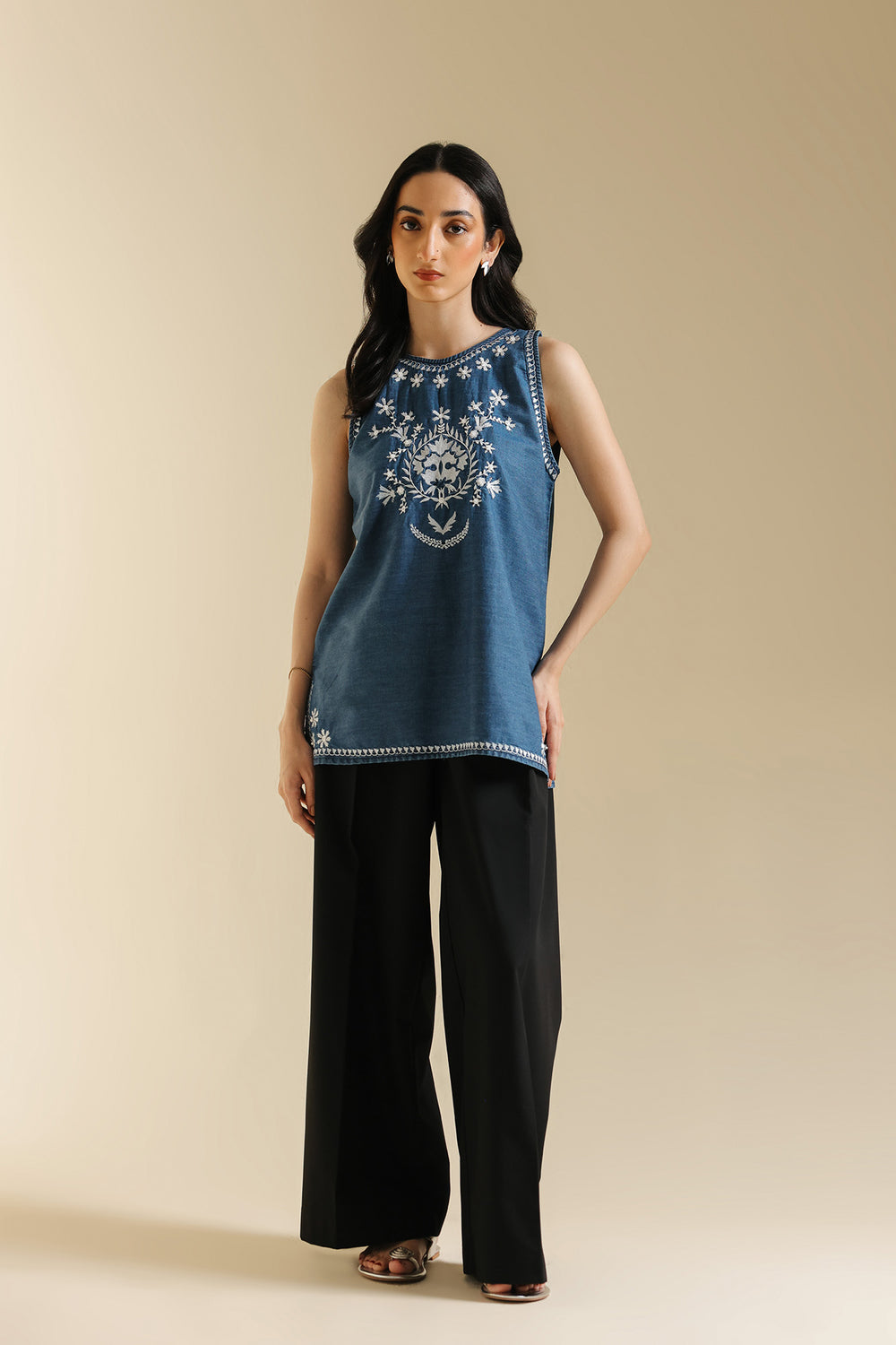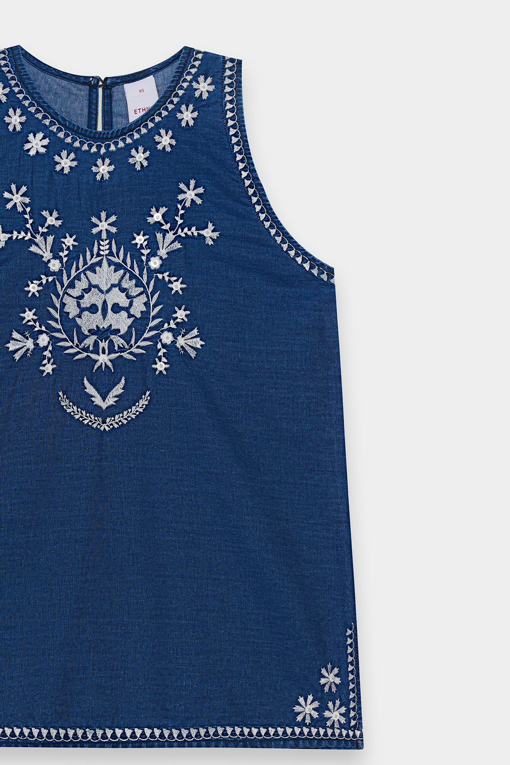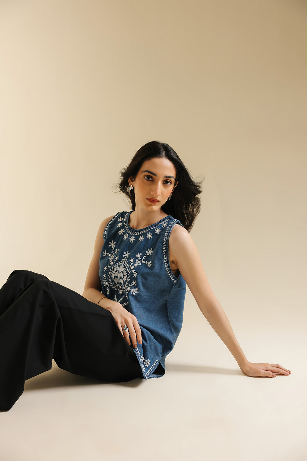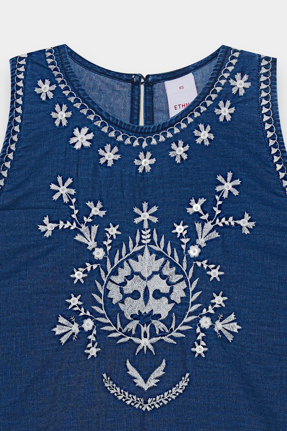 Discover effortless elegance with this stunning blue sleeveless top, where classic comfort meets delicate artistry. The soft blue fabric provides a beautiful backdrop for the intricate white embroidery, showcasing ornate floral and abstract patterns across the front. This top is perfect for adding a refined touch to your everyday wardrobe, easily paired with trousers or skirts for a chic and comfortable look.