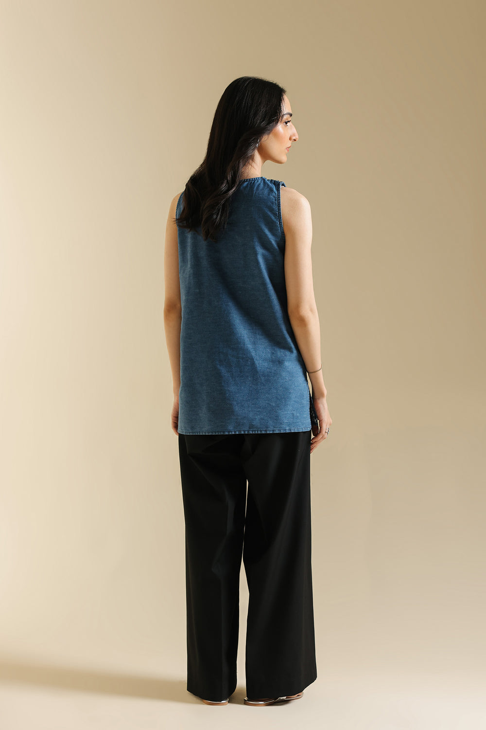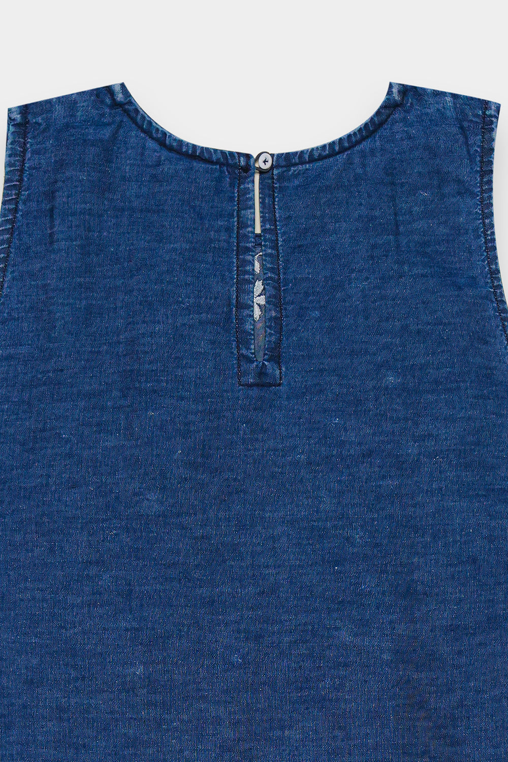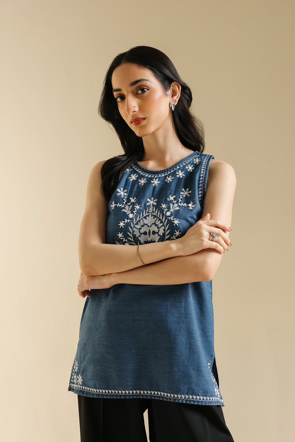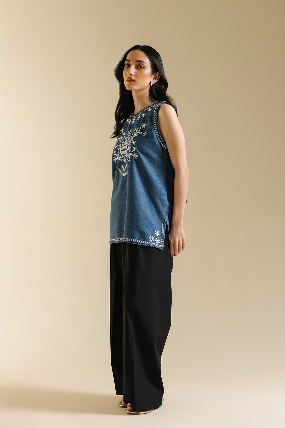 Discover effortless elegance with this stunning blue sleeveless top, where classic comfort meets delicate artistry. The soft blue fabric provides a beautiful backdrop for the intricate white embroidery, showcasing ornate floral and abstract patterns across the front. This top is perfect for adding a refined touch to your everyday wardrobe, easily paired with trousers or skirts for a chic and comfortable look.
