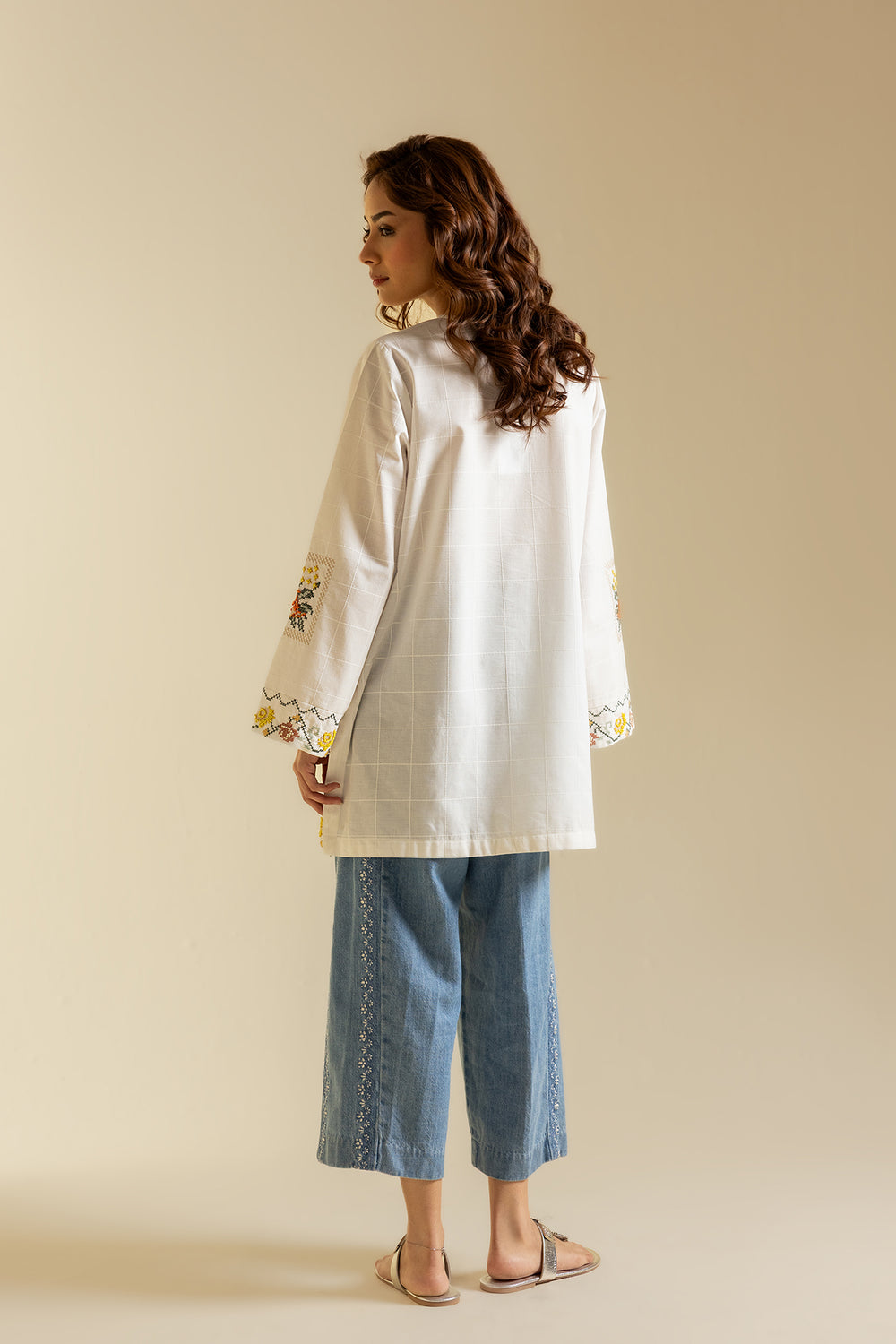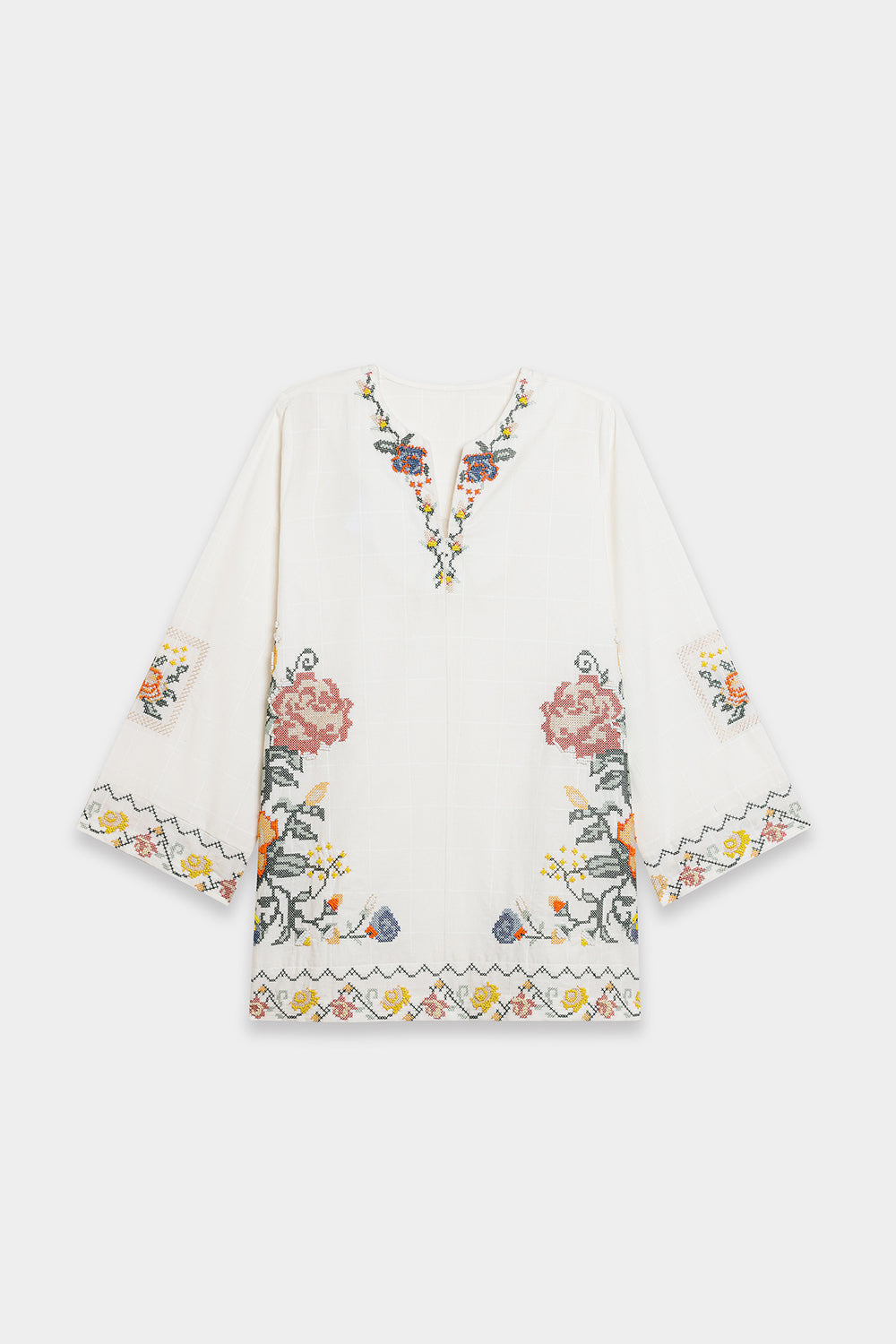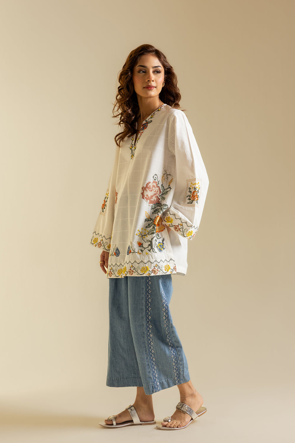 Channel your inner grace and sophistication with this elegant off white kurti. Featuring intricate floral embroidery using the cross stitch technique, this contemporary silhouette is perfect for any fun occasion this season. Be the talk of the town and stand out with this must-have kurti!