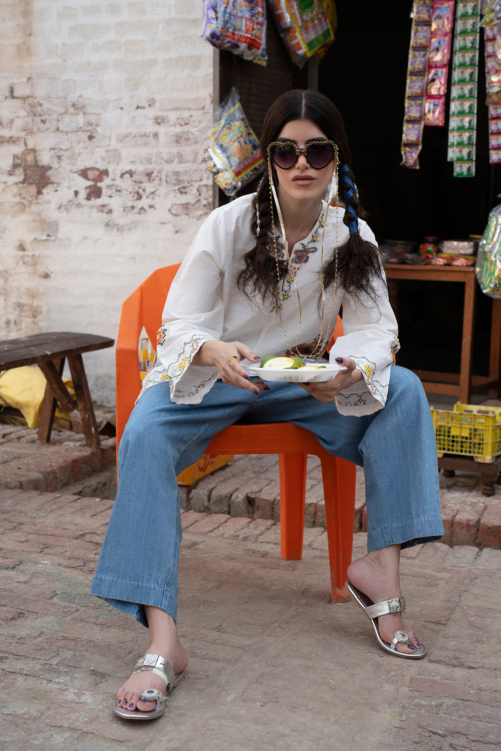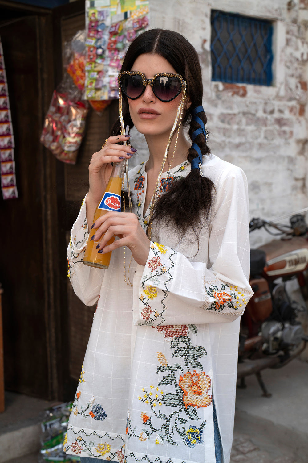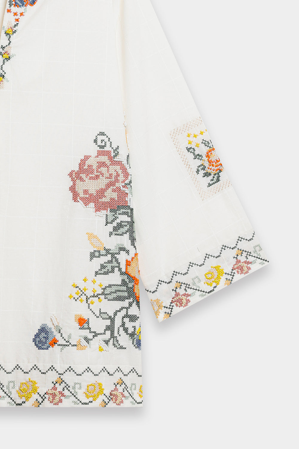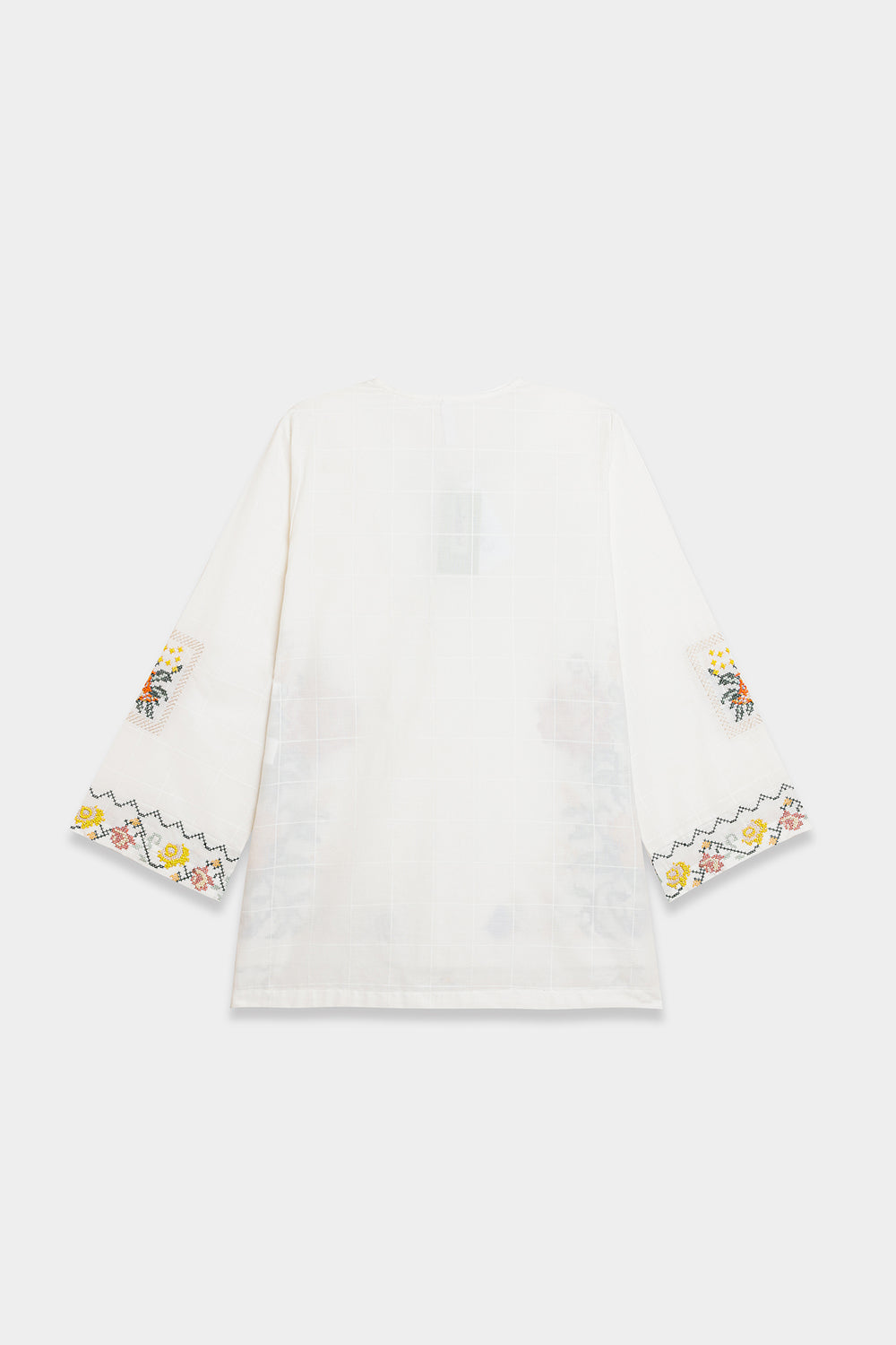 Channel your inner grace and sophistication with this elegant off white kurti. Featuring intricate floral embroidery using the cross stitch technique, this contemporary silhouette is perfect for any fun occasion this season. Be the talk of the town and stand out with this must-have kurti!