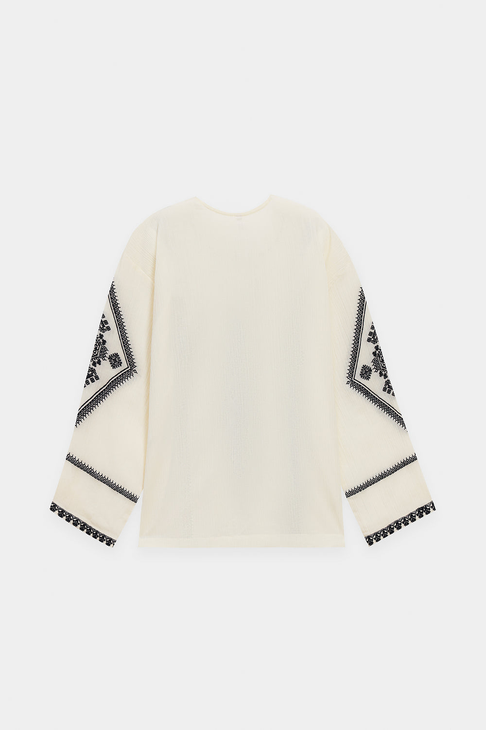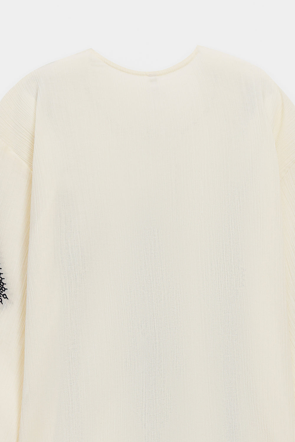 Unveil striking folk-inspired charm in this crisp white Kurti. This short, textured white kurti features beautiful black thread embroidery in dense geometric and intricate patterned motifs across the yoke, shoulders, and cuffs. The neckline is detailed with decorative black tassels, and the voluminous sleeves drape effortlessly. The high-contrast black embroidery on the white fabric creates an immediate and sophisticated style statement.