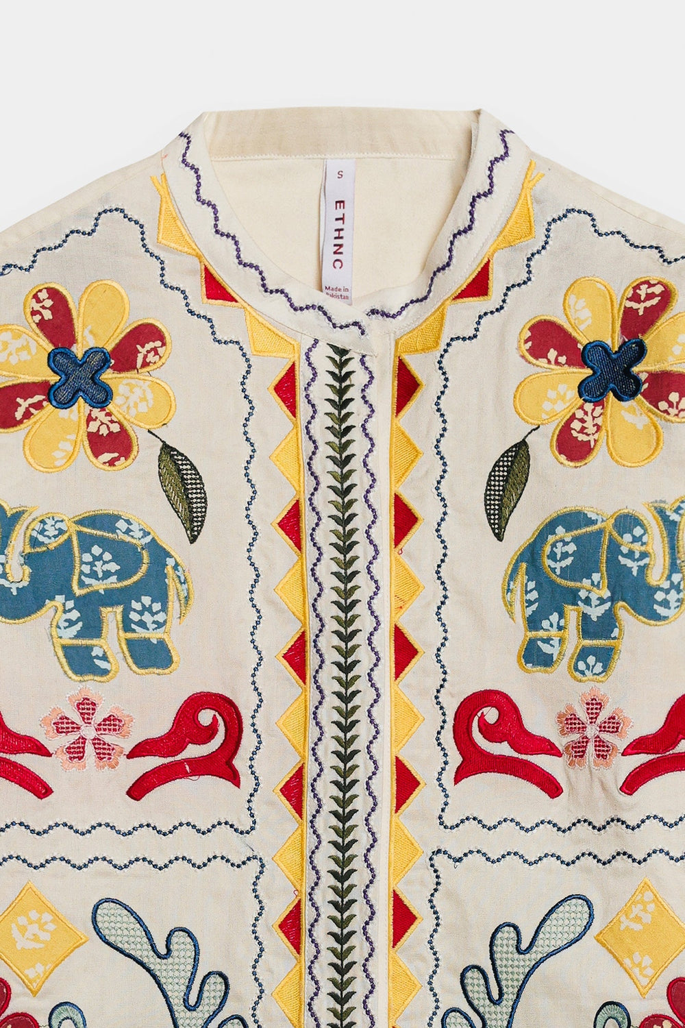Embrace a blend of art and style with this beautiful embroidered off white kurti. It features intricate and colorful floral motifs, creating a stunning and unique pattern on the front and sleeves. The straight fit ensures tapered silhouette, while the vibrant embroidery makes it a true statement piece. Perfect for a festive celebration or a special occasion where you want to showcase your artistic side.