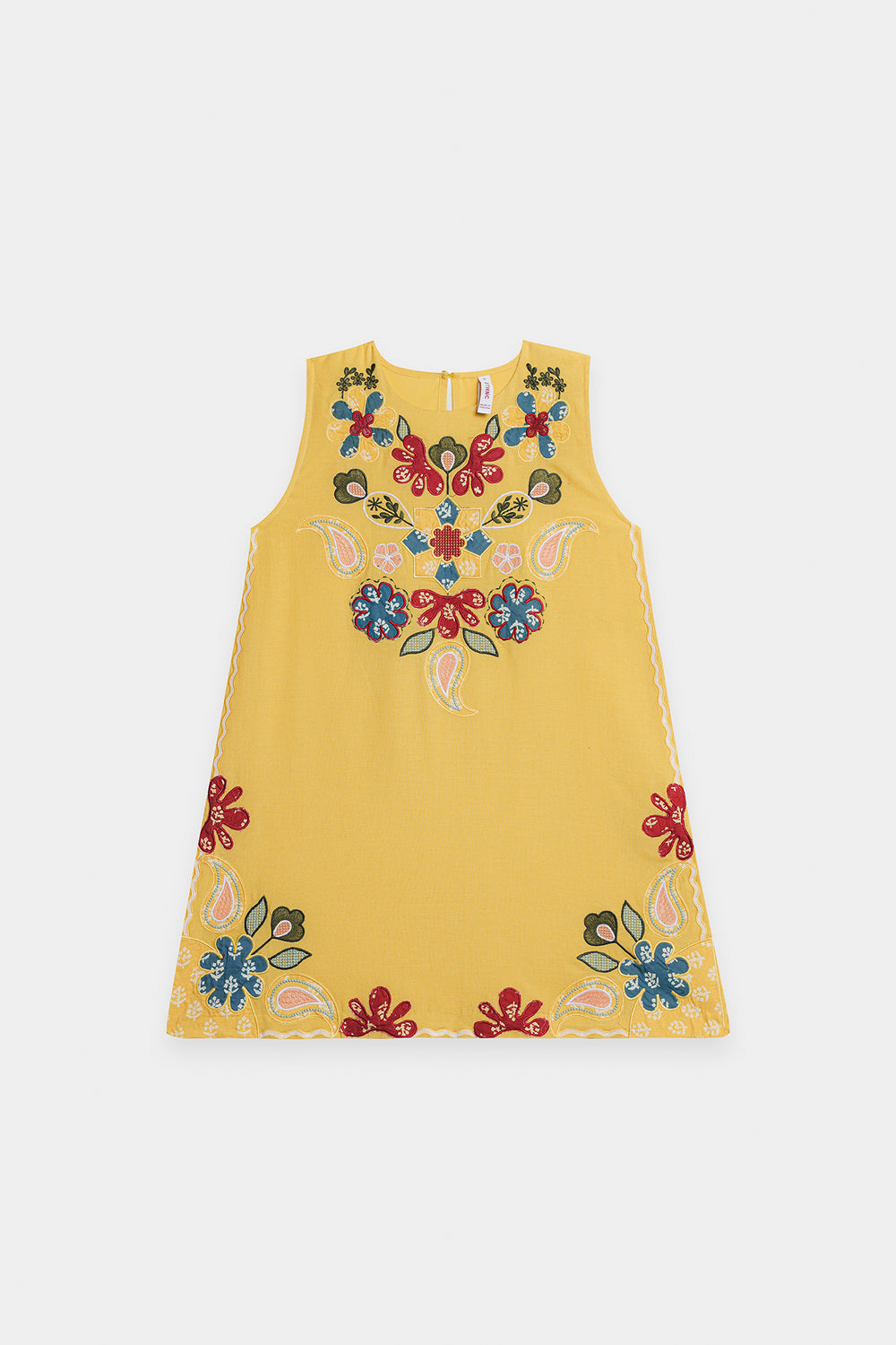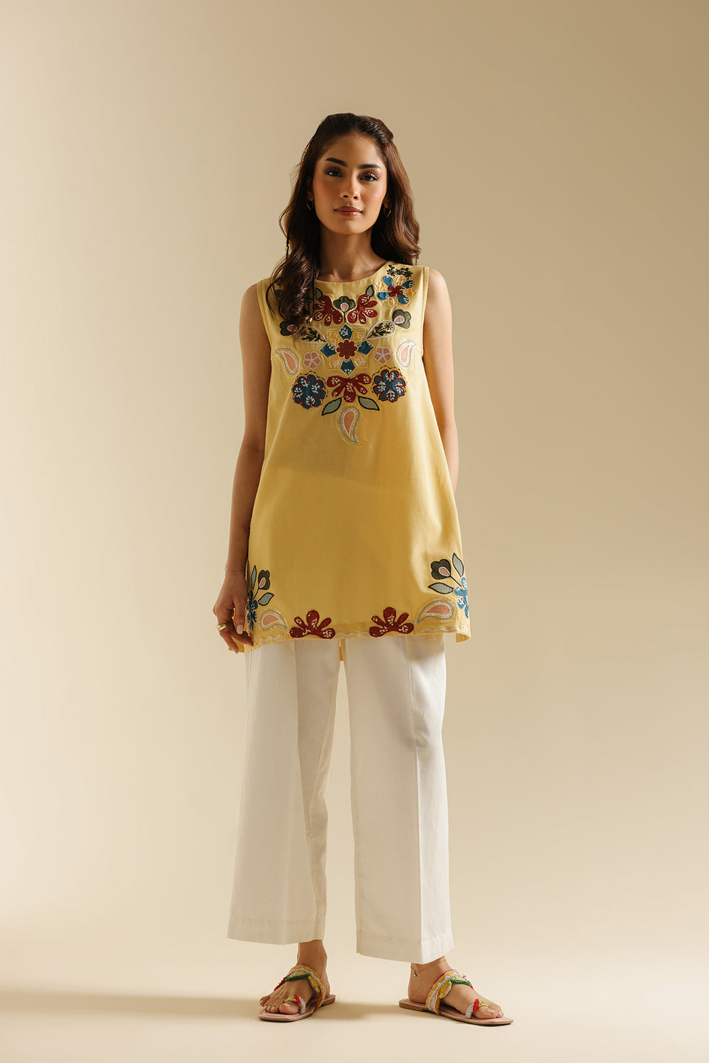 Brighten up your wardrobe with this sunny yellow sleeveless kurti, adorned with intricate multicolored embroidery across the neckline and hem. The vibrant floral and paisley motifs add a playful yet elegant charm, making it a standout piece for both casual outings and festive gatherings. Crafted in a breezy, comfortable fabric, this kurti is perfect for warm-weather days, pairing effortlessly with classic trousers or statement bottoms for a chic, uplifting look.
