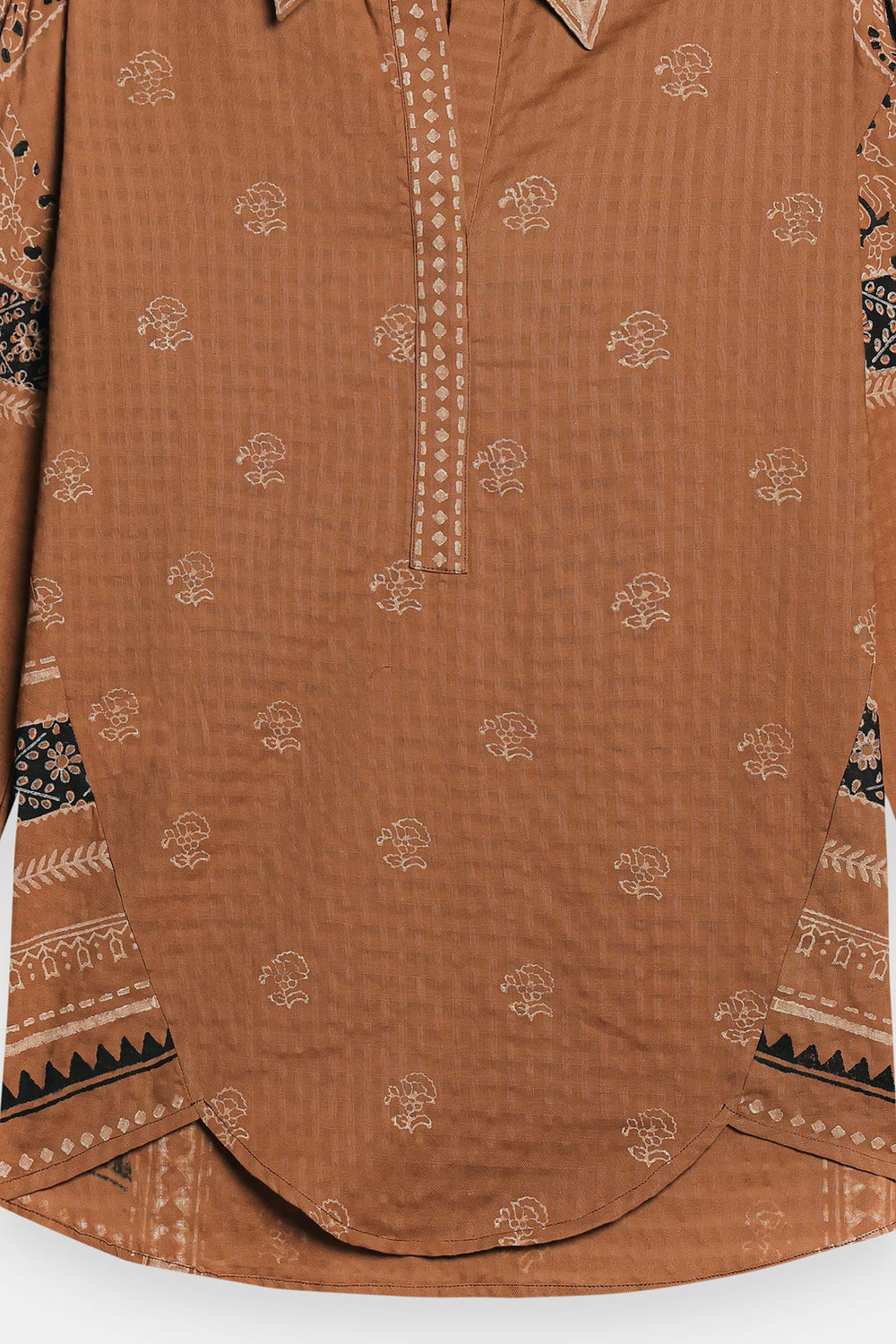 Make a unique style statement with this sophisticated brown kurti. This top features intricate print on the front and on the full sleeves, creating a beautiful and artistic contrast. The relaxed fit and elegant detailing make it perfect for both casual and semi-formal occasions.
