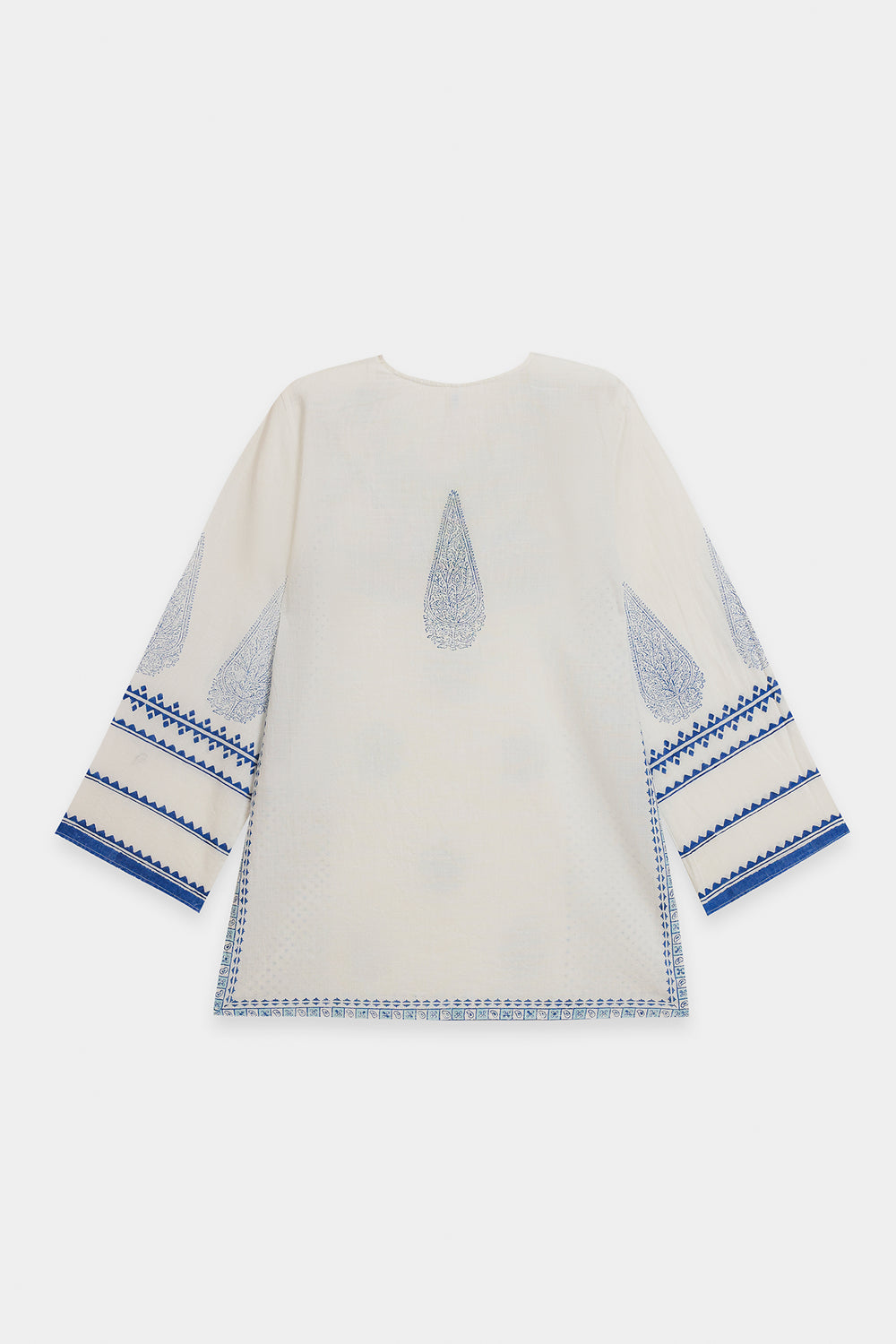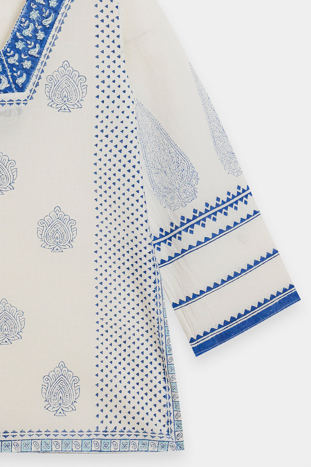 Capture a fresh, contemporary look with this stylish white and blue printed kurti. This short-length kurti is made from a breathable white fabric and features an all-over block-style print in indigo blue. The top is highlighted by traditional blue print detailing the V-neckline and the ends of the long, flared sleeves. For a trendy, high-impact ensemble, pair this top with distressed denim or wide-leg palazzo trousers.