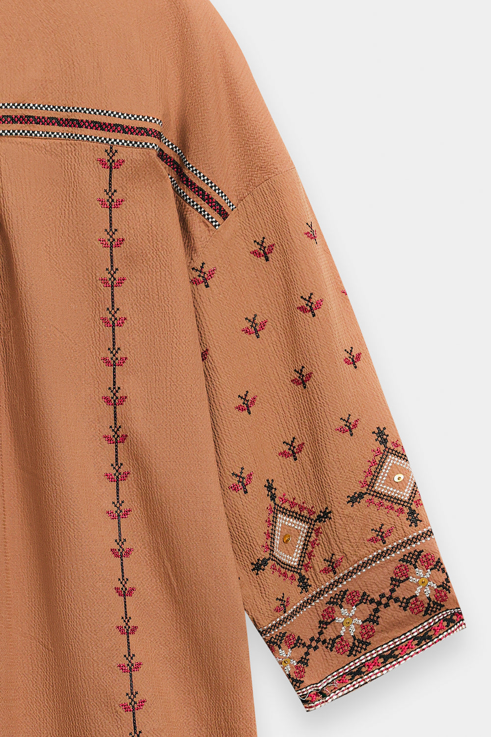 Capture rustic charm in this delightful tan embroidered kurti. This short-length, long-sleeved kurti is crafted from a comfortable, earthy tan fabric and features a casual V-neckline. It is intricately detailed with traditional multi-colored thread embroidery, primarily in blue, red, and gold, adorning the yoke, shoulders, and cuffs. The relaxed fit and detailed embellishment make this top a perfect choice for an elevated, comfortable daily or semi-formal look. Pair it with black tulip trousers or matching straight pants for a polished finish.
