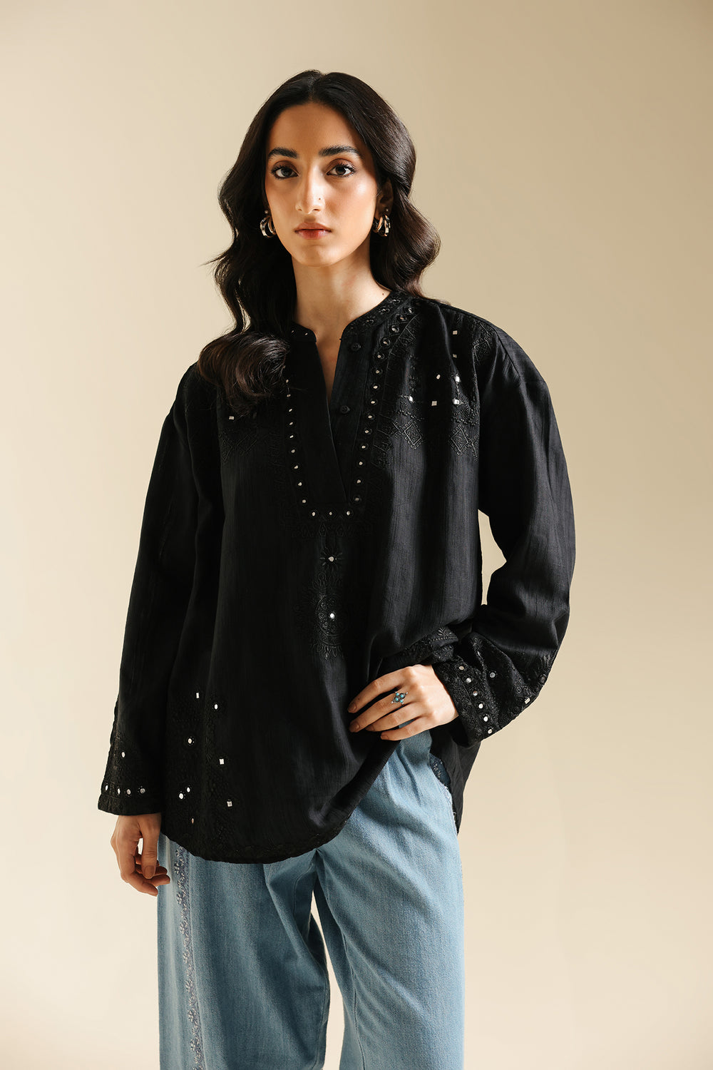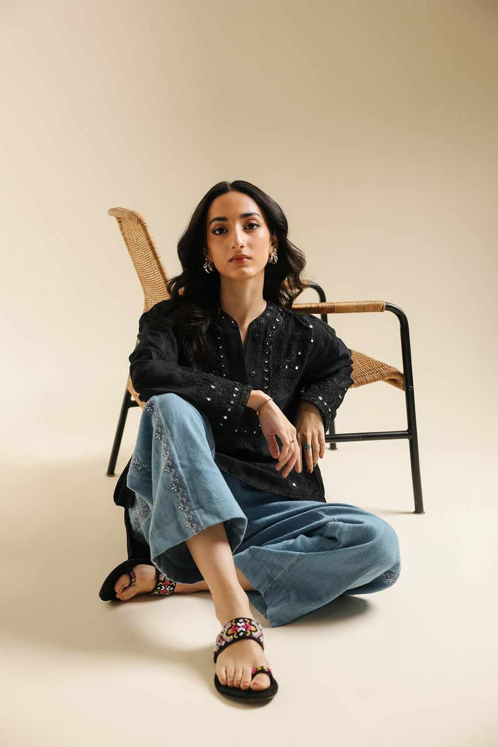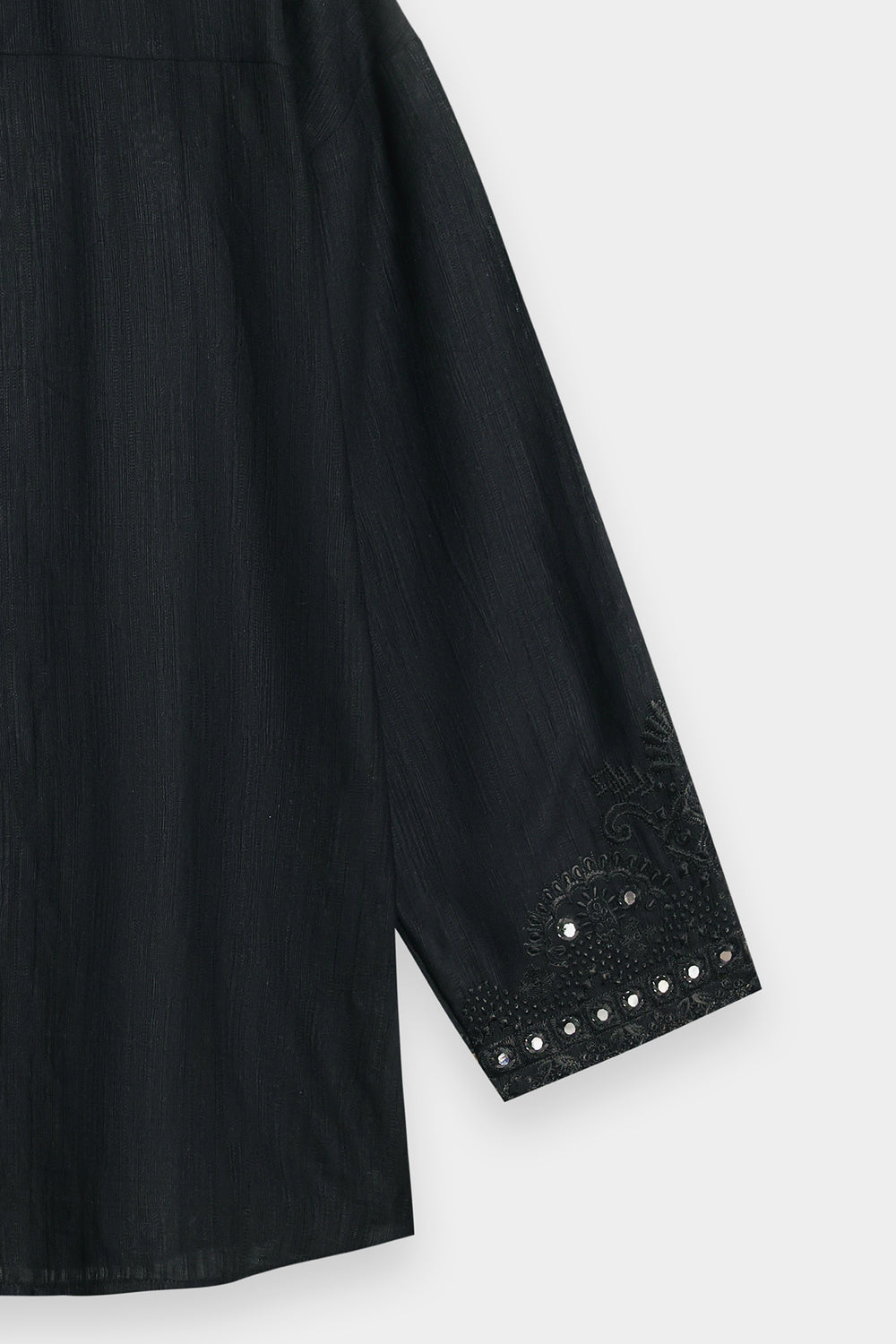 Adorn yourself in this striking black kurti, a perfect blend of modern style and traditional artistry. This top features intricate embroidery and shimmering mirror work around the neckline and on the sleeves, creating a captivating design. The relaxed fit ensures comfort while the elaborate detailing makes it a showstopper. Perfect for a festive occasion or a chic evening out, this kurti is sure to make a statement.