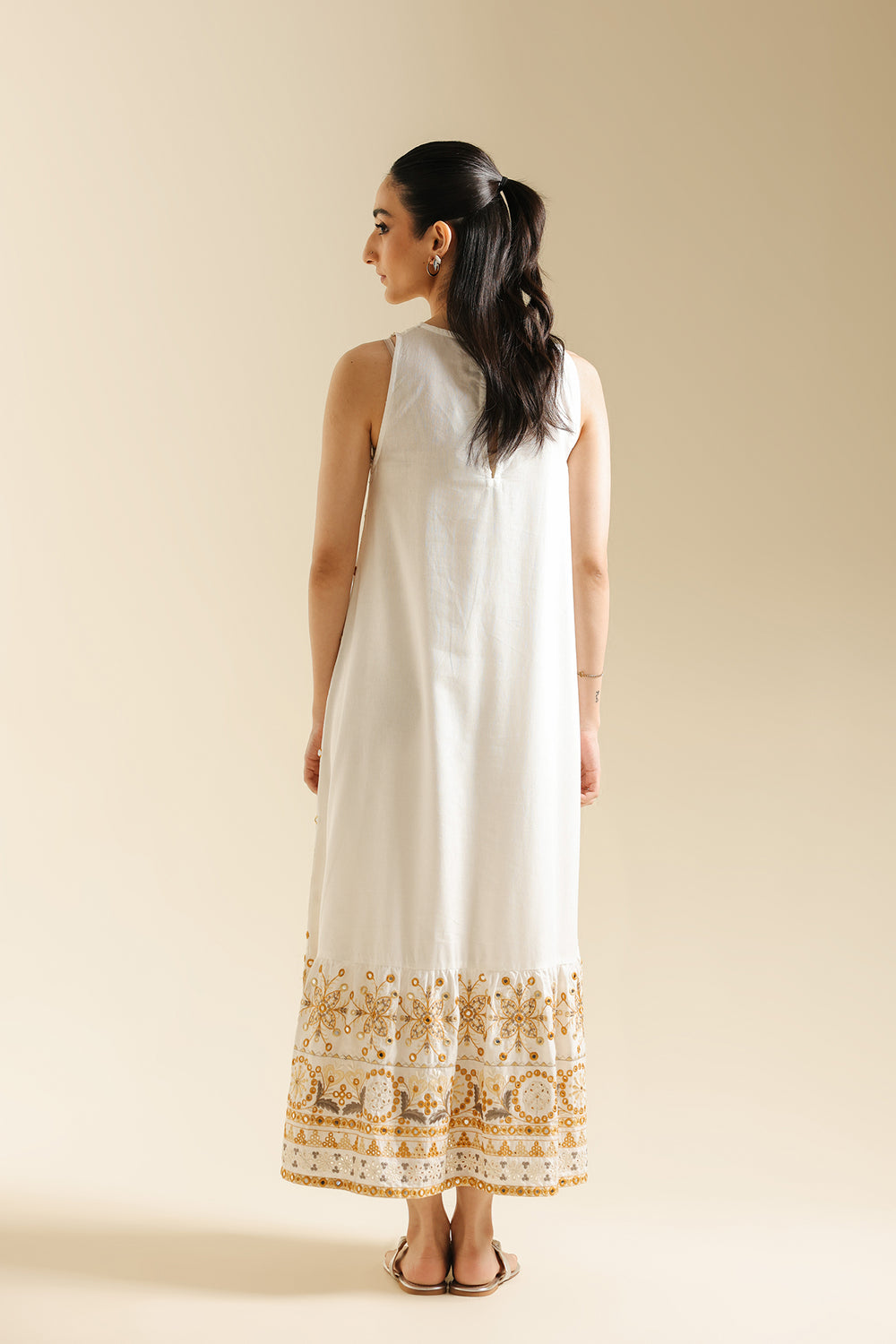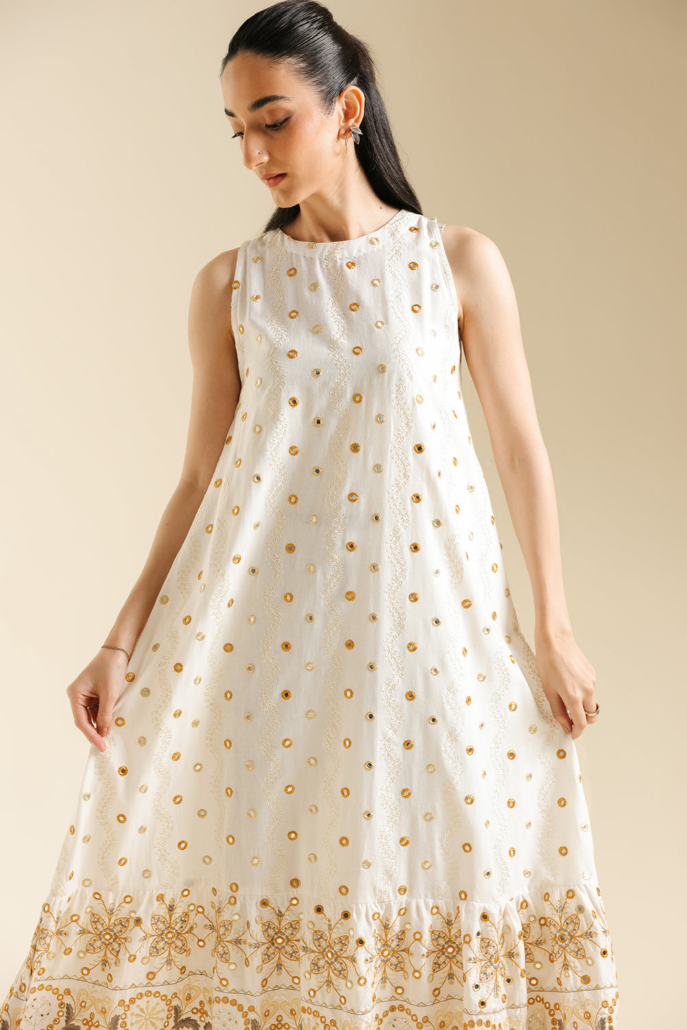 Radiate golden light in this ethereal white embroidered dress. This long, sleeveless dress is crafted from a pristine white fabric and features a delicate, subtle all-over gold mirror work detail. The skirt finishes with a gorgeous, intricate embroidered border in shades of gold and bronze, creating a lovely, flared effect. The round neckline and flowing silhouette make this a perfect piece for stylish, comfortable summer dressing.