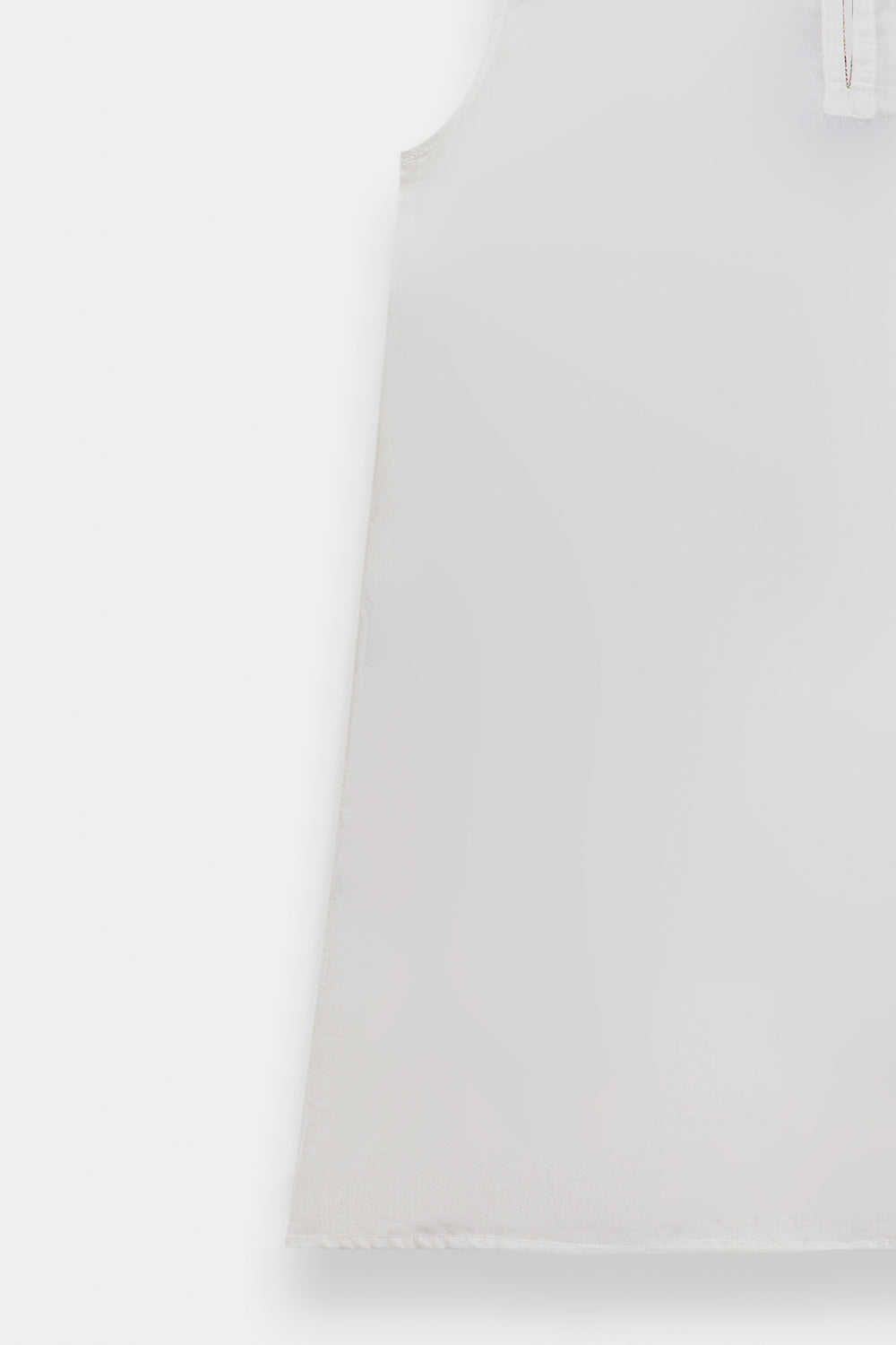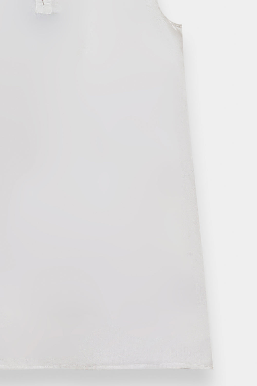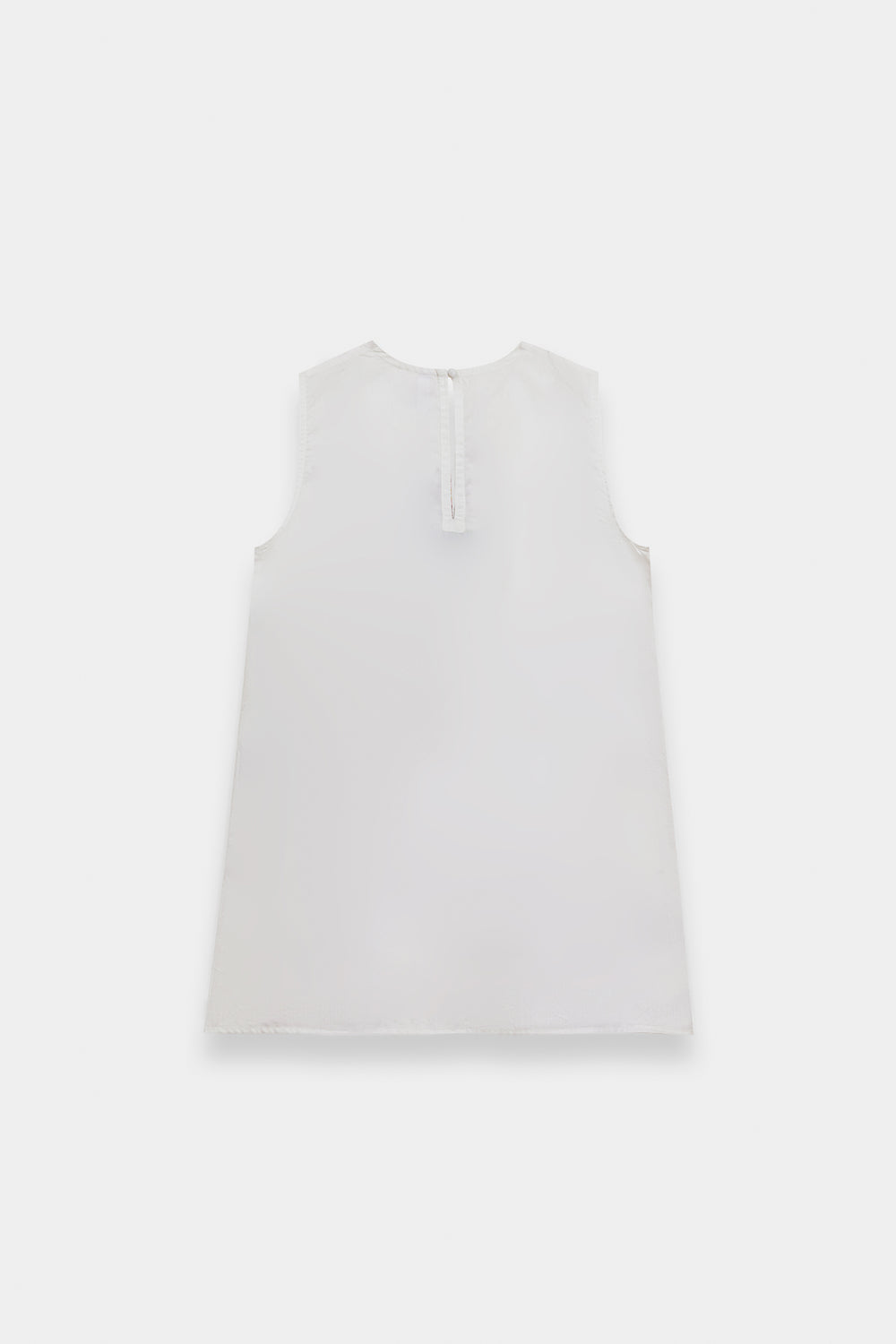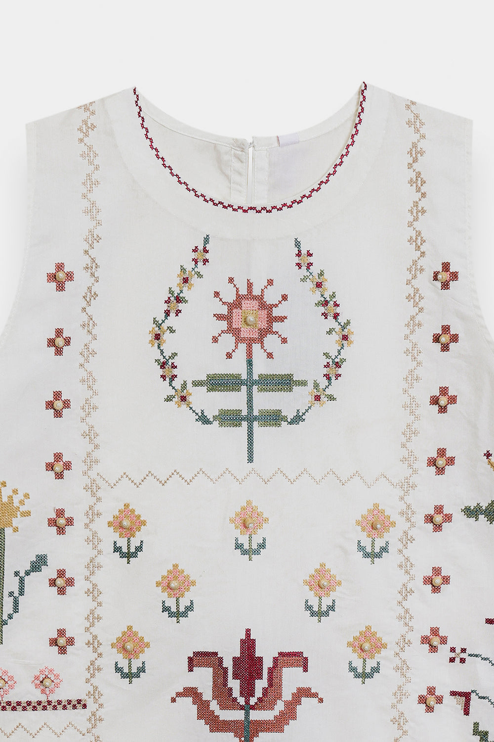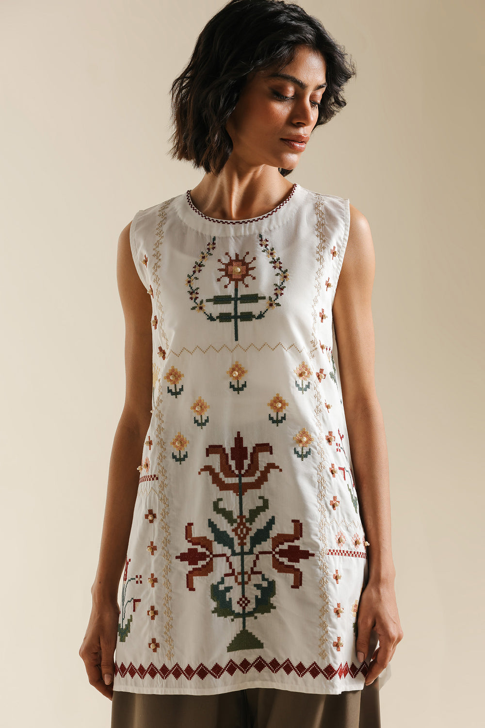 Radiate an effortless, artistic charm in this sleeveless white shirt, featuring a contemporary straight silhouette. The piece is designed with a simple rounded neckline and serves as a canvas for striking geometric floral embroidery. The central embroidery features stylized, symmetrical floral motifs in earthy tones of terracotta, sage green, and muted ochre. Delicate cross-stitch patterns and small floral sprays are scattered across the front, while a bold geometric border finishes the hemline. This shirt offers a perfect blend of modern minimalism and traditional craftsmanship.