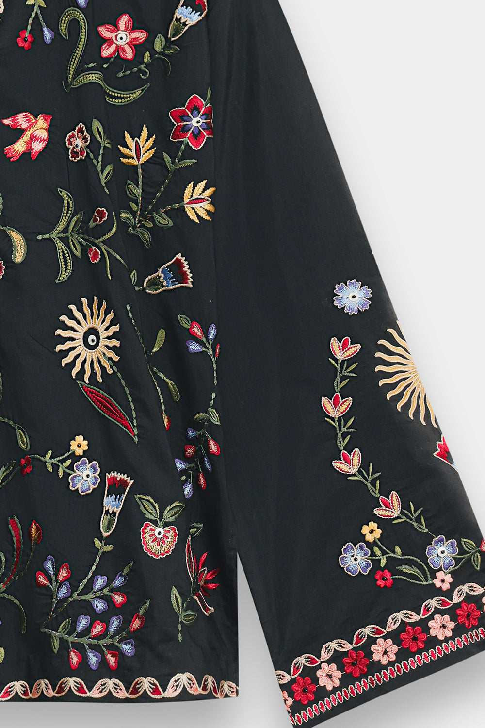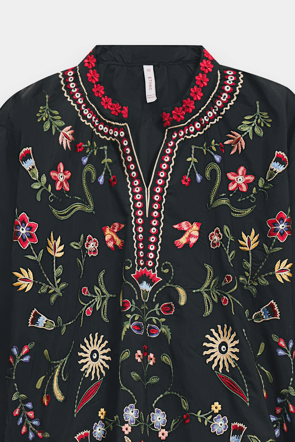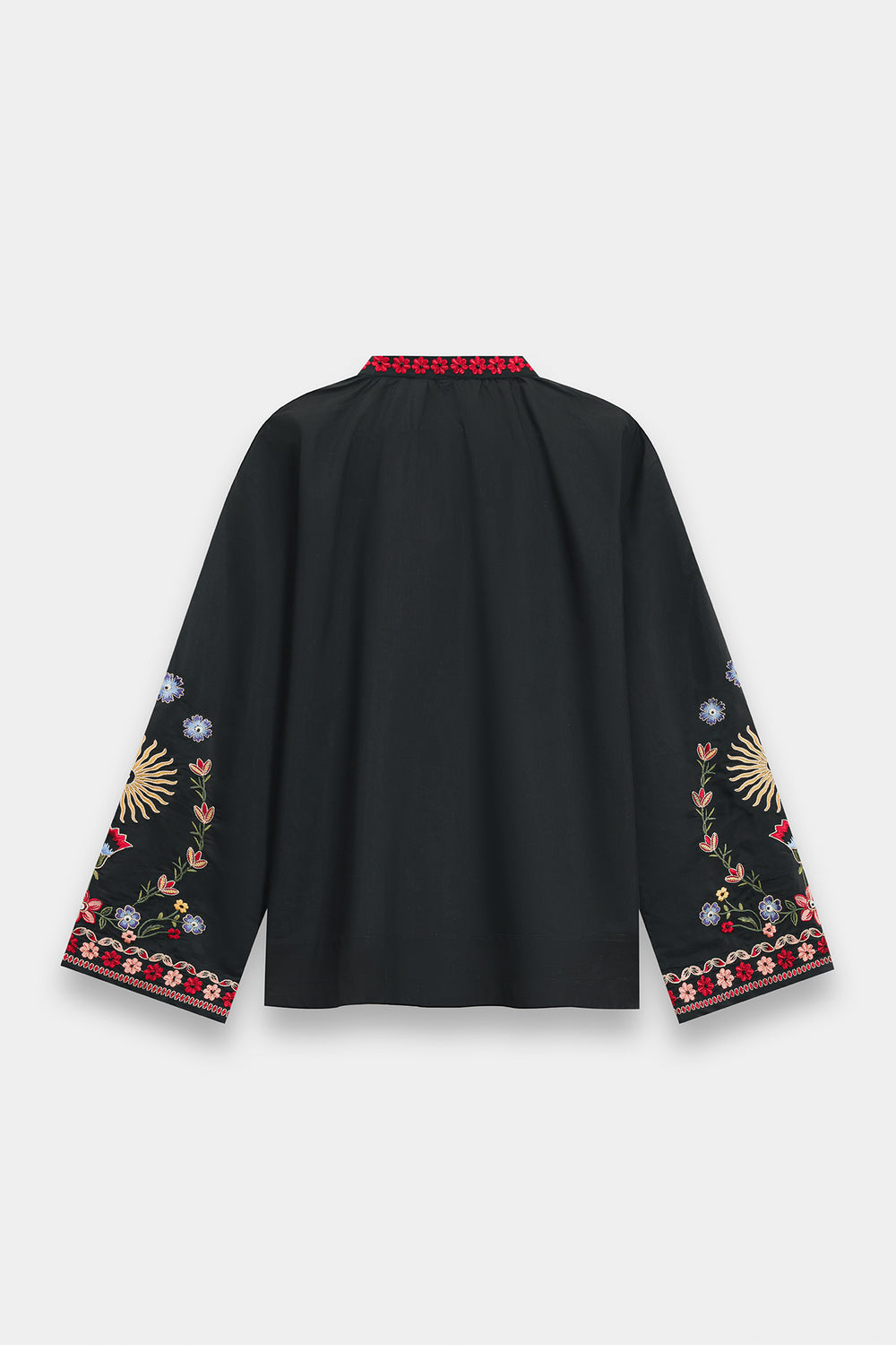 Exude an air of mystical elegance with this black shirt, featuring a straight-cut silhouette and vibrant, artisanal embroidery. The design is centered around a split V-neckline adorned with a bold red and ivory patterned border, which extends down the bodice. Intricate needlework in a kaleidoscope of terracotta, emerald, and sky blue depicts whimsical floral sprays, soaring birds, and radiant sun motifs across the front and wide sleeves. This ornamental display is framed by a delicate, multi-toned floral border along the hem and cuffs, creating a striking contrast against the dark fabric.