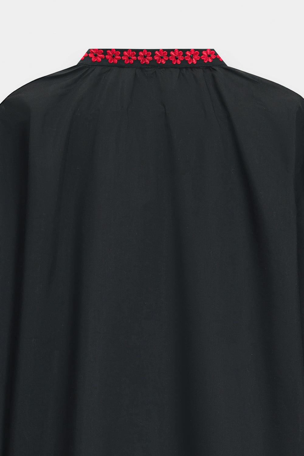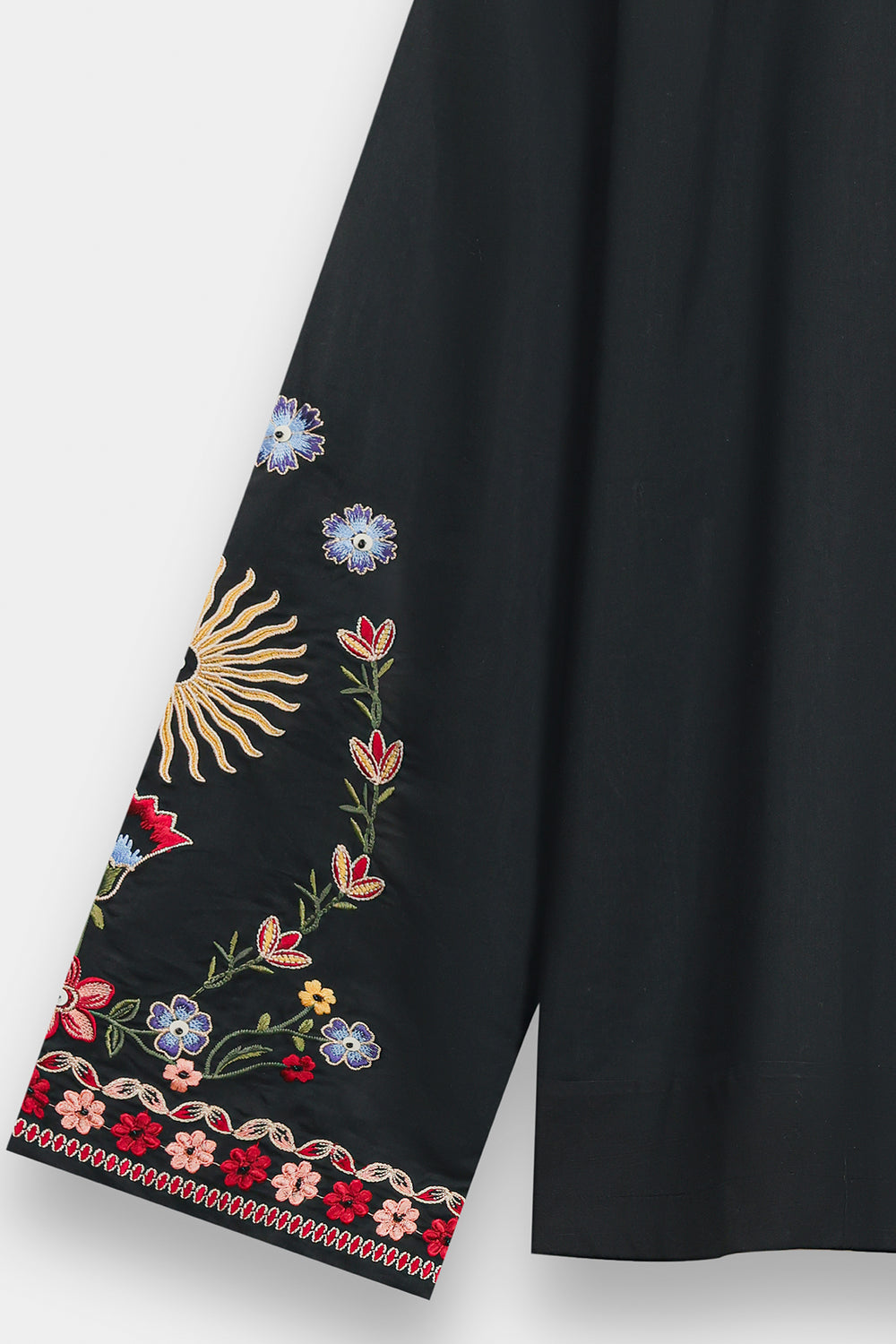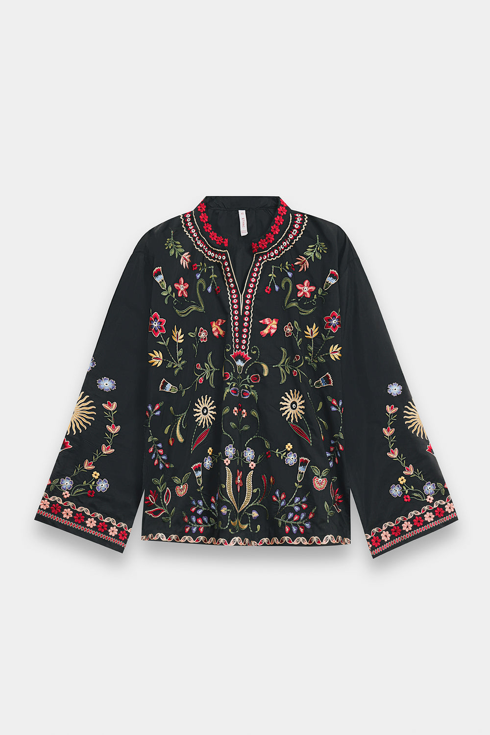 Exude an air of mystical elegance with this black shirt, featuring a straight-cut silhouette and vibrant, artisanal embroidery. The design is centered around a split V-neckline adorned with a bold red and ivory patterned border, which extends down the bodice. Intricate needlework in a kaleidoscope of terracotta, emerald, and sky blue depicts whimsical floral sprays, soaring birds, and radiant sun motifs across the front and wide sleeves. This ornamental display is framed by a delicate, multi-toned floral border along the hem and cuffs, creating a striking contrast against the dark fabric.