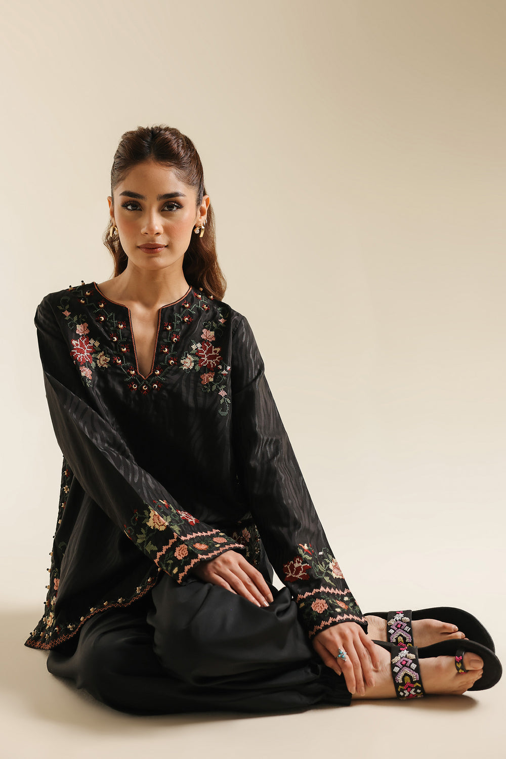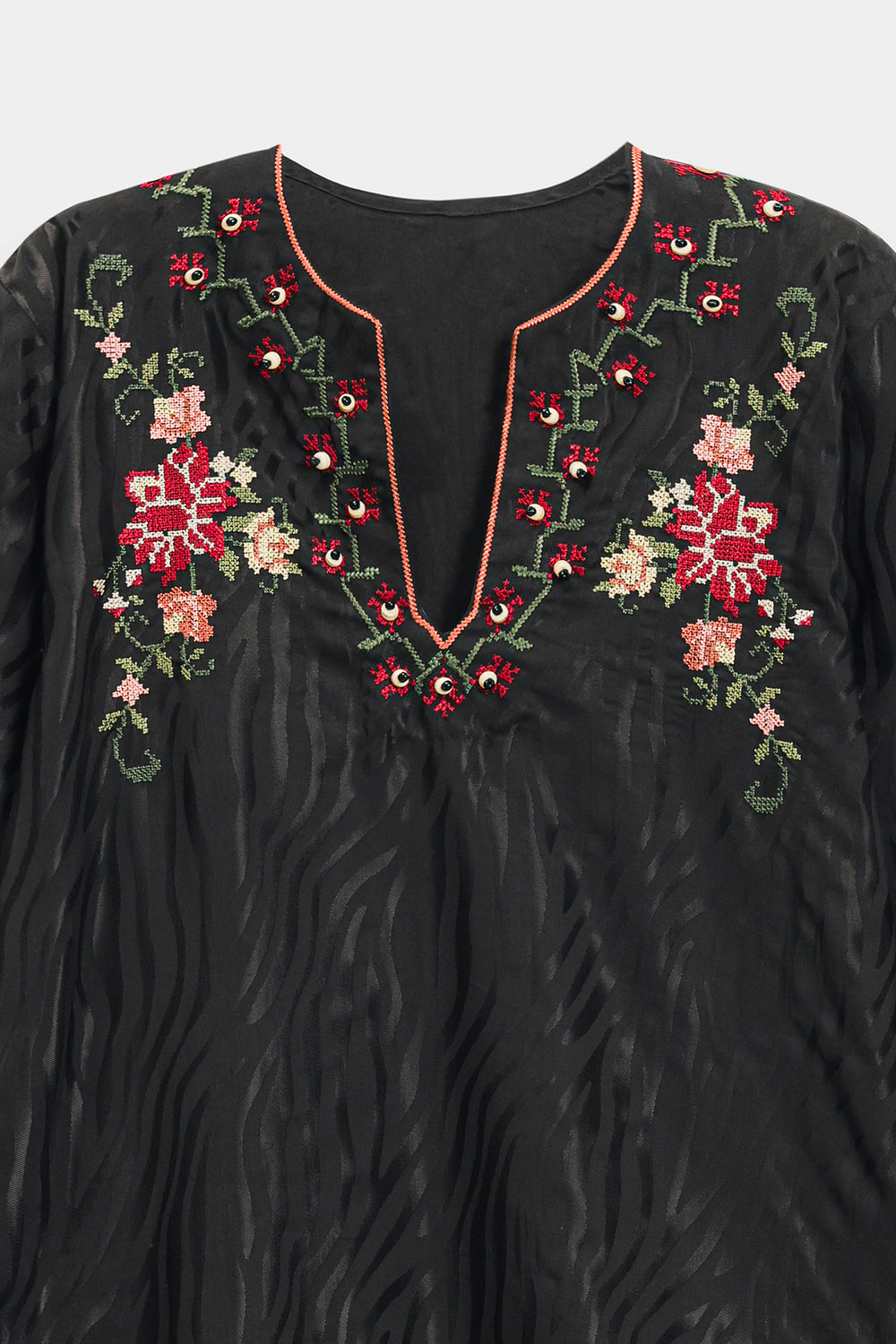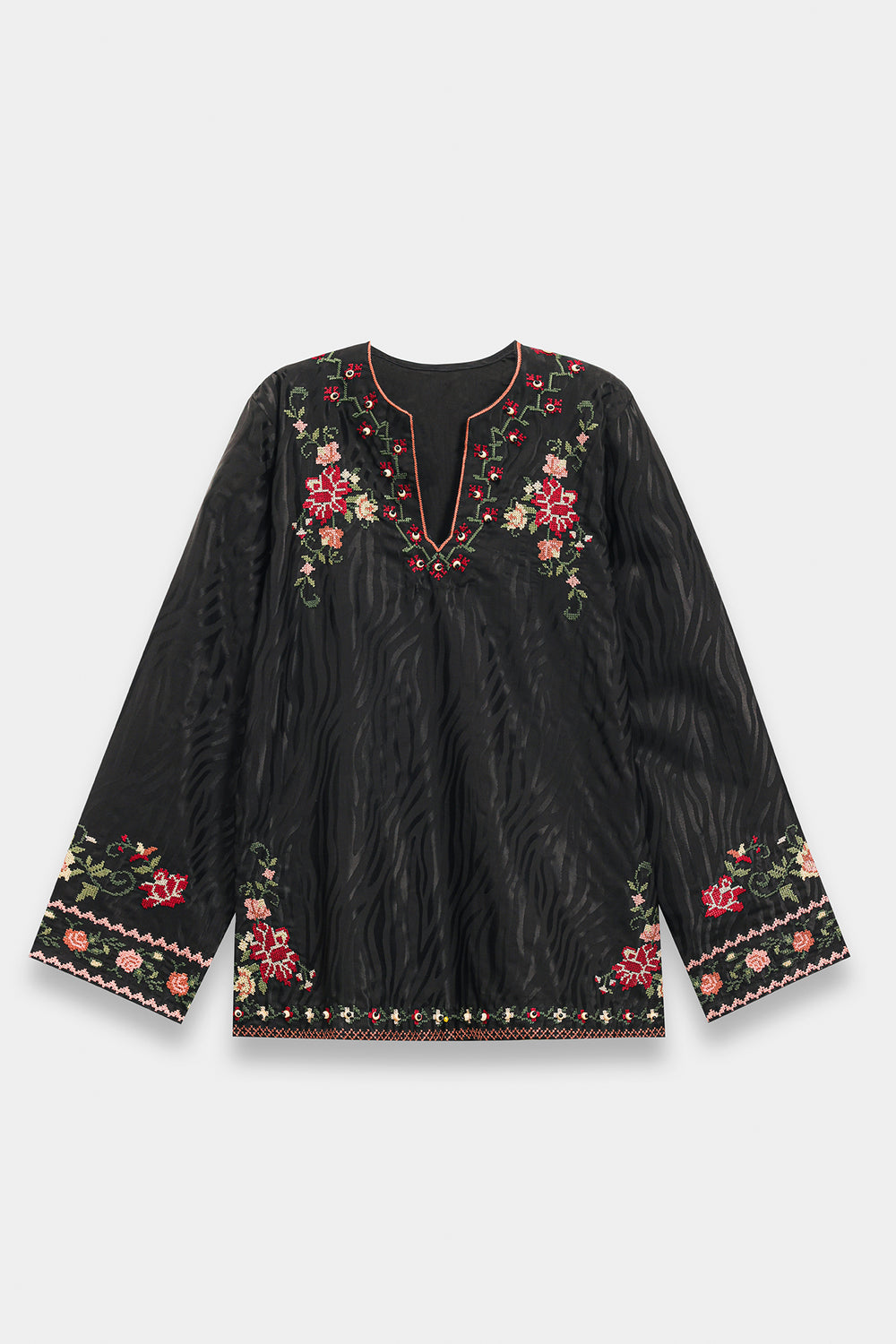 Elevate your daily elegance with this jet black tunic, a piece that beautifully marries traditional needlework with a contemporary silhouette. Crafted from a premium, smooth fabric, the shirt features a sophisticated V-split neckline adorned with delicate floral embroidery in shades of rust, peach, and sage. The artistic craftsmanship continues across the lower bodice with a graceful, curved vine motif and a meticulously detailed hemline border. Wide, full-length sleeves are finished with coordinating embroidered cuffs, enhancing the garment's polished look. This one-piece shirt is styled here with wide-leg trousers for a chic, earthy contrast that is perfect for both casual and semi-formal occasions.