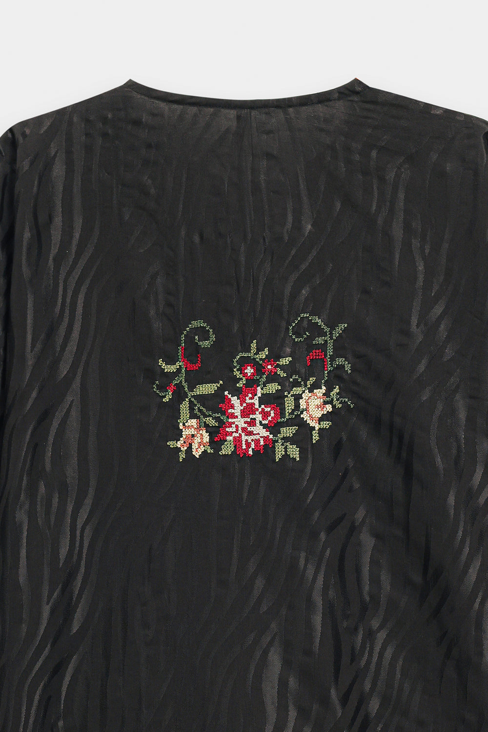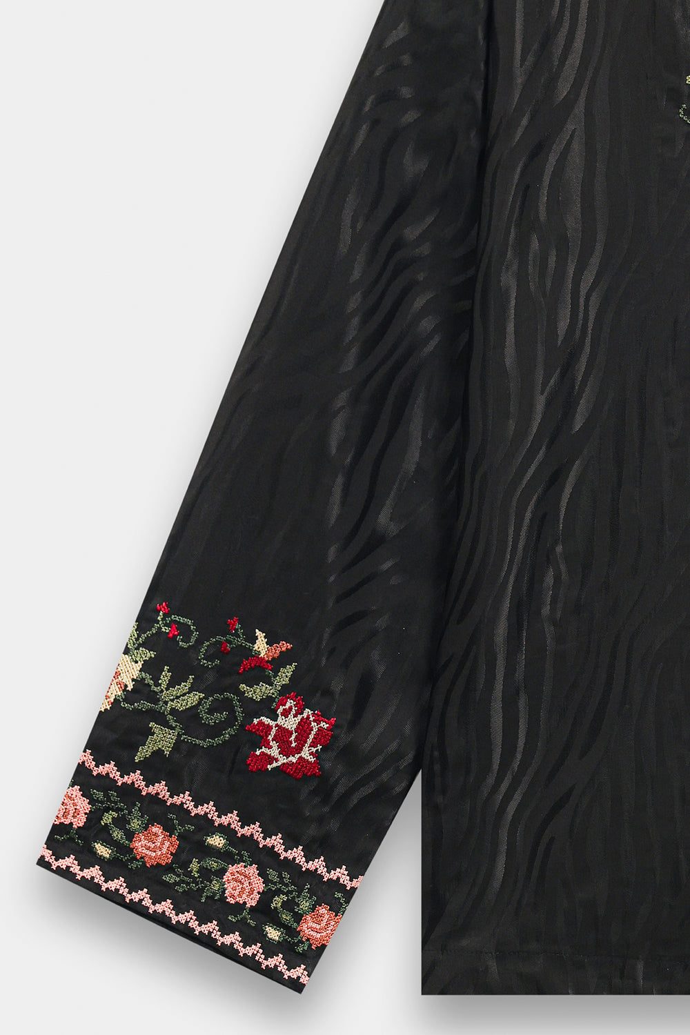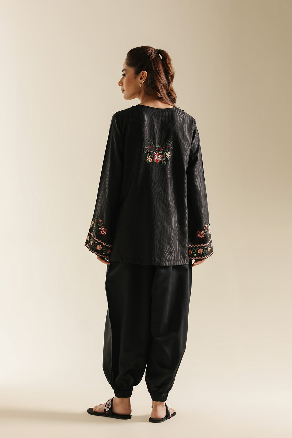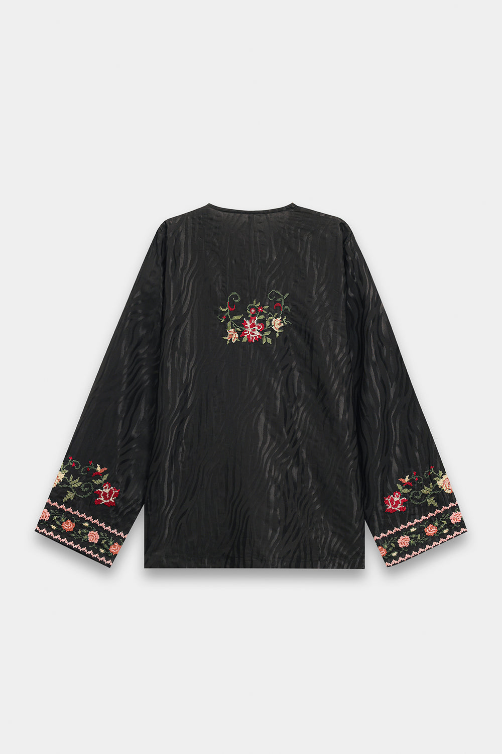 Elevate your daily elegance with this jet black tunic, a piece that beautifully marries traditional needlework with a contemporary silhouette. Crafted from a premium, smooth fabric, the shirt features a sophisticated V-split neckline adorned with delicate floral embroidery in shades of rust, peach, and sage. The artistic craftsmanship continues across the lower bodice with a graceful, curved vine motif and a meticulously detailed hemline border. Wide, full-length sleeves are finished with coordinating embroidered cuffs, enhancing the garment's polished look. This one-piece shirt is styled here with wide-leg trousers for a chic, earthy contrast that is perfect for both casual and semi-formal occasions.