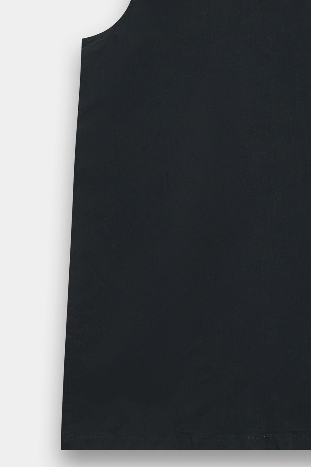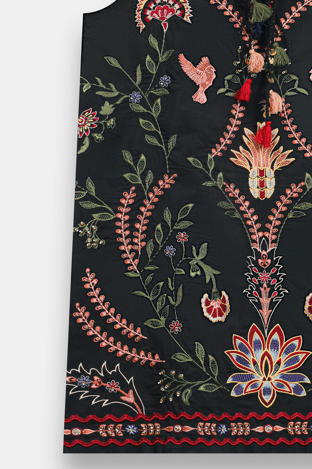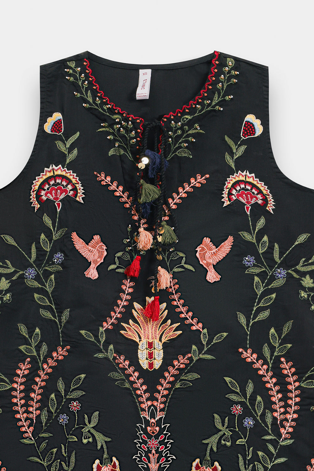 Make a whimsical and artistic statement in this sleeveless black embroidered shirt, featuring a nature-inspired tapestry. The piece is designed with a delicate round neckline and a split front accented by colorful tassels and beadwork. The shirt is lavishly adorned with intricate embroidery, showcasing playful birds in soft pink, blooming lotuses, and trailing floral vines in shades of terracotta and teal. Finished with a vibrant, multi-layered embroidered border at the hem, this shirt offers a perfect blend of modern silhouette and traditional craftsmanship.