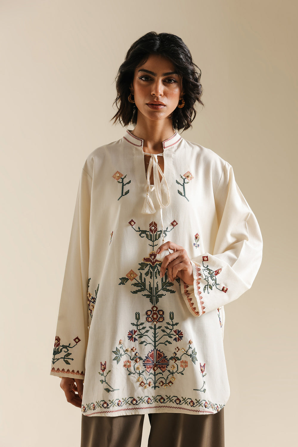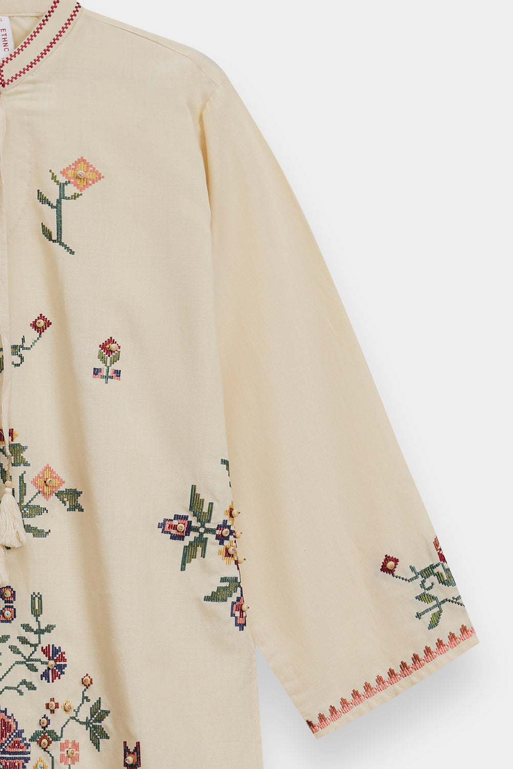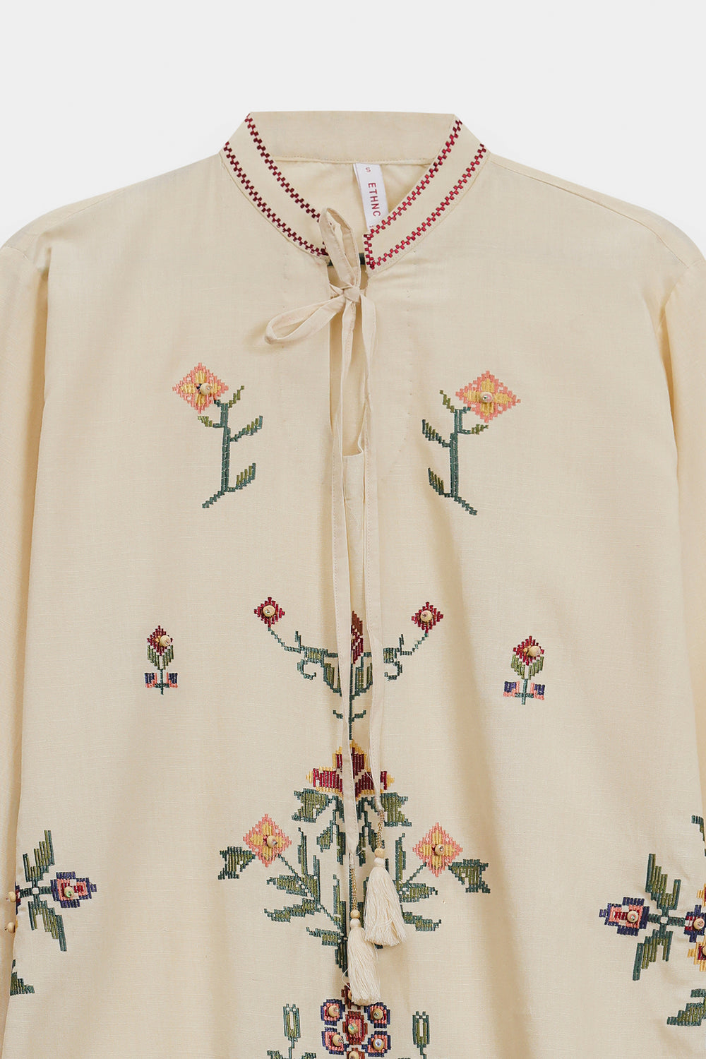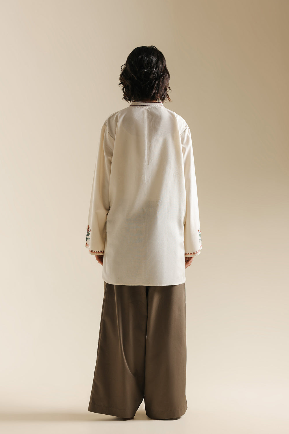 This off-white kurti is a refined blend of traditional botanical motifs and modern design elements. Crafted from a premium, smooth fabric, the shirt features a sophisticated mandarin collar with a delicate tie-up tassel detail at the neckline. The front panel is beautifully adorned with vertically arranged floral embroidery in earthy sage, rust, and mustard tones, complemented by intricate needlework along the hem and sleeve cuffs. With its relaxed, straight-cut silhouette and full-length sleeves, this one-piece tunic offers a timeless and elegant look. It is styled here with voluminous olive-brown wide-leg trousers for a contemporary, chic finish.