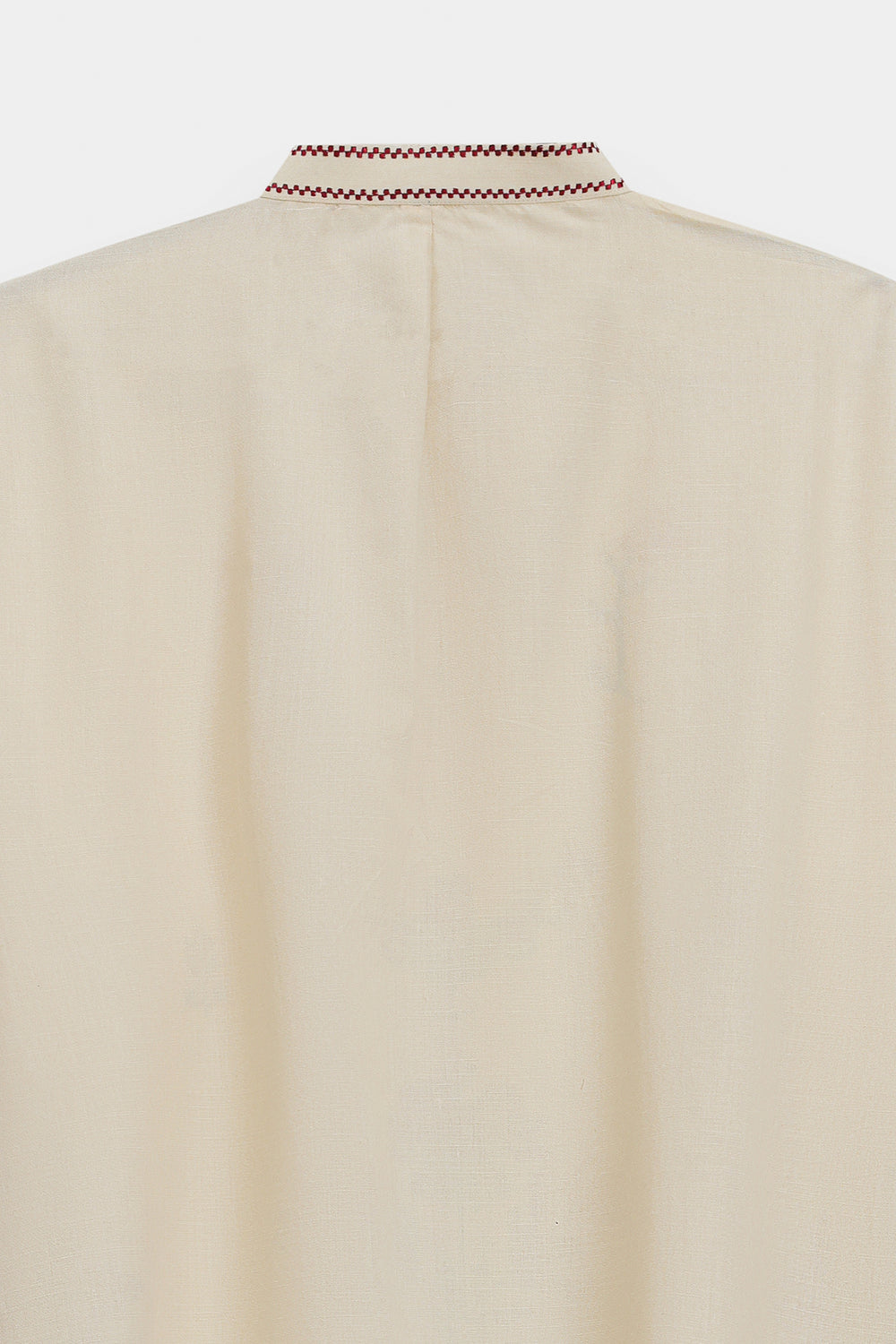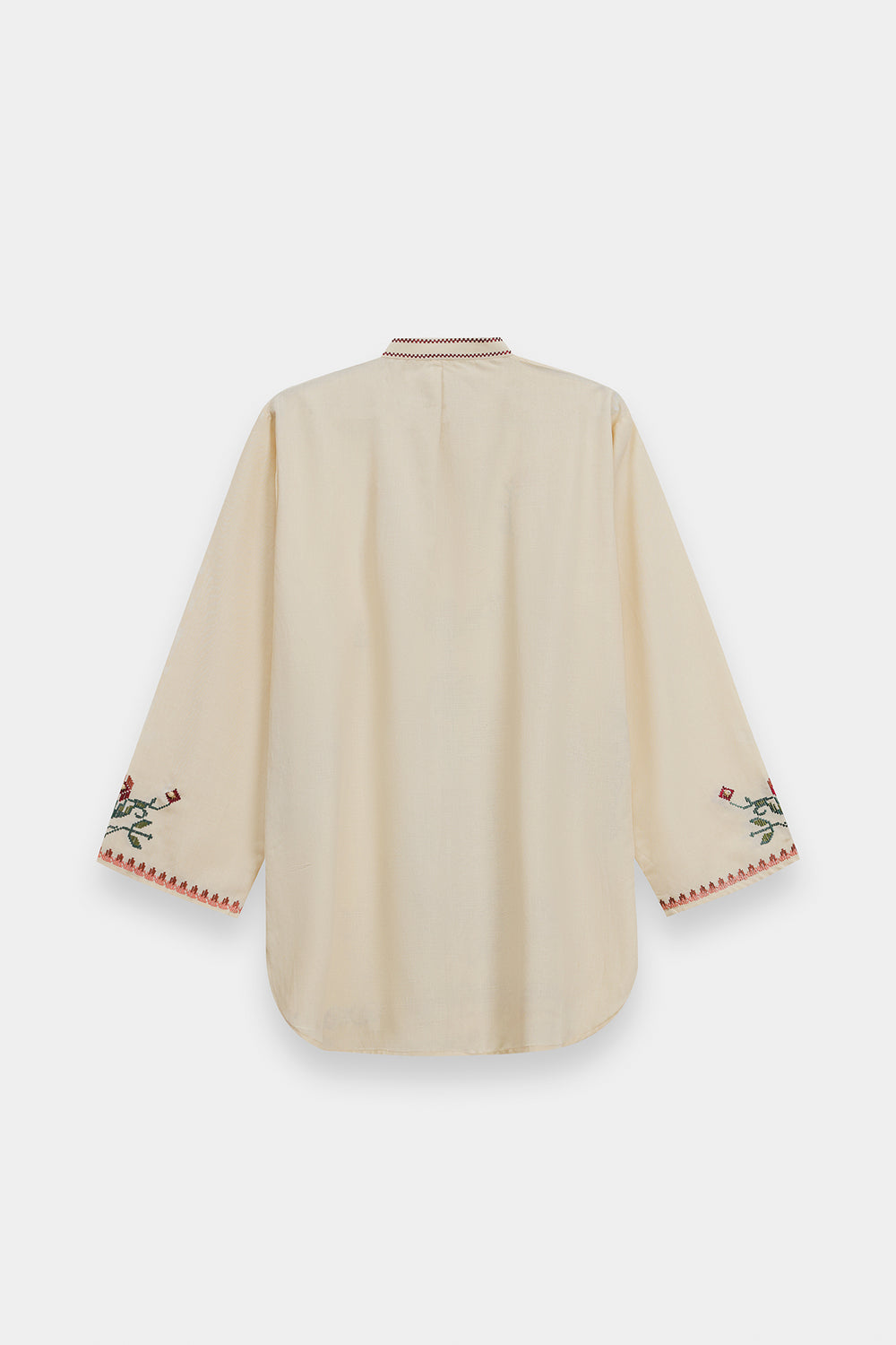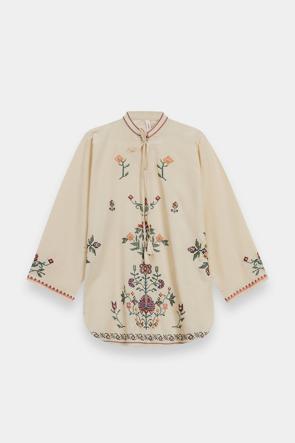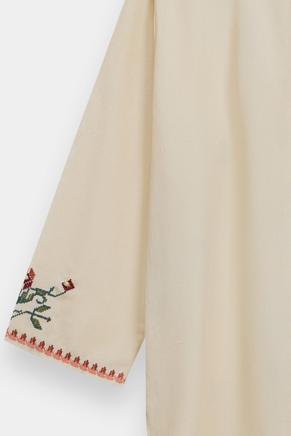 This off-white kurti is a refined blend of traditional botanical motifs and modern design elements. Crafted from a premium, smooth fabric, the shirt features a sophisticated mandarin collar with a delicate tie-up tassel detail at the neckline. The front panel is beautifully adorned with vertically arranged floral embroidery in earthy sage, rust, and mustard tones, complemented by intricate needlework along the hem and sleeve cuffs. With its relaxed, straight-cut silhouette and full-length sleeves, this one-piece tunic offers a timeless and elegant look. It is styled here with voluminous olive-brown wide-leg trousers for a contemporary, chic finish.