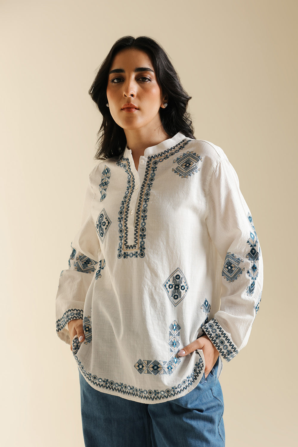 Bring an effortless, artisanal charm to your casual wardrobe with this crisp white embroidered shirt. This straight-cut kurti is made from a breathable white fabric and features beautiful, intricate blue thread embroidery in a traditional geometric pattern across the yoke, neckline, and full-length sleeves. The contrasting blue embroidery creates a striking visual appeal against the clean white base. Pair it with distressed denim or flowy indigo trousers for a chic, contemporary look.