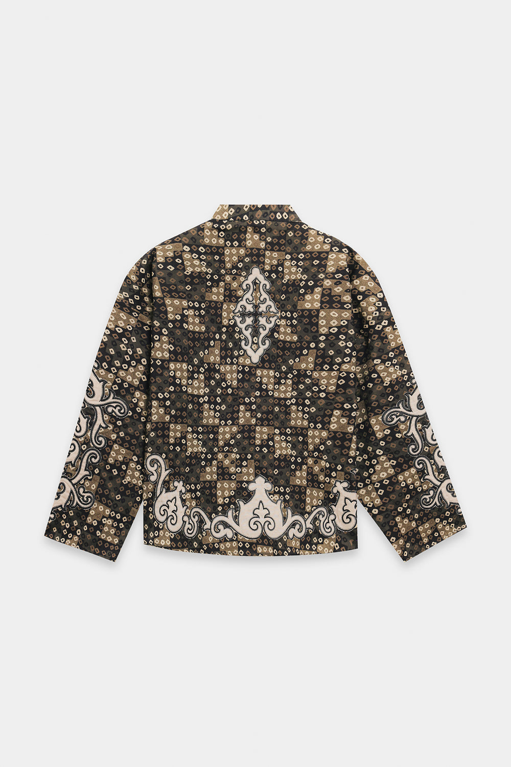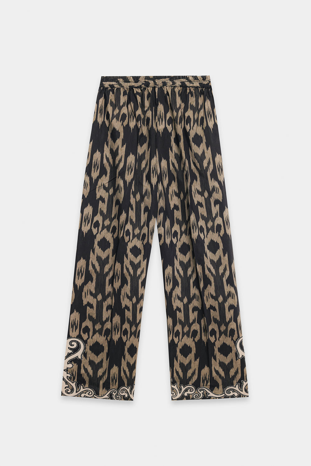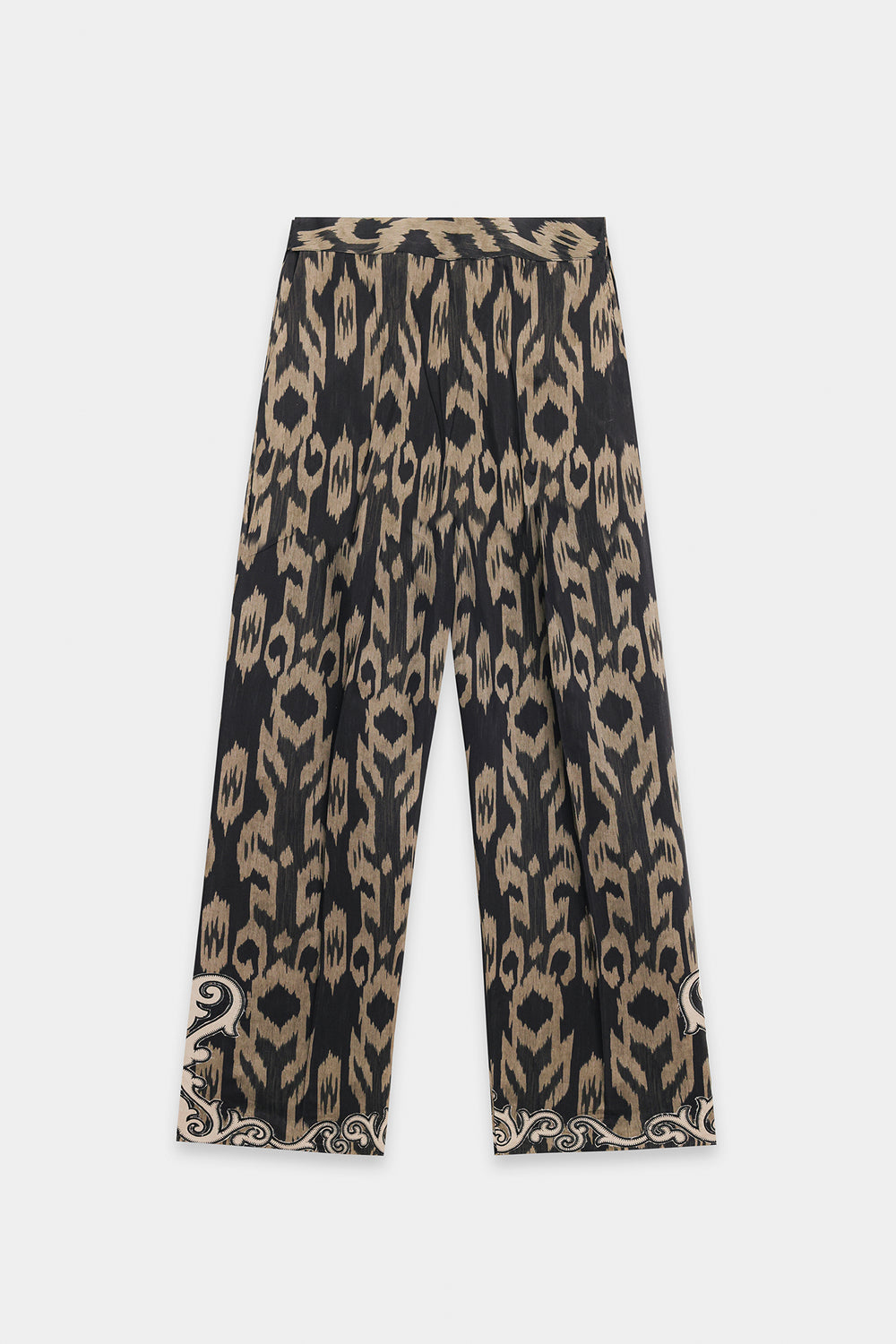 Command attention in this striking monotone ensemble featuring a relaxed-fit shirt and matching straight trouser. The fabric is entirely covered in a mesmerizing, complex digital print combining black, dark brown, and off-white in an intricate blend of ornamental, ikat, and geometric patterns. The shirt features subtle, contrasting white embroidery around the V-neckline, adding textural detail to the already rich pattern. With its full sleeves and dramatic all-over pattern, this suit offers a sophisticated, contemporary silhouette with a deep, earthy color palette.