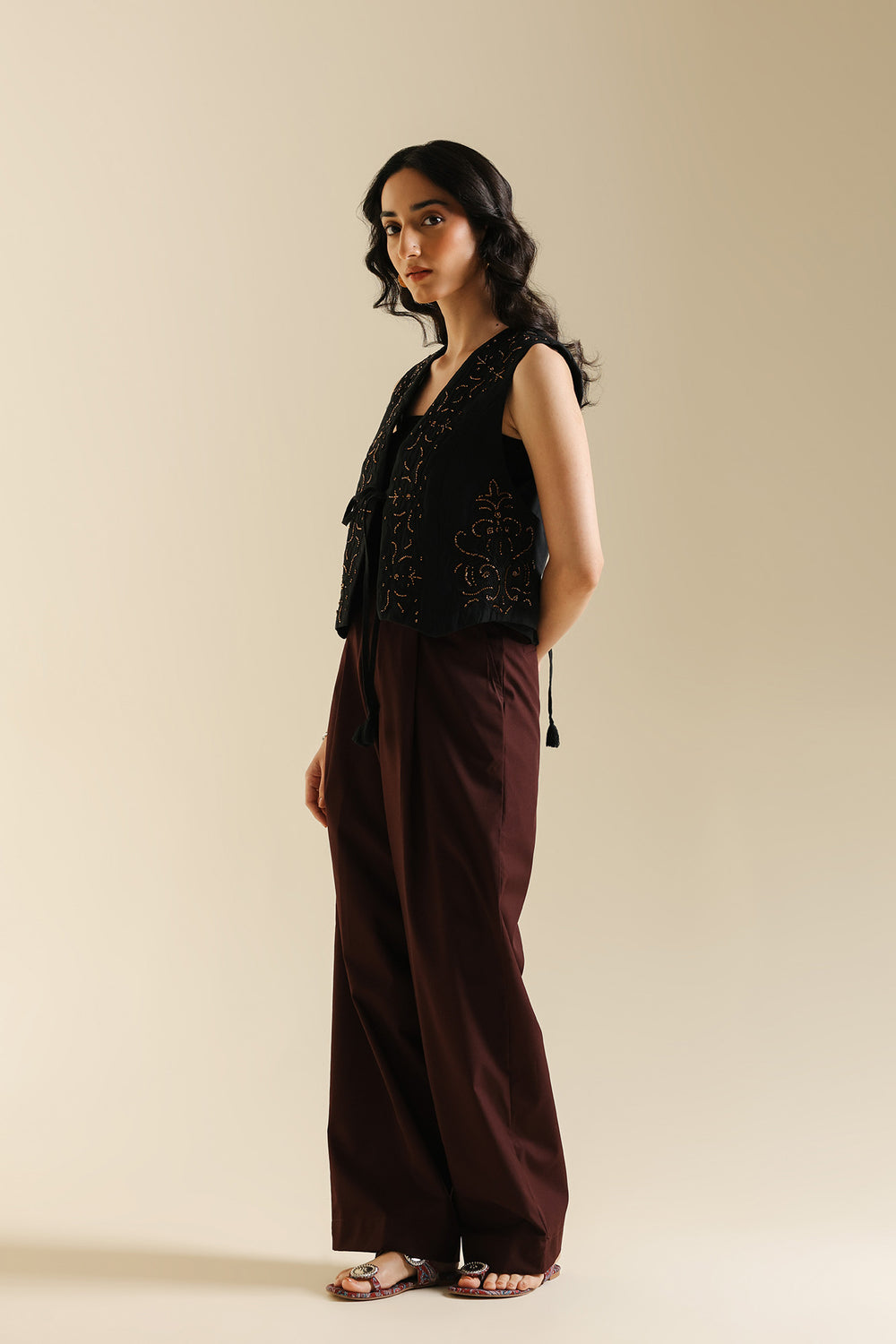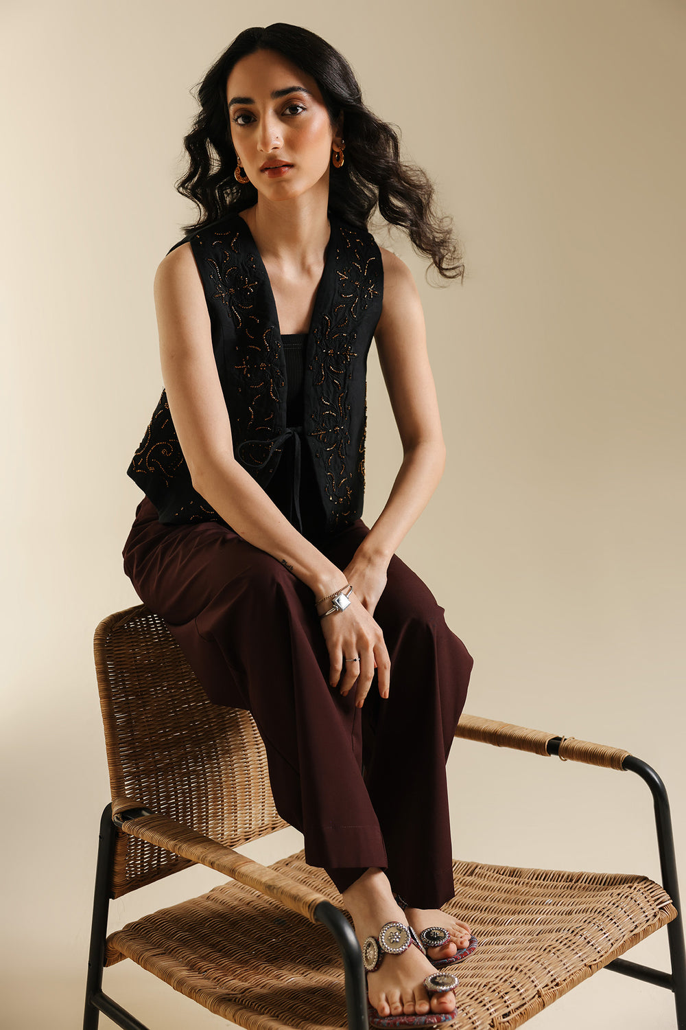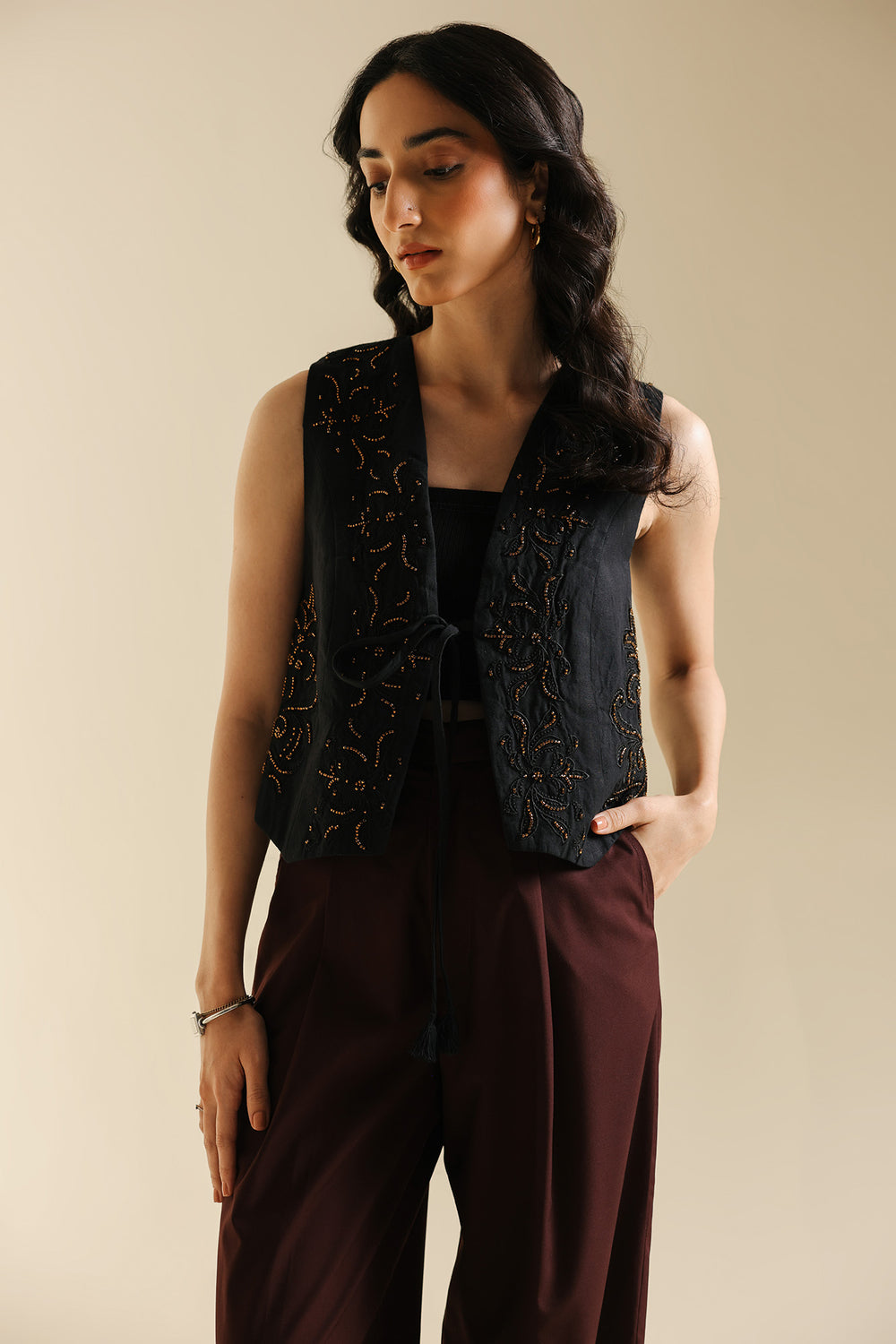 Channel an air of effortless sophistication with this statement waistcoat. This chic layering piece is crafted from a rich, solid black fabric and is beautifully decorated with gold thread embroidery and beadwork. The embellishment is concentrated along the open front and bottom edge, forming delicate floral and vine patterns. Paired elegantly over a black top and wide-leg maroon trouser, this piece is the perfect accessory to instantly elevate any outfit with artisanal texture and deep color.