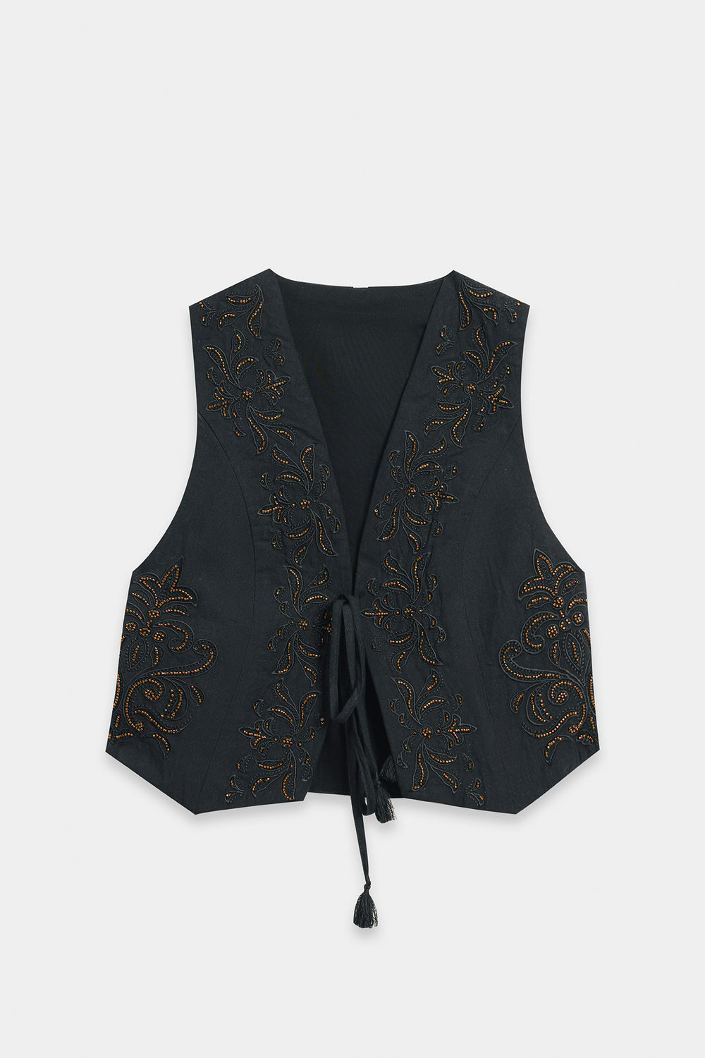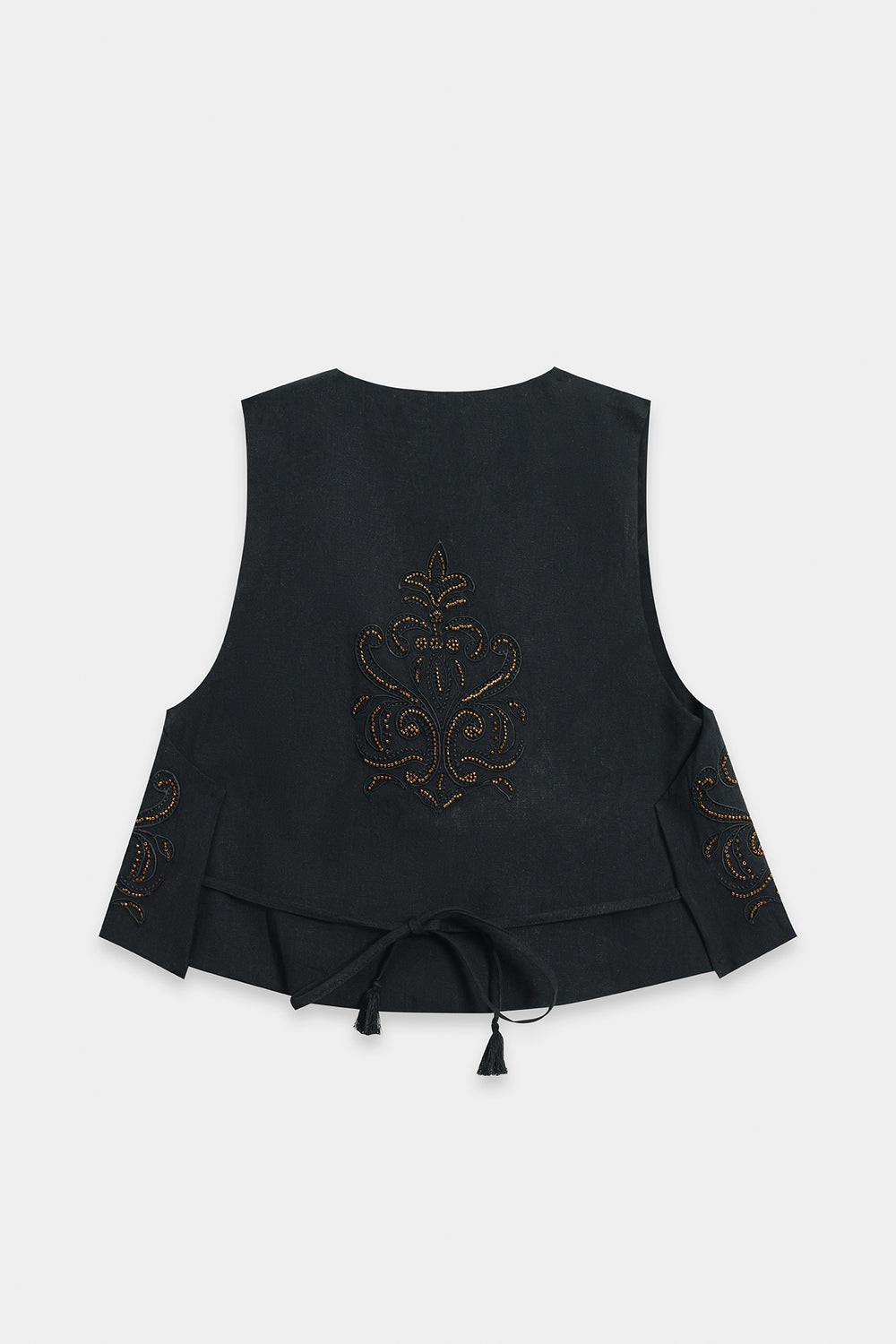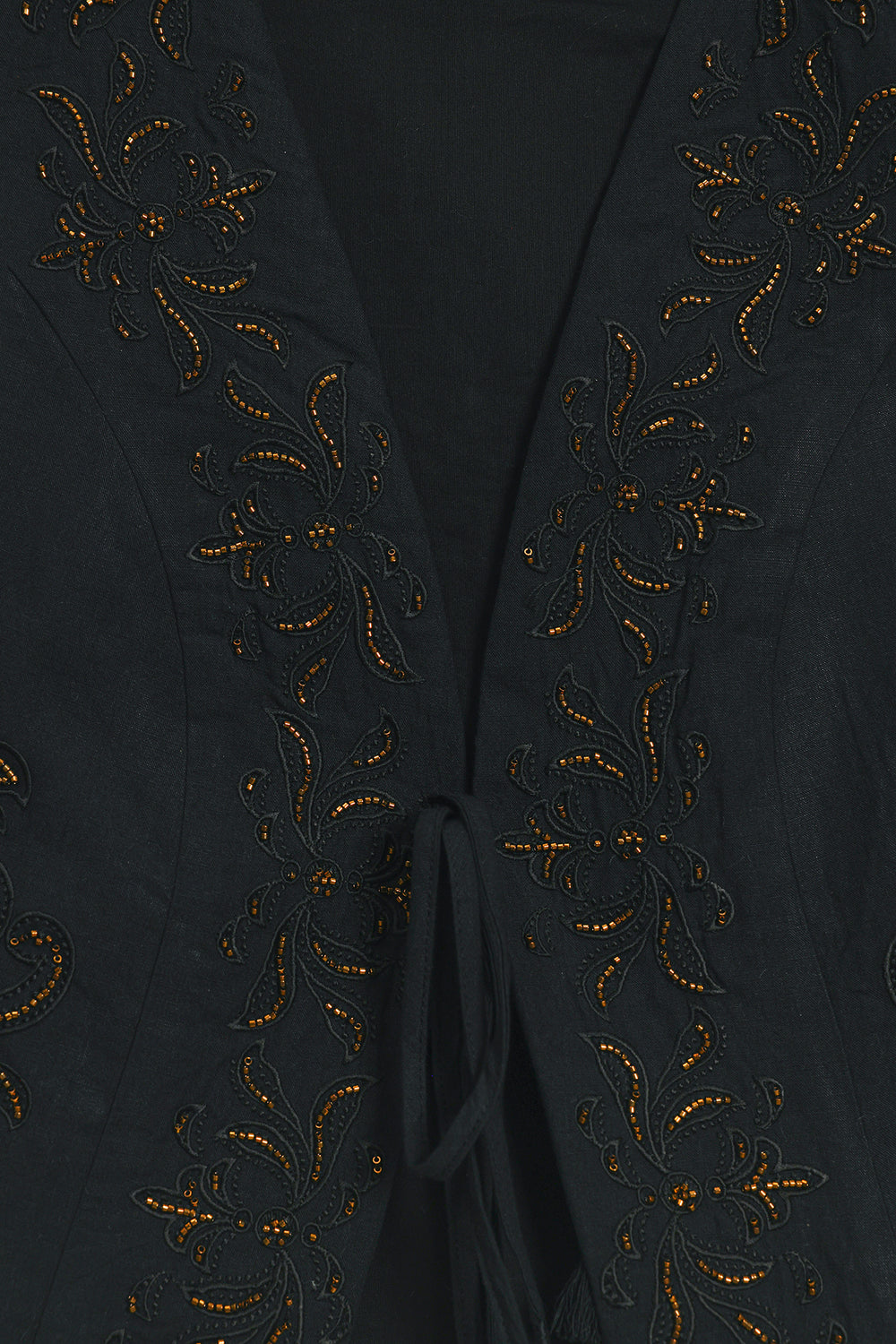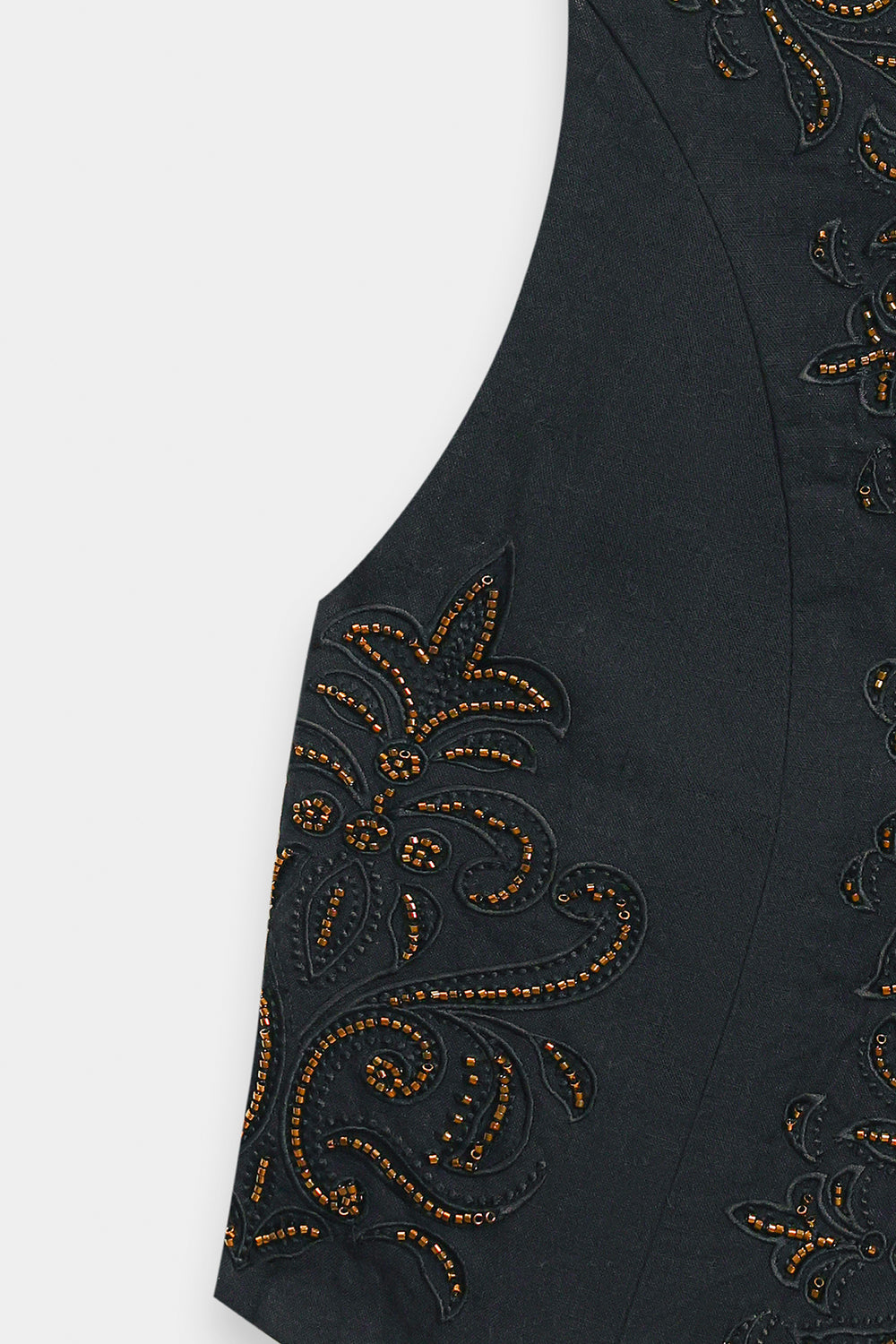 Channel an air of effortless sophistication with this statement waistcoat. This chic layering piece is crafted from a rich, solid black fabric and is beautifully decorated with gold thread embroidery and beadwork. The embellishment is concentrated along the open front and bottom edge, forming delicate floral and vine patterns. Paired elegantly over a black top and wide-leg maroon trouser, this piece is the perfect accessory to instantly elevate any outfit with artisanal texture and deep color.