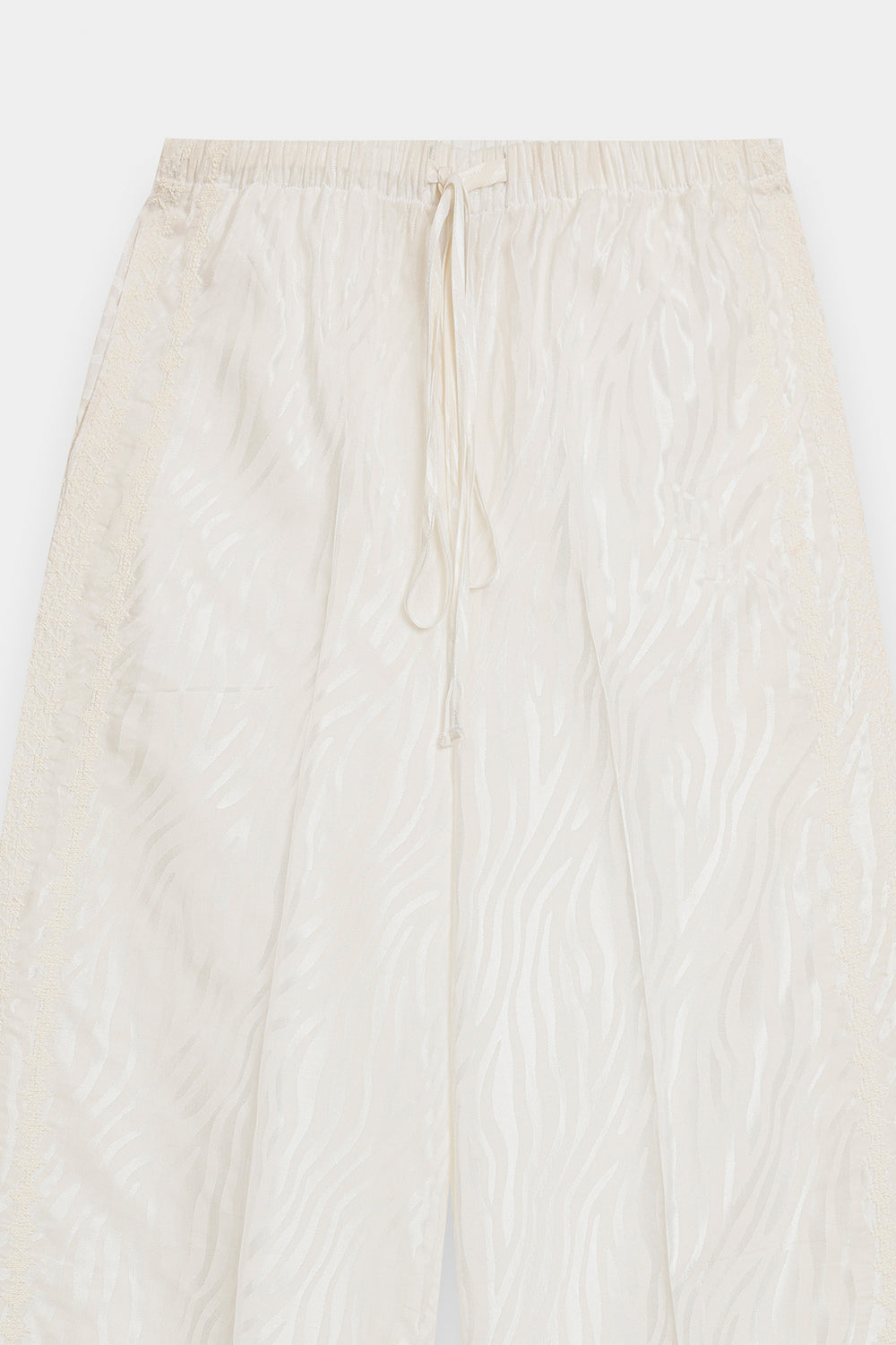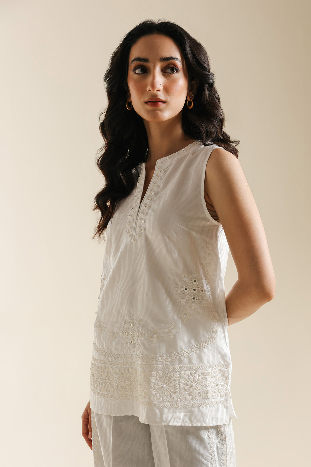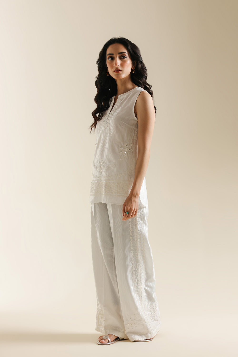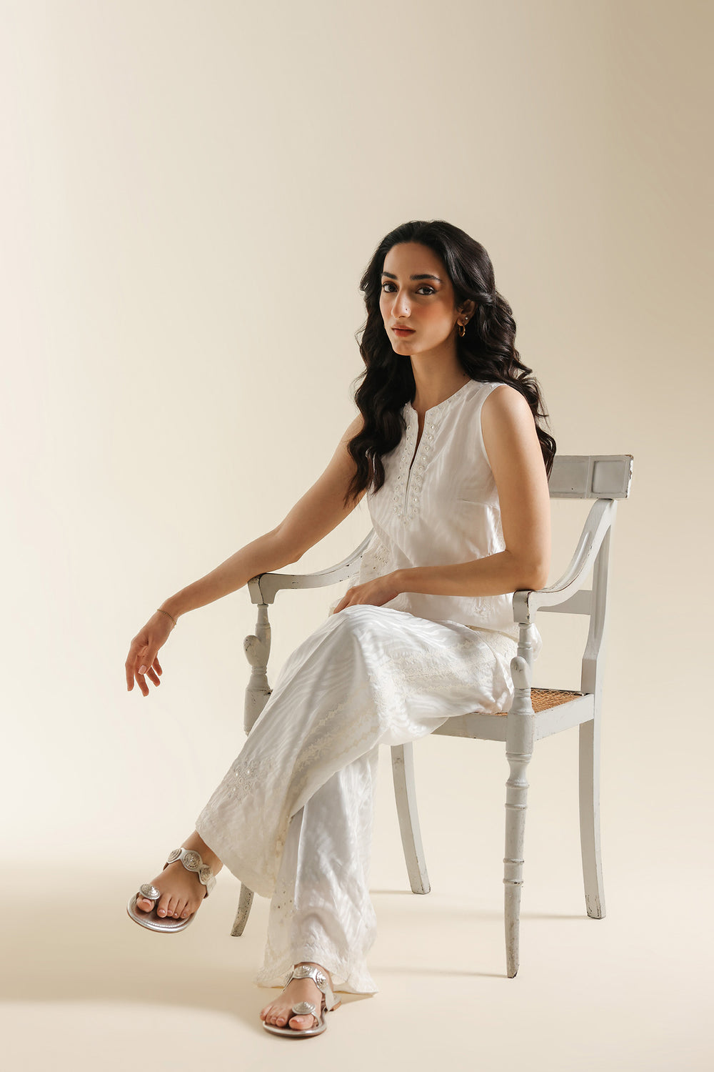 Radiate a serene and ethereal charm with this ivory-white two-piece suit, featuring a sleeveless shirt and coordinated wide-leg trousers. The shirt is designed with a classic split V-neckline and a straight-cut silhouette, crafted from a lustrous fabric with a subtle tonal striped texture. Intricate white-on-white embroidery in delicate floral and geometric patterns adorns the bodice and a wide horizontal panel along the hemline, creating a sophisticated and airy aesthetic. This ensemble is paired with matching voluminous wide-leg trousers that feature delicate needlework along the ankles to complete the monochromatic, refined look.