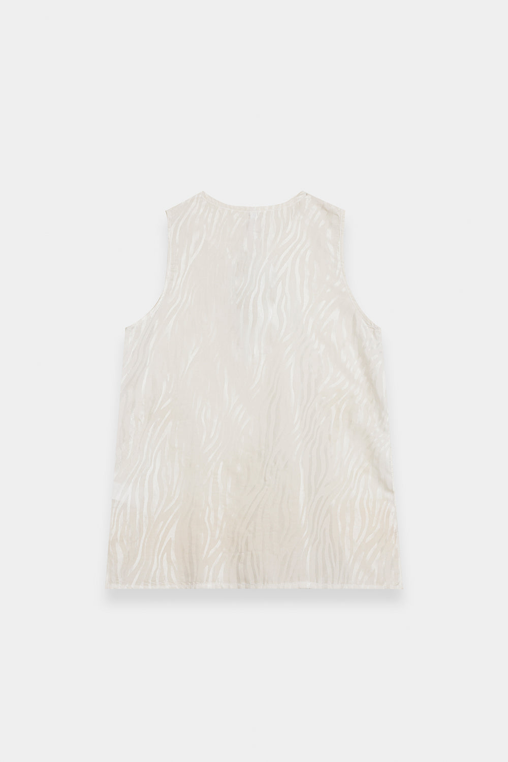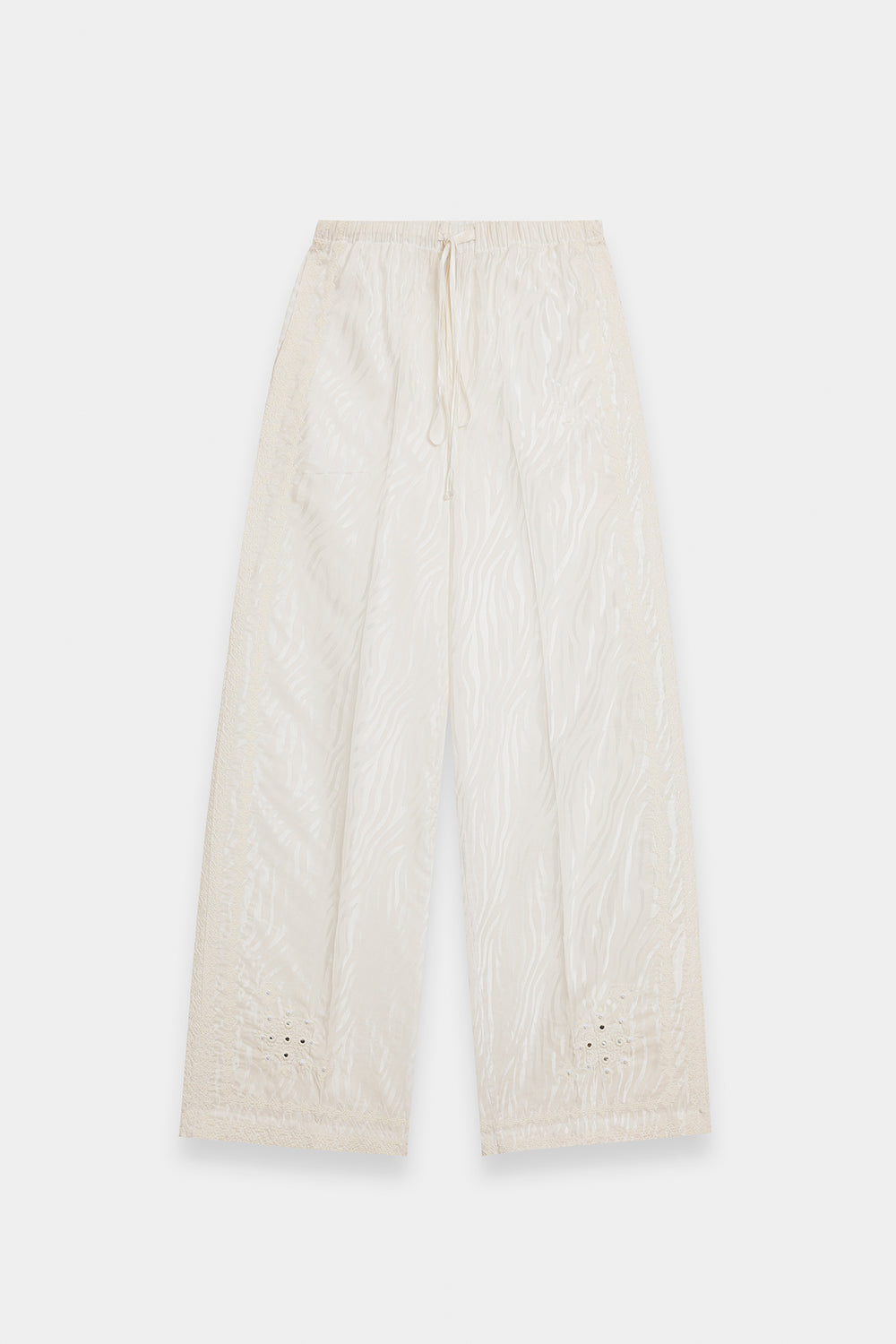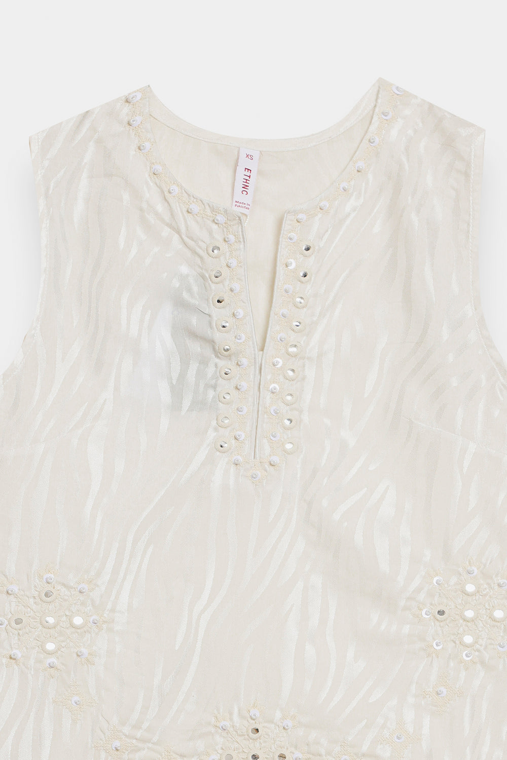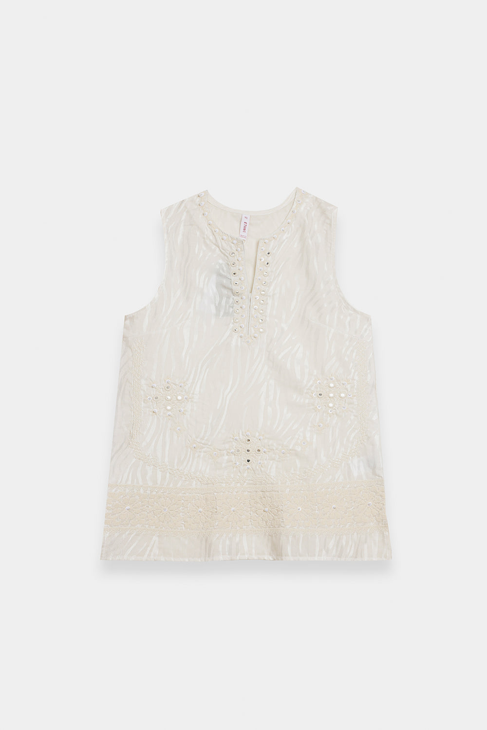 Radiate a serene and ethereal charm with this ivory-white two-piece suit, featuring a sleeveless shirt and coordinated wide-leg trousers. The shirt is designed with a classic split V-neckline and a straight-cut silhouette, crafted from a lustrous fabric with a subtle tonal striped texture. Intricate white-on-white embroidery in delicate floral and geometric patterns adorns the bodice and a wide horizontal panel along the hemline, creating a sophisticated and airy aesthetic. This ensemble is paired with matching voluminous wide-leg trousers that feature delicate needlework along the ankles to complete the monochromatic, refined look.