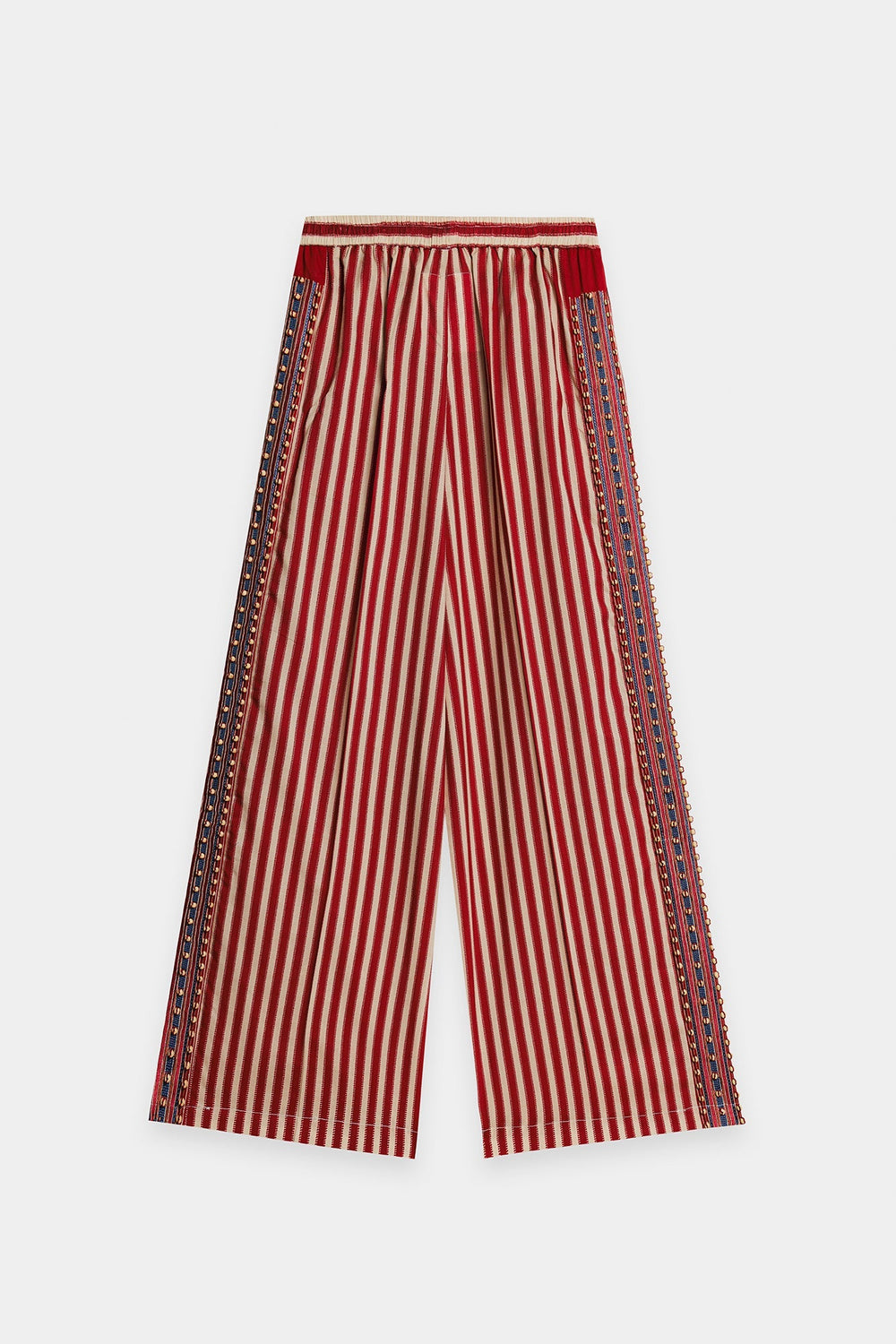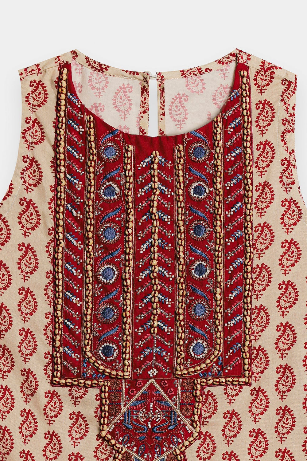 Make a vibrant statement with this beautiful red and white co-ord set. The sleeveless top features an intricate, colorful embroidery and embellishments on the front, creating a striking and artistic pattern. The set is completed with matching striped trousers, designed for a comfortable and fashionable fit. This unique and stylish ensemble is perfect for a special occasion or a festive gathering.