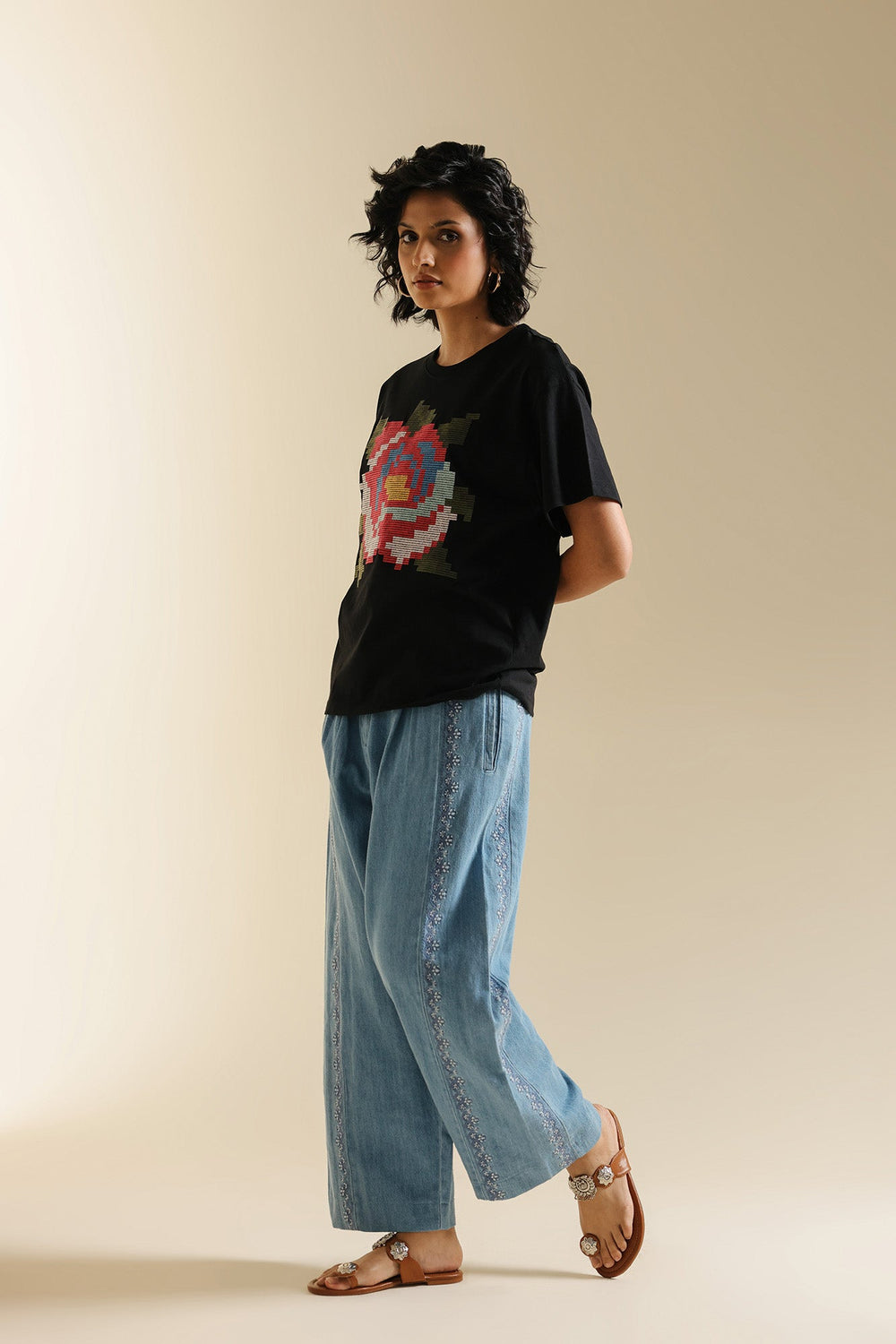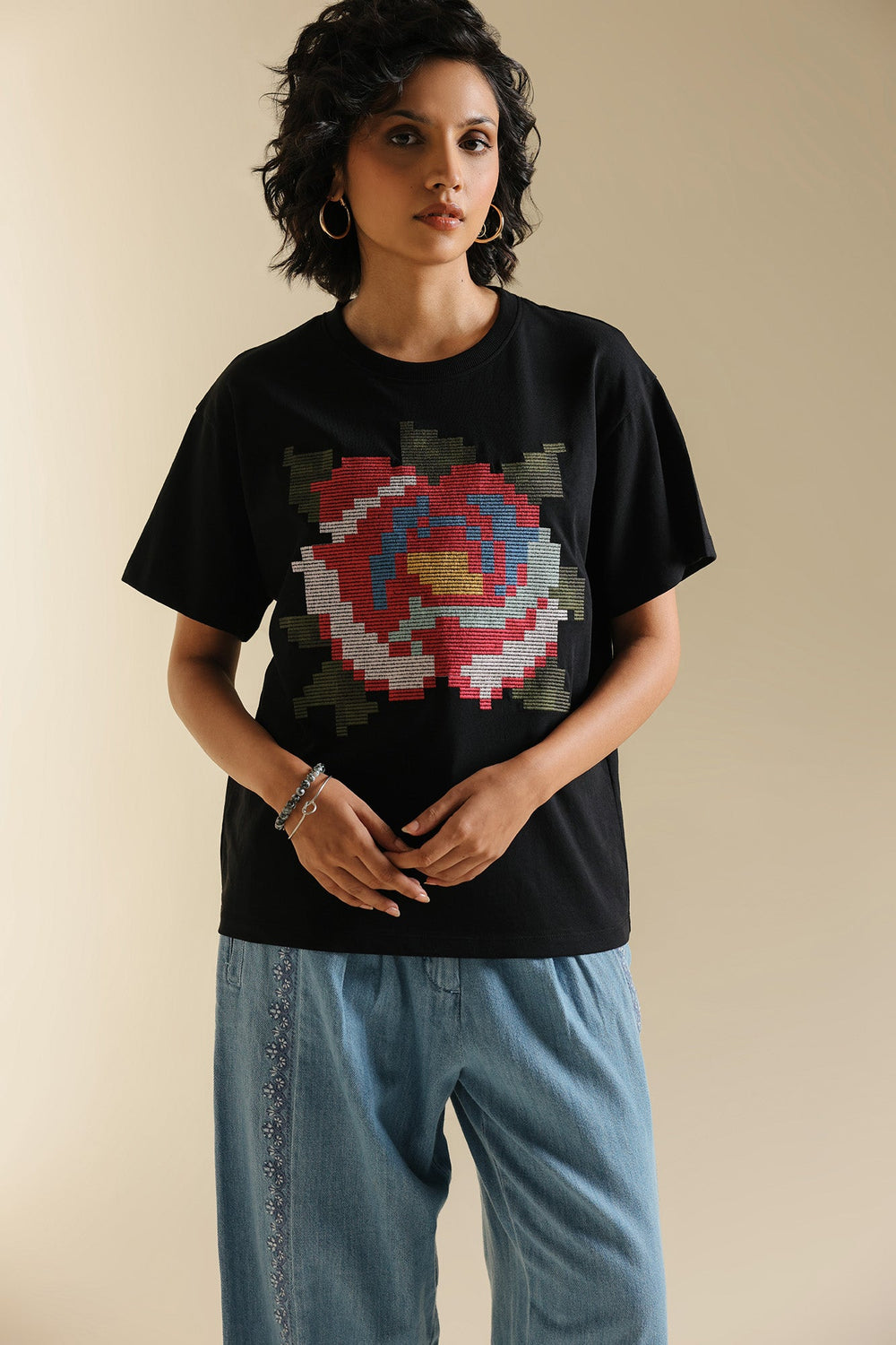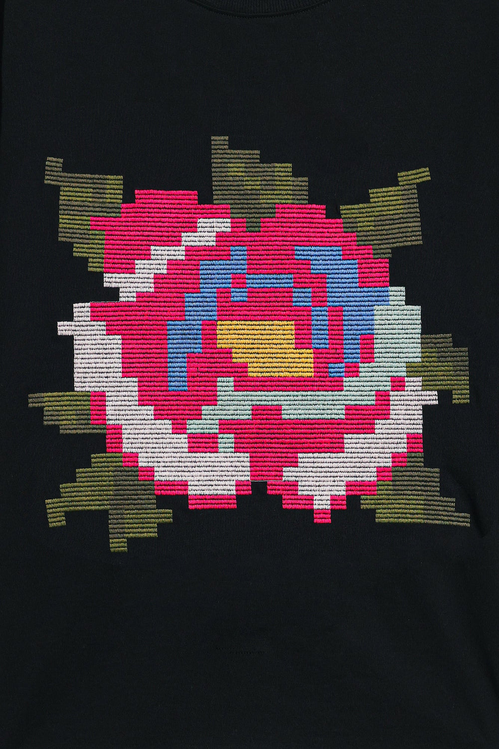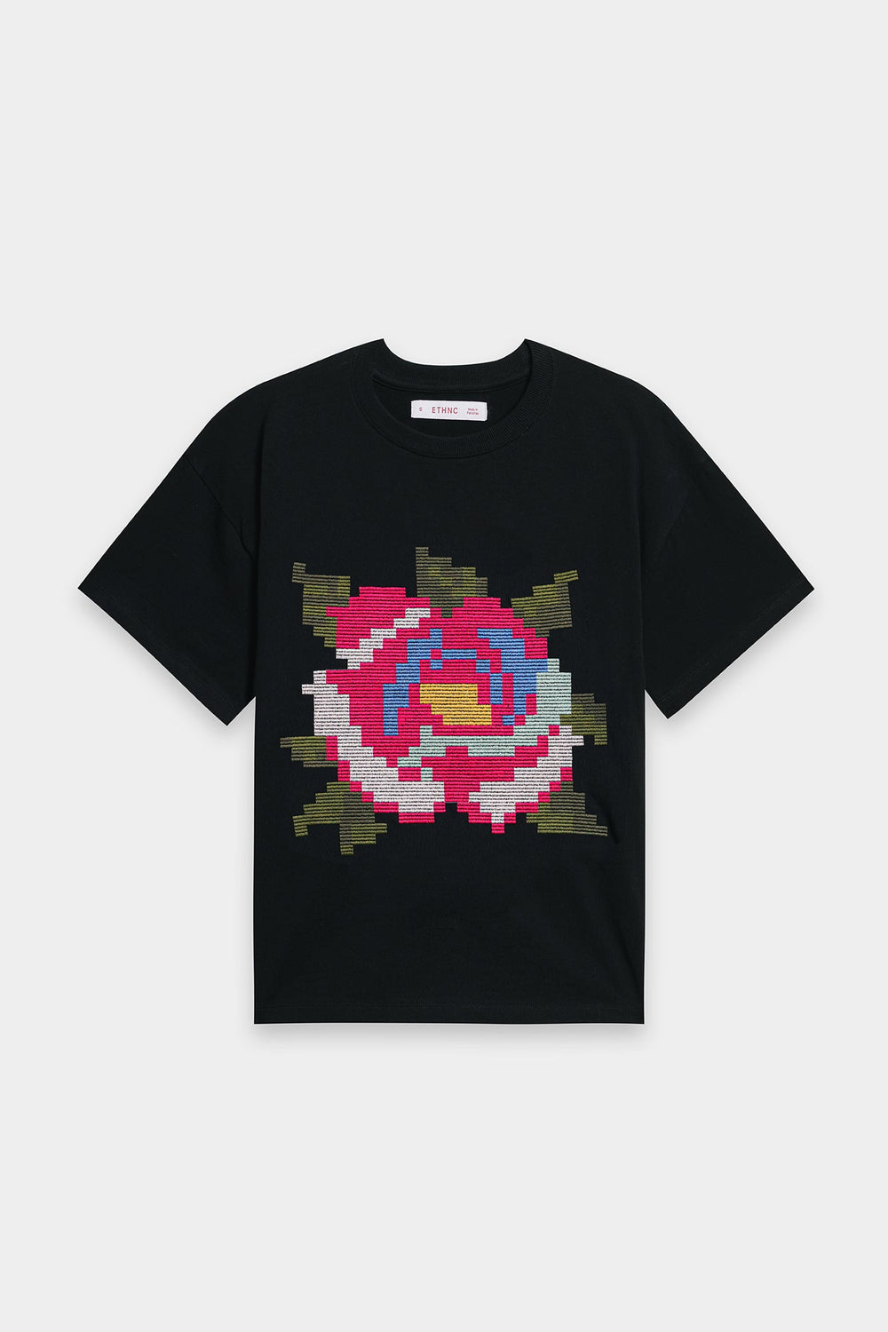 Make a bold artistic statement with this unique black t-shirt, where classic comfort meets captivating design. The relaxed-fit tee features a striking, multi-colored floral motif rendered in a pixelated embroidery style, creating a modern and eye-catching focal point. The vibrant hues of red, blue, green, and white burst against the deep black fabric, making it perfect for adding an artistic edge to your casual wear, or dressing up for a distinctive look.