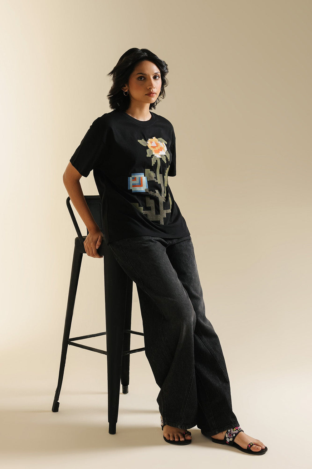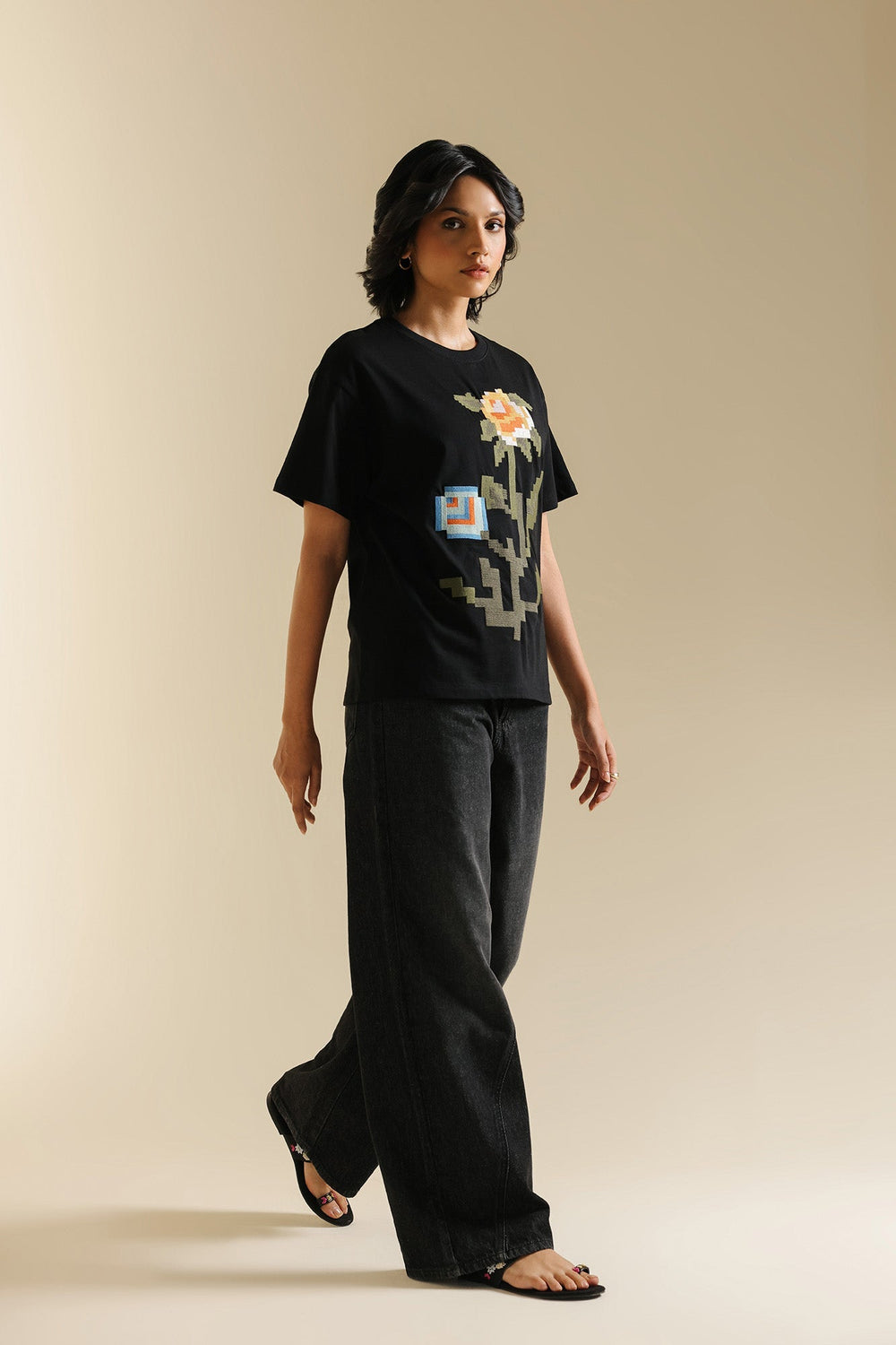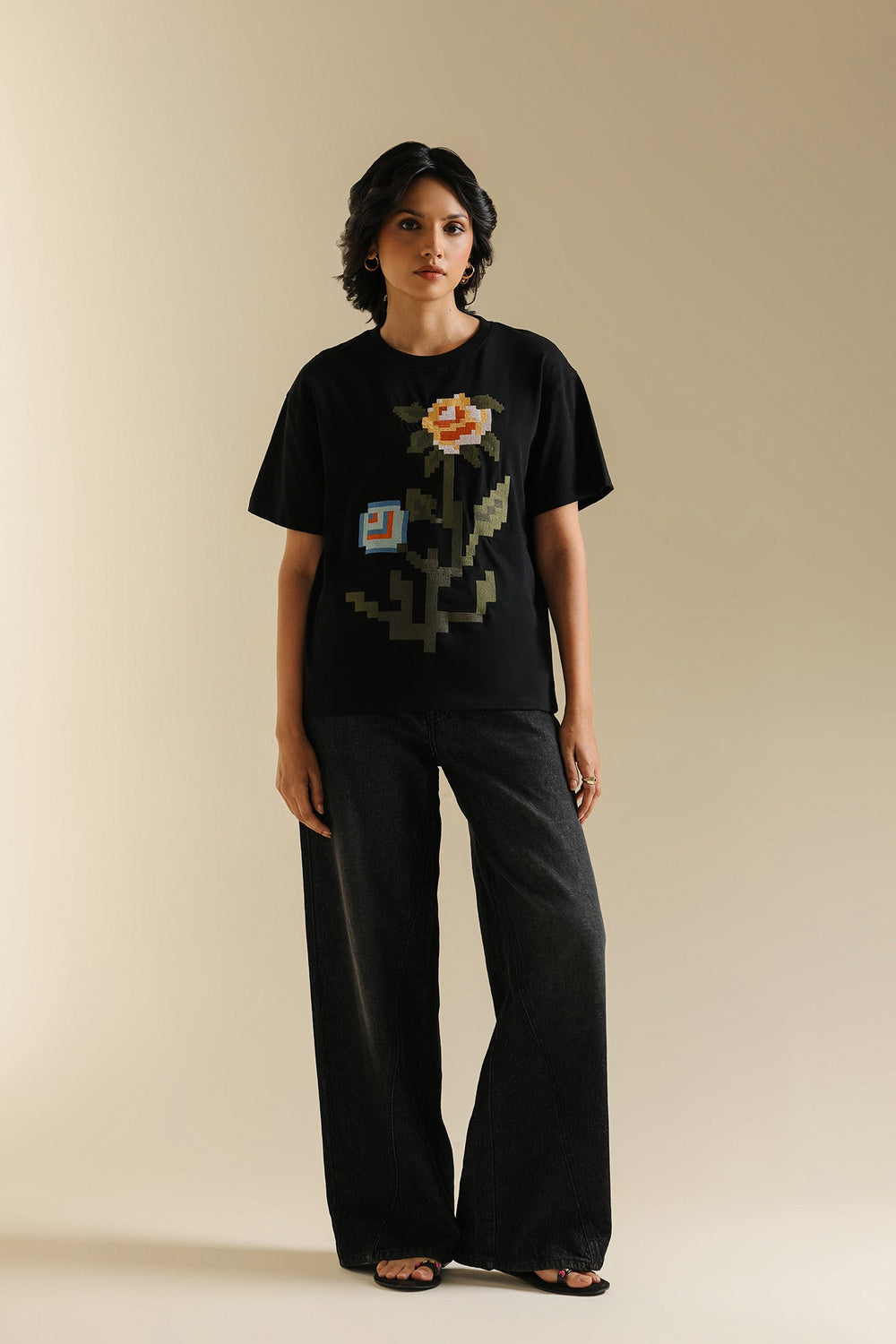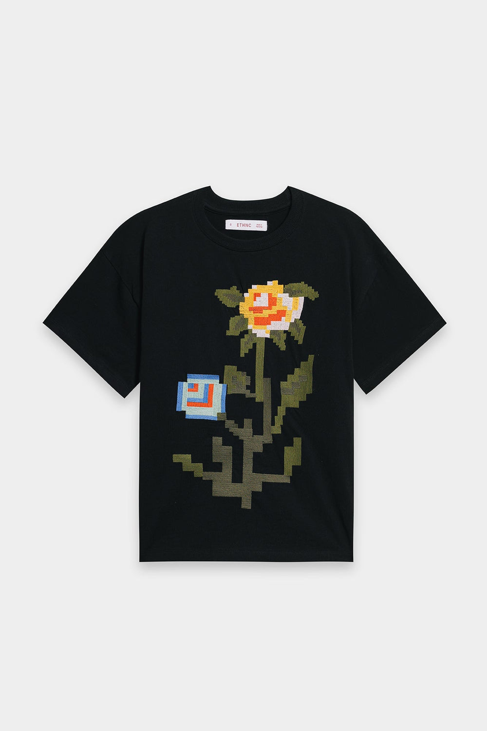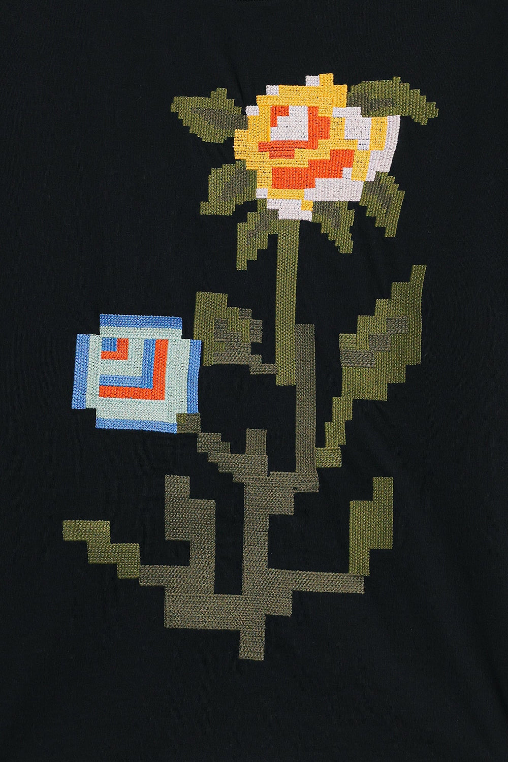 Make a bold artistic statement with this unique black t-shirt, where classic comfort meets captivating design. The relaxed-fit tee features a striking, multi-colored floral motif rendered in a pixelated embroidery style, creating a modern and eye-catching focal point. The vibrant hues of red, blue, green, and yellow burst against the deep black fabric, making it perfect for adding an artistic edge to your casual wear, or dressing up for a distinctive look.