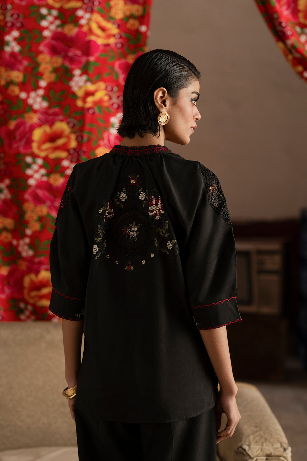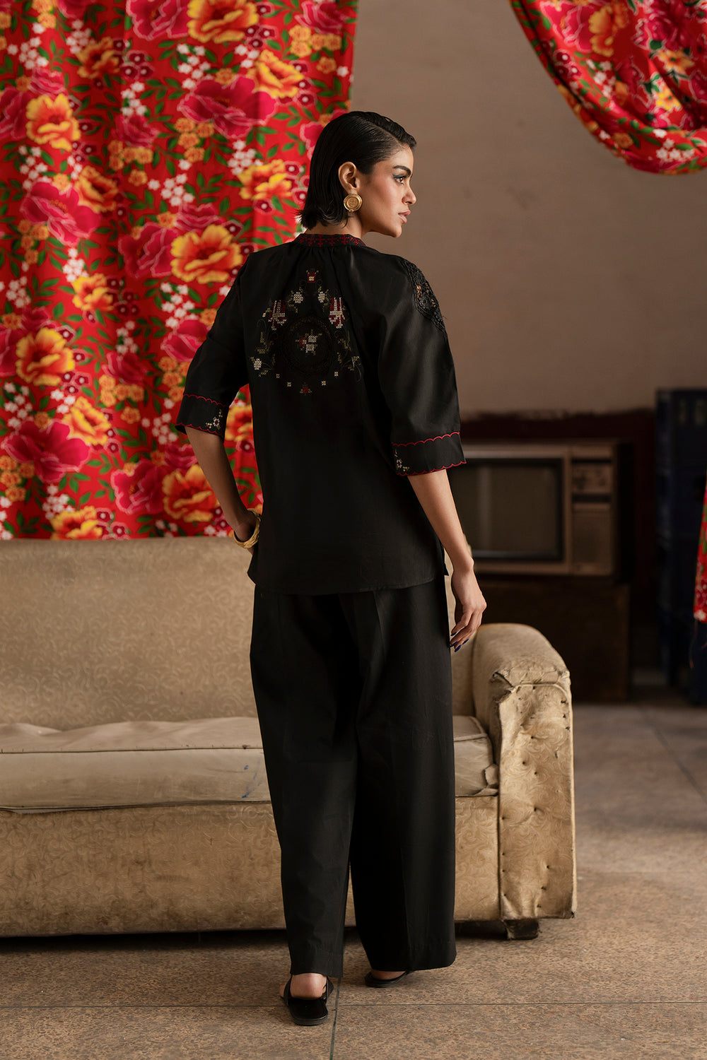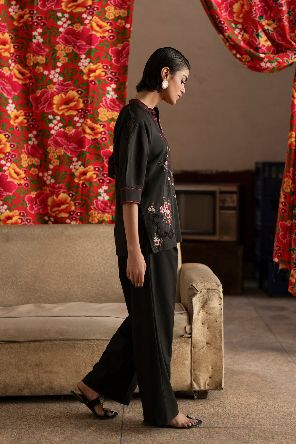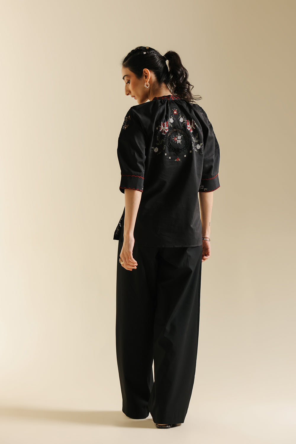 Embrace chic sophistication with this richly embroidered top. This striking kurti-style top is crafted in a solid black fabric and features exquisite multicolored embroidery concentrated beautifully across the yoke. The embroidery includes vibrant shades of red, pink, and green, forming stylized floral and ornamental motifs with a delicate, artisanal feel. The top features a flattering V-neckline with a contrasting red trim and elegant puff sleeves gathered at the elbow. Paired effortlessly with matching black wide-leg trousers this piece is a perfect blend of high-contrast color and timeless craftsmanship.