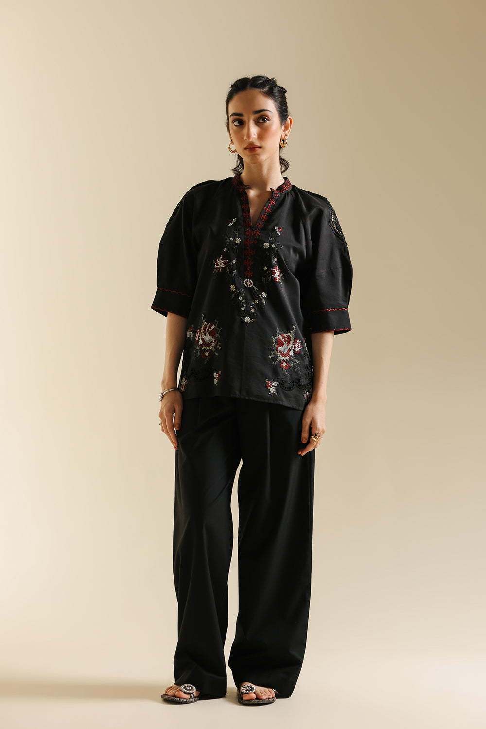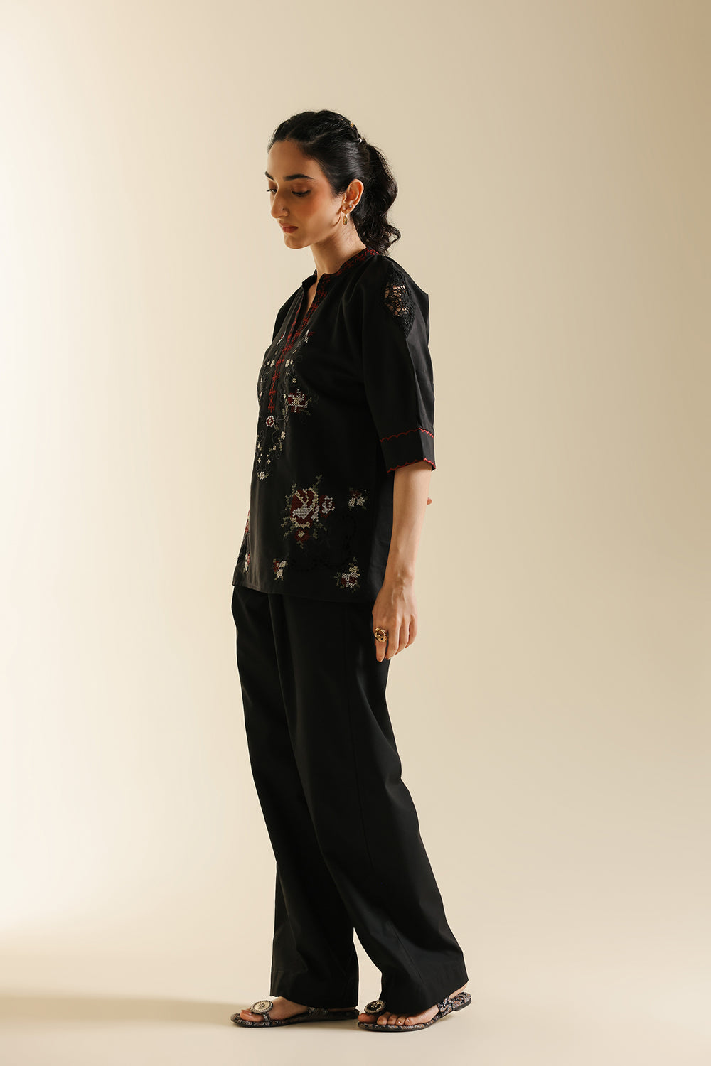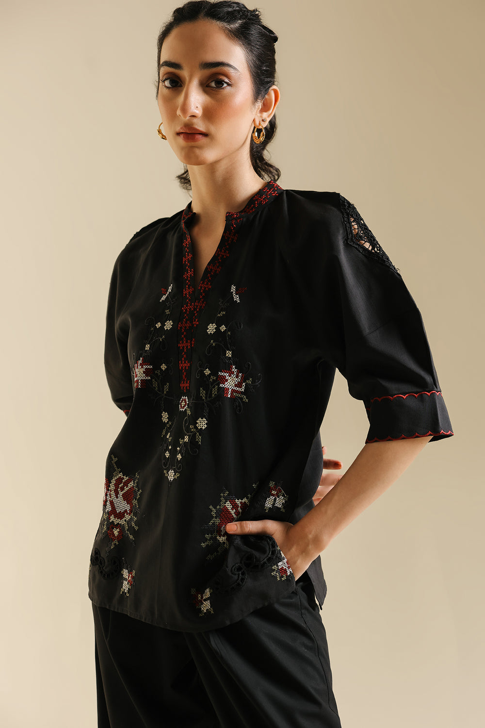 Embrace chic sophistication with this richly embroidered top. This striking kurti-style top is crafted in a solid black fabric and features exquisite multicolored embroidery concentrated beautifully across the yoke. The embroidery includes vibrant shades of red, pink, and green, forming stylized floral and ornamental motifs with a delicate, artisanal feel. The top features a flattering V-neckline with a contrasting red trim and elegant puff sleeves gathered at the elbow. Paired effortlessly with matching black wide-leg trousers this piece is a perfect blend of high-contrast color and timeless craftsmanship.