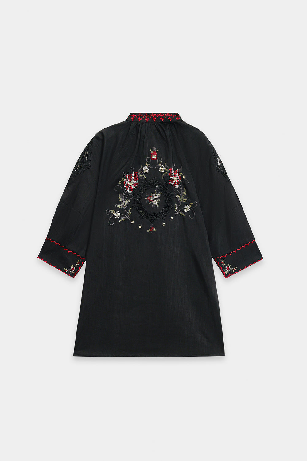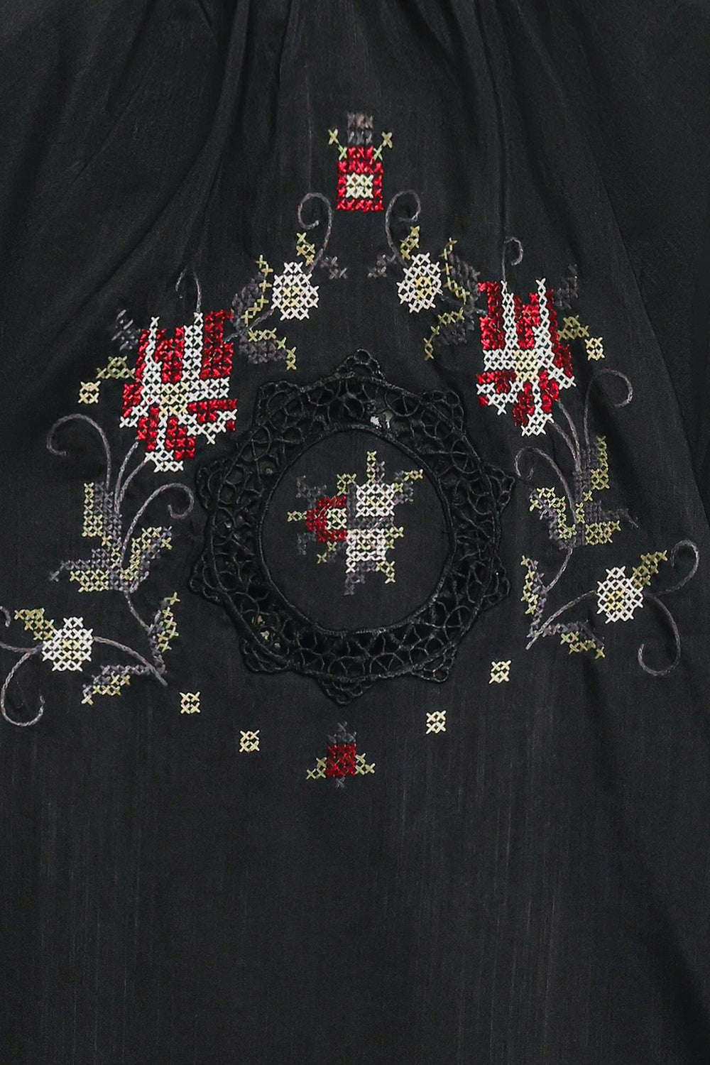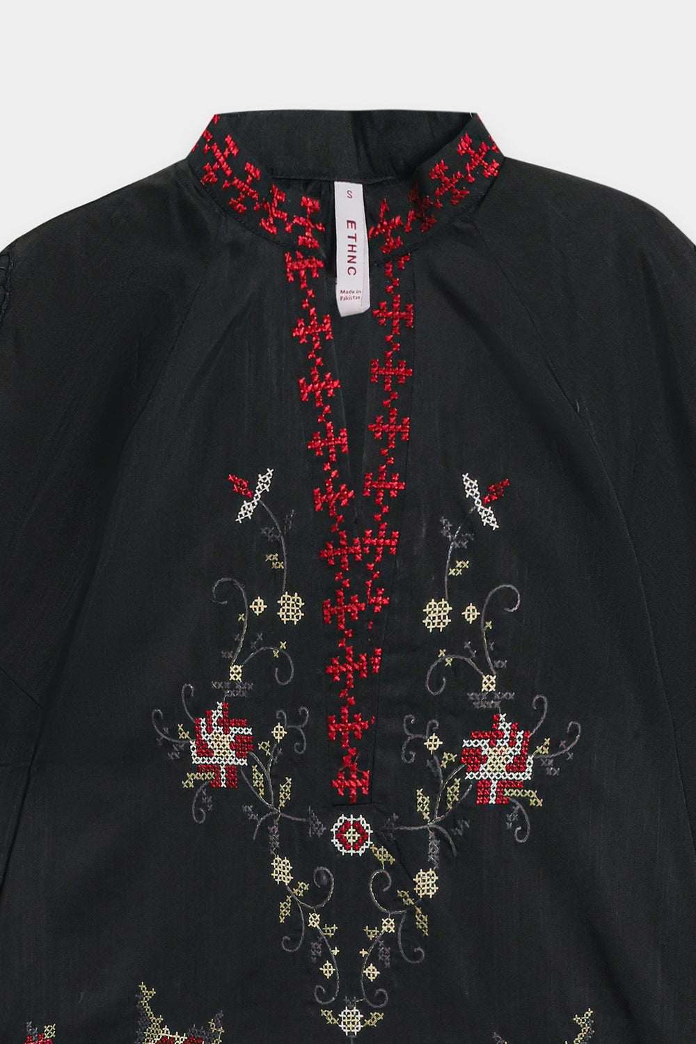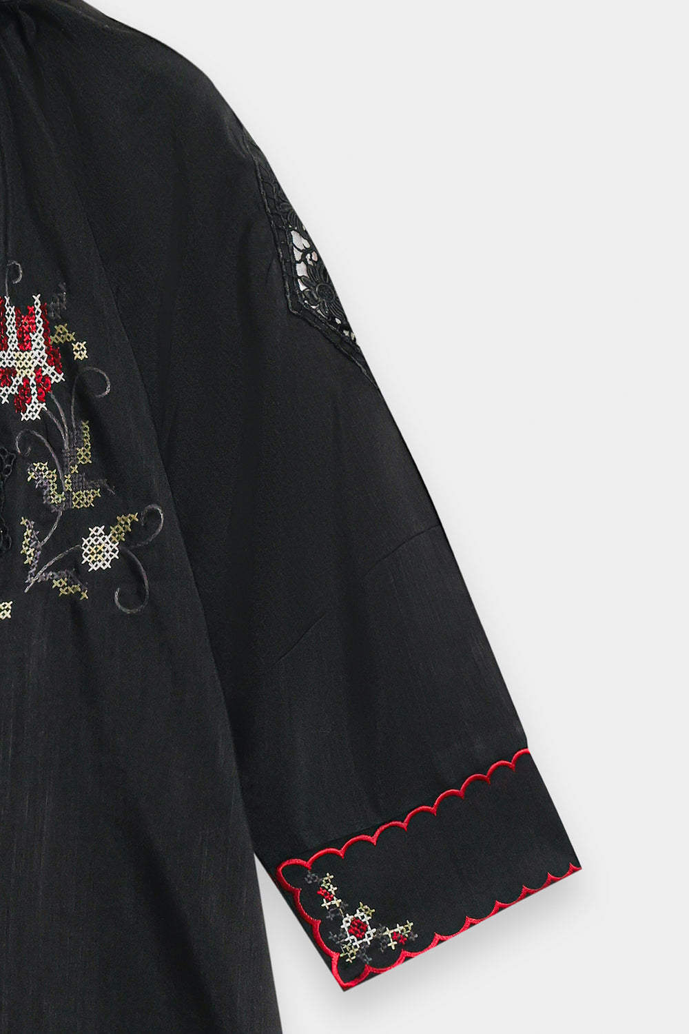Embrace chic sophistication with this richly embroidered top. This striking kurti-style top is crafted in a solid black fabric and features exquisite multicolored embroidery concentrated beautifully across the yoke. The embroidery includes vibrant shades of red, pink, and green, forming stylized floral and ornamental motifs with a delicate, artisanal feel. The top features a flattering V-neckline with a contrasting red trim and elegant puff sleeves gathered at the elbow. Paired effortlessly with matching black wide-leg trousers this piece is a perfect blend of high-contrast color and timeless craftsmanship.