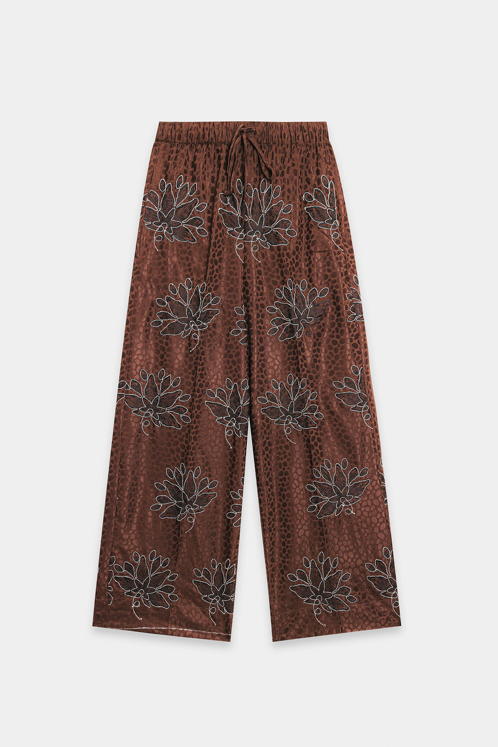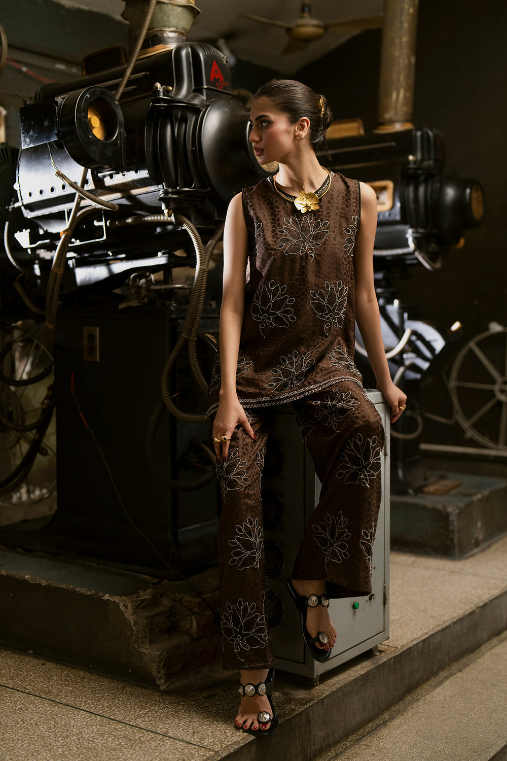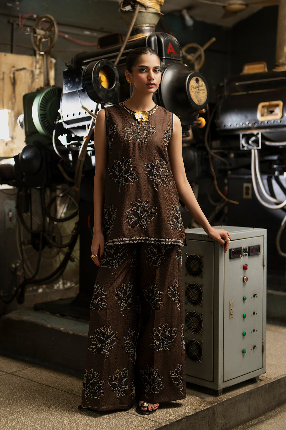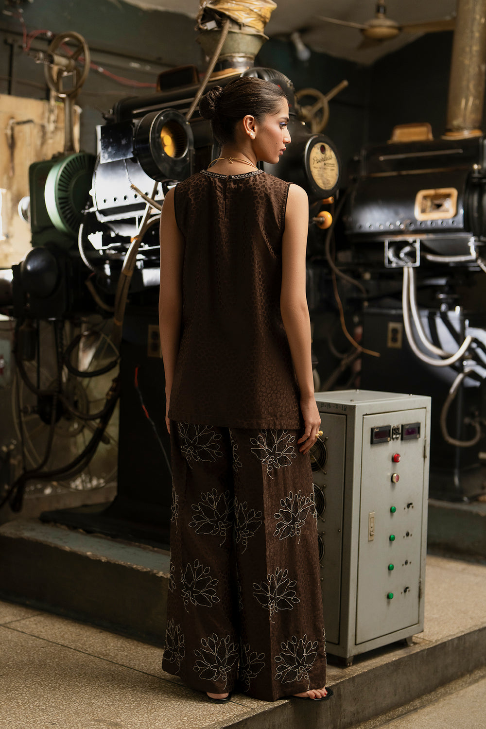 Drape yourself in earthy luxury with this beautifully textured embroidered set. This chic two-piece ensemble features a sleeveless, short-length top and coordinating wide-leg trouser, both crafted from a dark olive fabric with a subtle, all-over jacquard self-print. The top and trouser are adorned with bold white outline embroidery forming large, stylized lotus flower motifs, adding striking contrast and visual interest. The neckline of the top is further embellished with delicate beadwork. This suit is a modern statement piece, perfectly blending exotic print, sophisticated color, and graphic floral artistry.