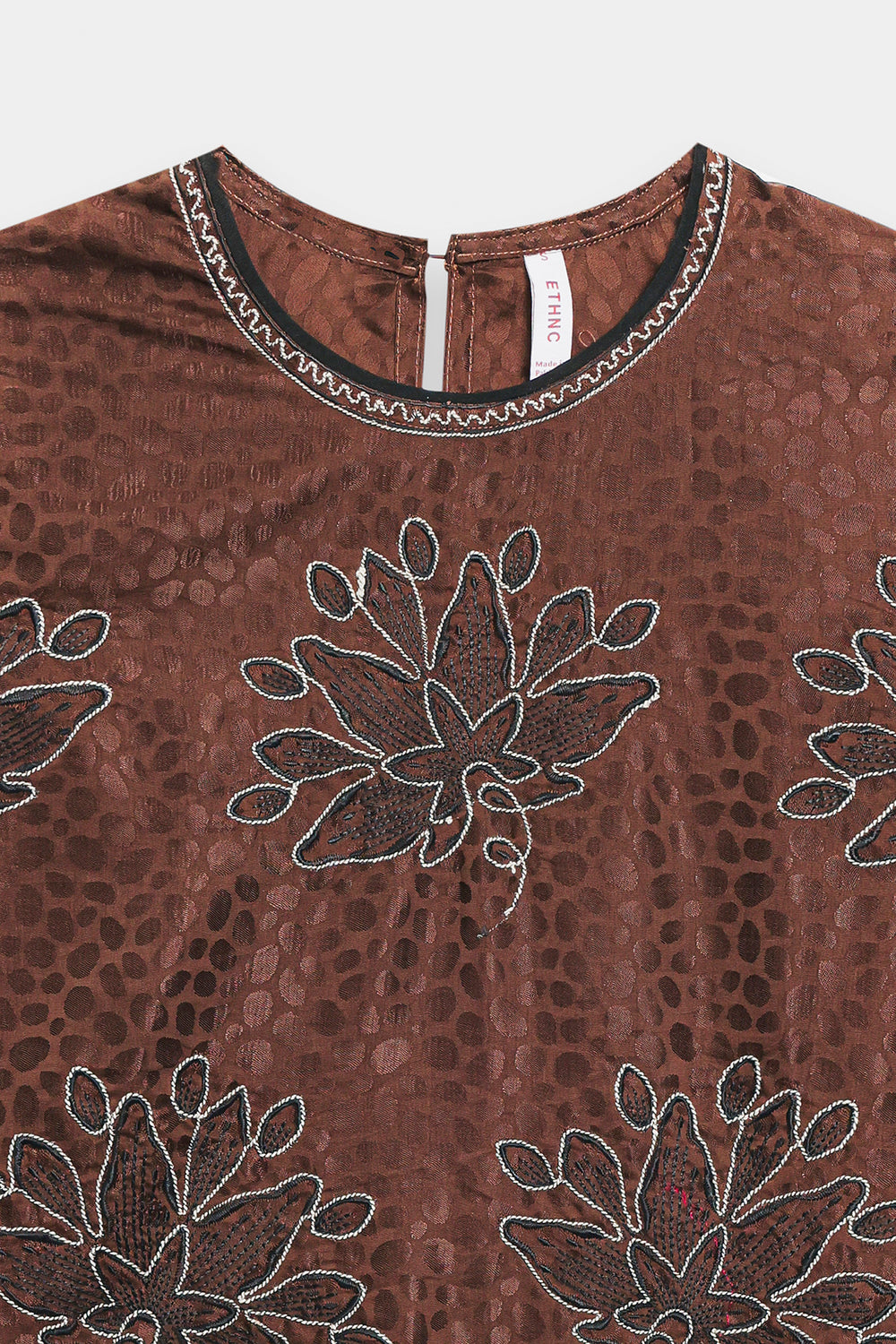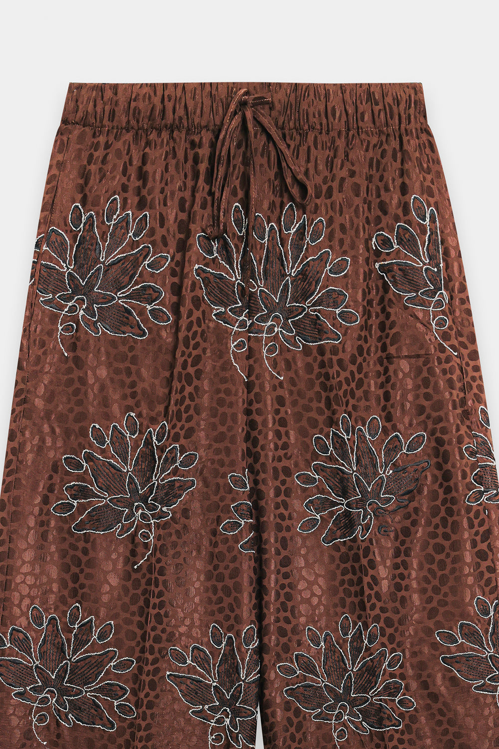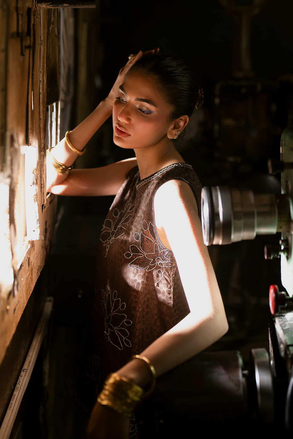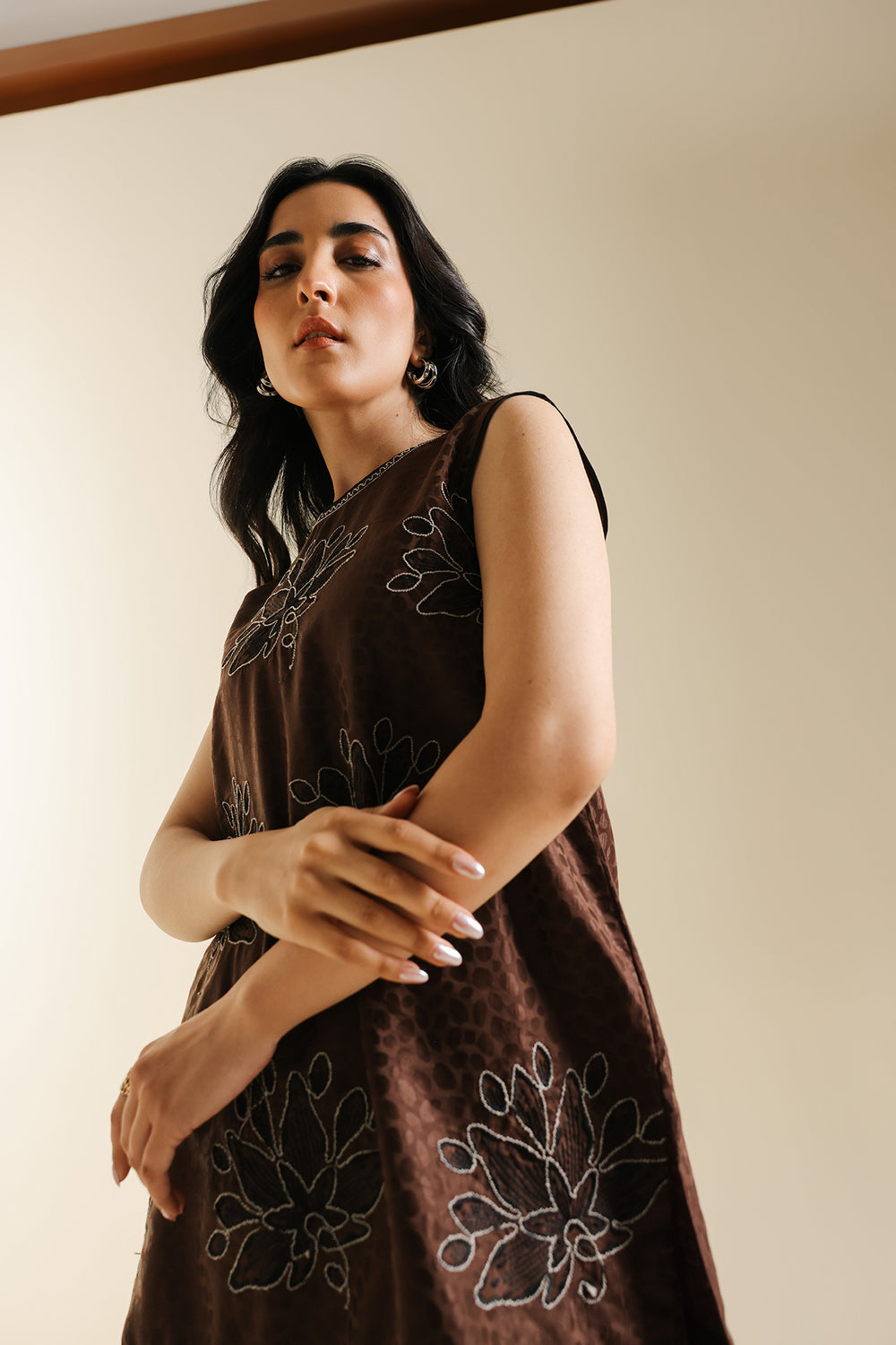 Drape yourself in earthy luxury with this beautifully textured embroidered set. This chic two-piece ensemble features a sleeveless, short-length top and coordinating wide-leg trouser, both crafted from a dark olive fabric with a subtle, all-over jacquard self-print. The top and trouser are adorned with bold white outline embroidery forming large, stylized lotus flower motifs, adding striking contrast and visual interest. The neckline of the top is further embellished with delicate beadwork. This suit is a modern statement piece, perfectly blending exotic print, sophisticated color, and graphic floral artistry.
