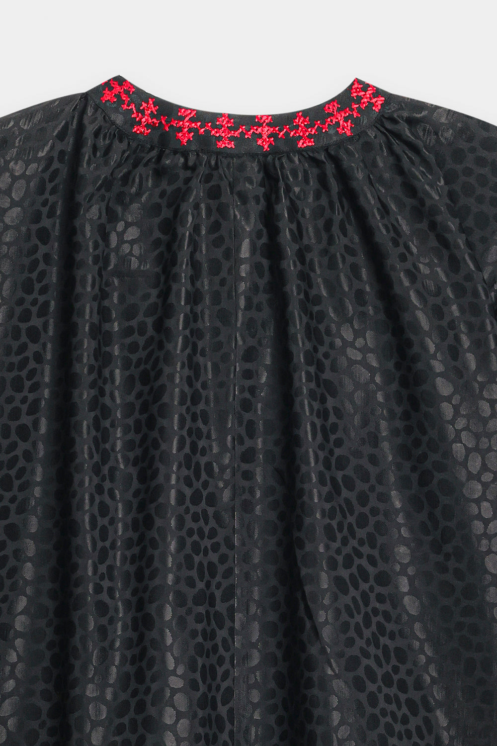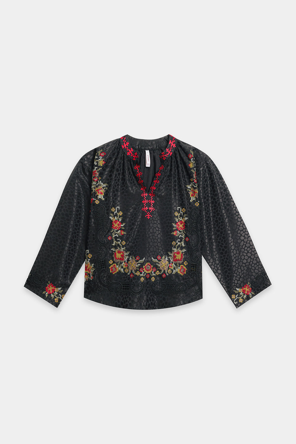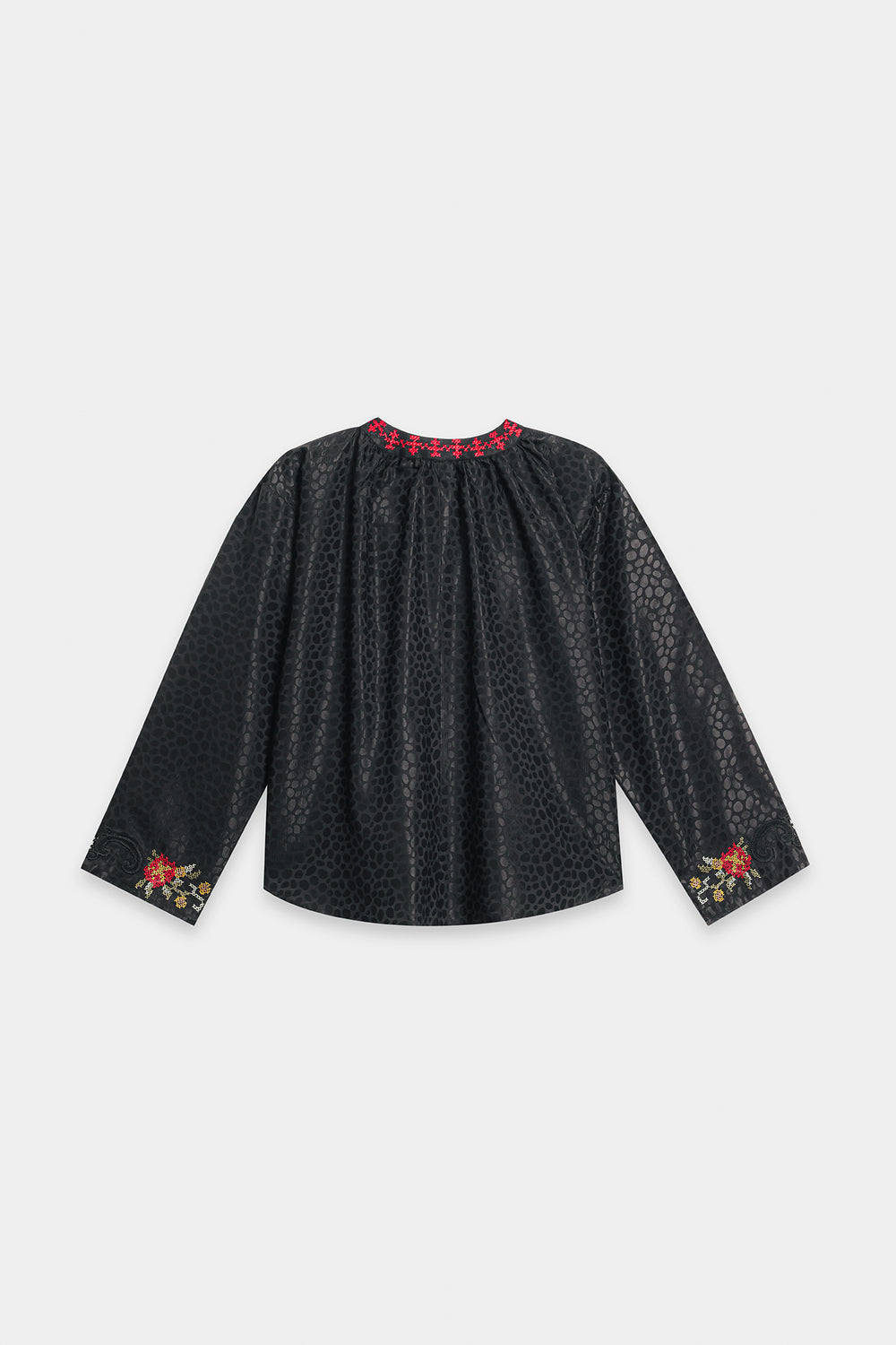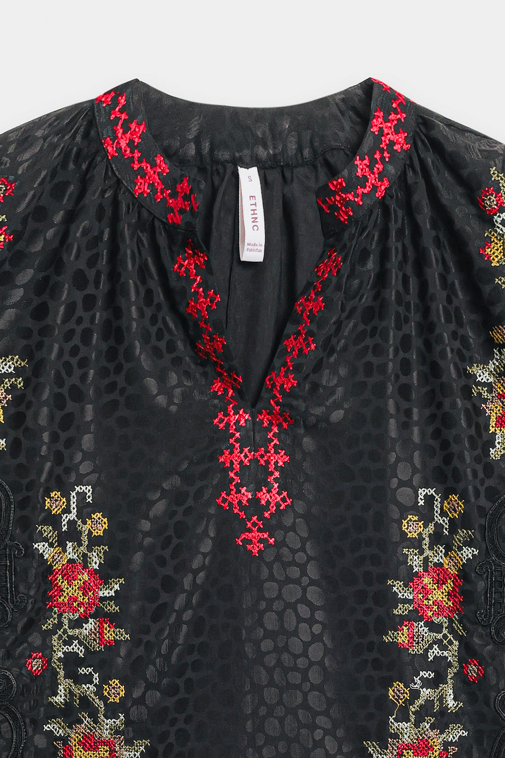 Embrace rich color and texture with this stunning black embroidered top. This sophisticated shirt is crafted from a refined black fabric that features a subtle, self-textured pattern, a small leopard design. The top is beautifully adorned with intricate multi-colored floral embroidery across the chest, featuring vibrant red and earthy tones that pop against the dark background. With its flowing, tunic-like fit, V-neckline, and comfortable full-length sleeves, this piece offers a perfect balance of comfort and traditional elegance.